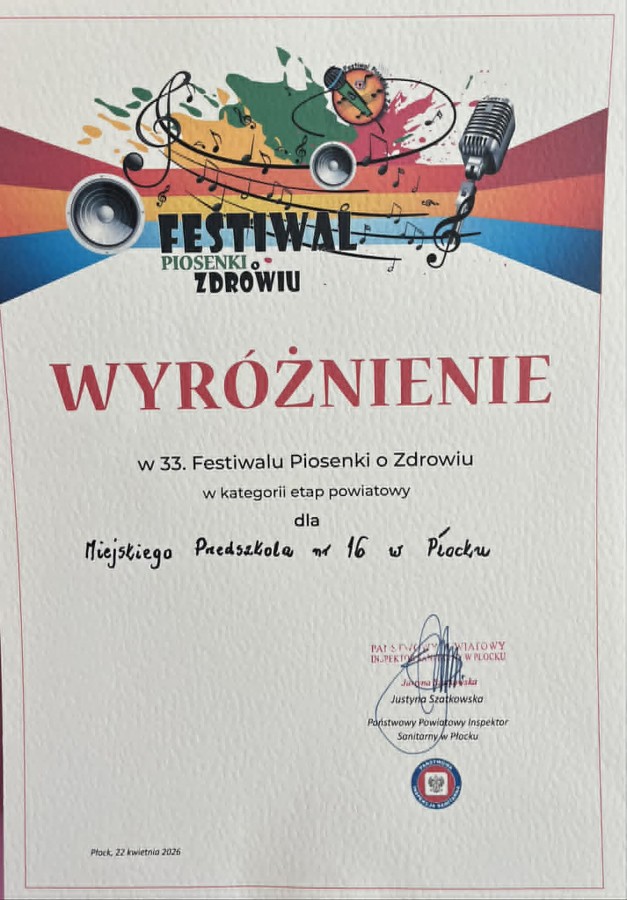 Maja, Basia, Nikola i Antoś z gr Zające reprezentowali nasze przedszkole w Festiwalu Piosenki o Zdrowiu zorganizowanym przez Powiatową Stację Sanitarno - Epidemiologiczną w Płocku. Celem festiwalu było promowanie zdrowego stylu życia. Dzieci zaprezentowały piosenkę pt. „Zdrowym być” i dostały wyróżnienie. Gratulujemy