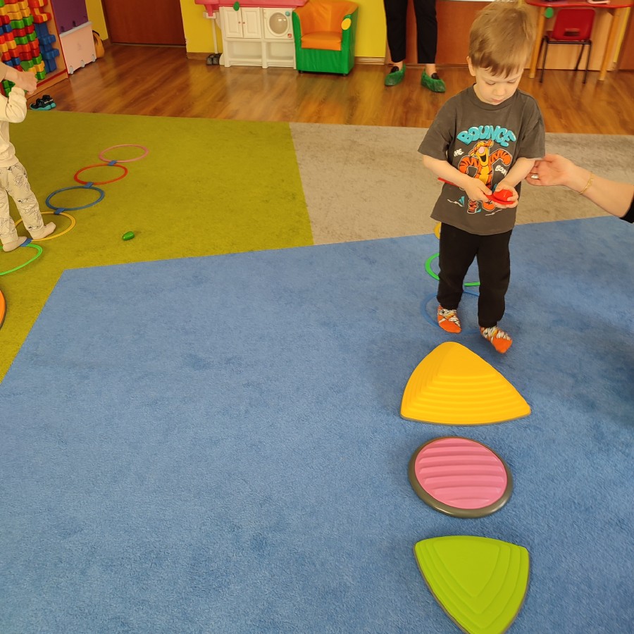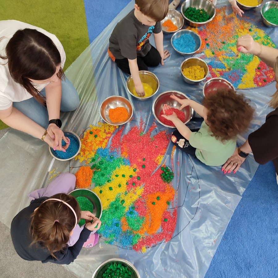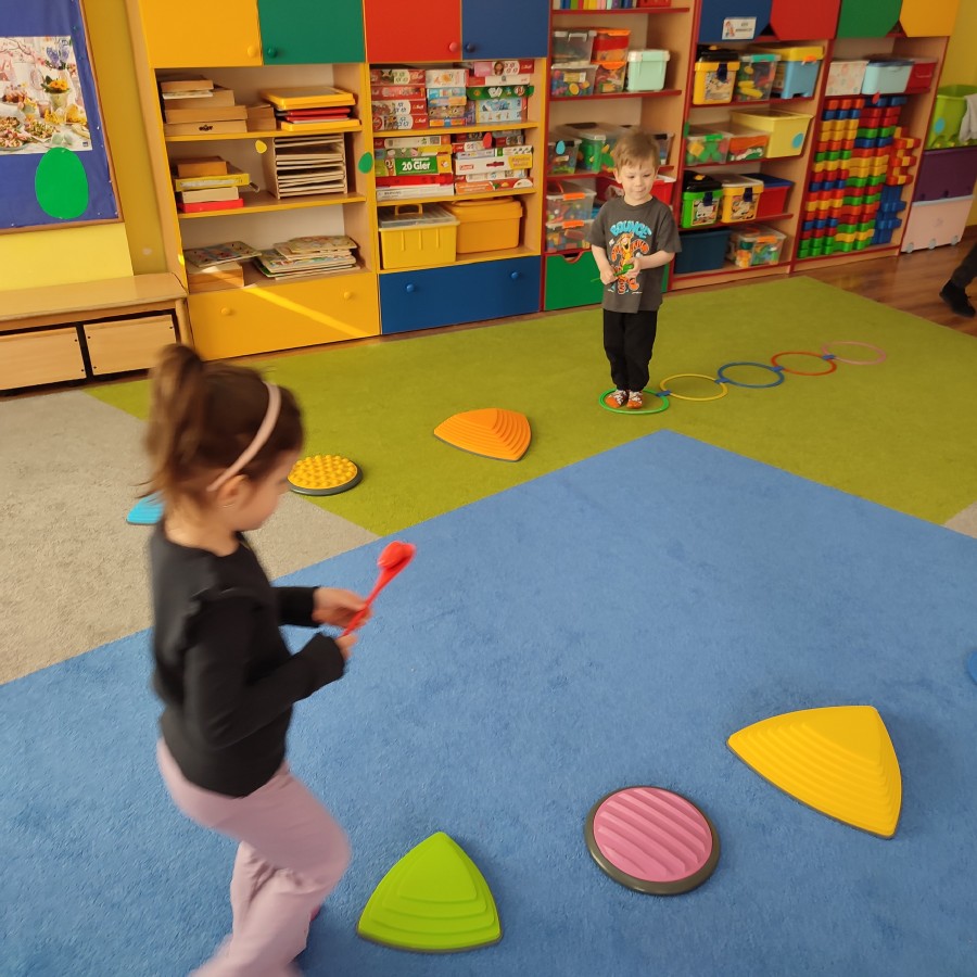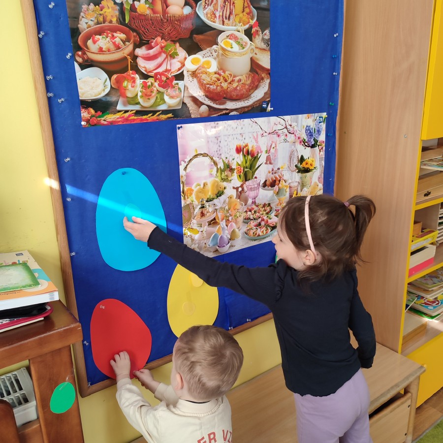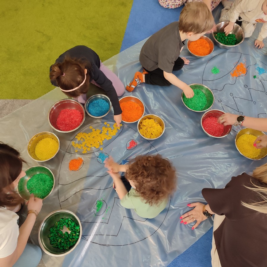 Na naszych ostatnich zajęciach z cyklu "Sensoczwartków" wprowadziliśmy dzieci w radosny, wielkanocny klimat. Spotkanie obfitowało w różnorodne aktywności sensoryczne i kreatywne zabawy. Dzieci z ogromnym zaangażowaniem uczestniczyły w poszukiwaniu ukrytych jajek, a także pokonywały sensoryczny tor z pisankami, który dostarczył wielu wrażeń dotykowych i ruchowych.