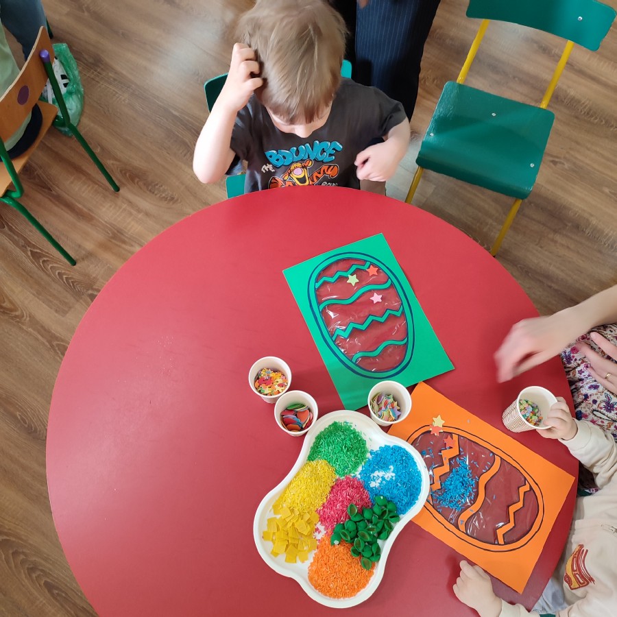 Nie zabrakło również działań plastycznych – uczestnicy ozdabiali pisanki przy użyciu kolorowego ryżu oraz makaronu, rozwijając swoją wyobraźnię i zdolności manualne. Dużym zainteresowaniem cieszyło się także tworzenie witrażowych jajek z różnorodnymi, ciekawymi w dotyku materiałami.