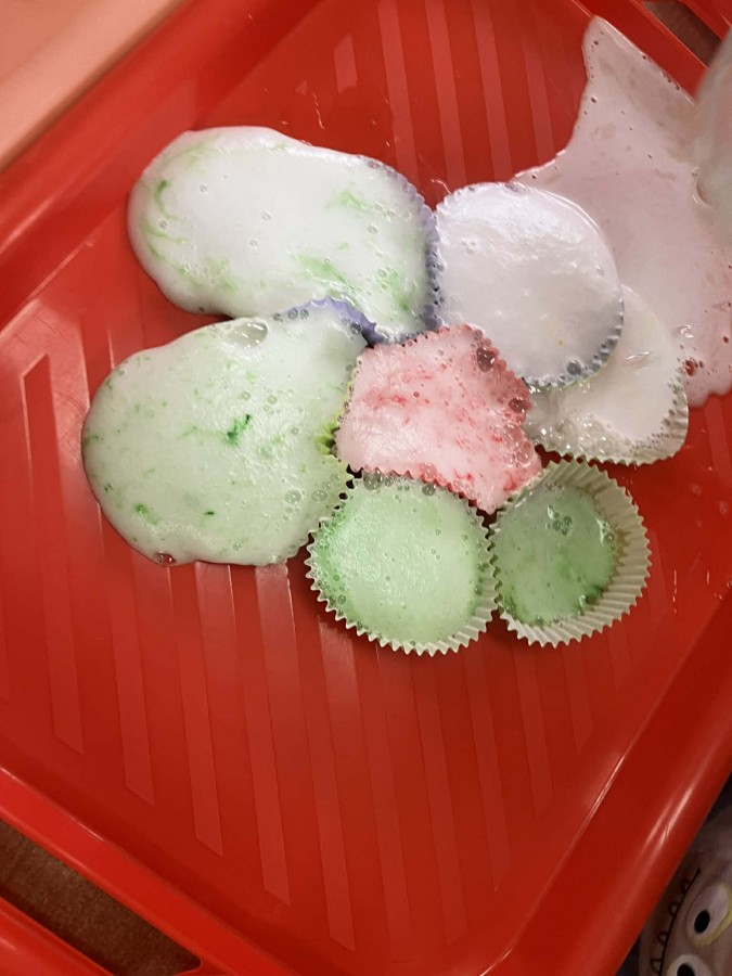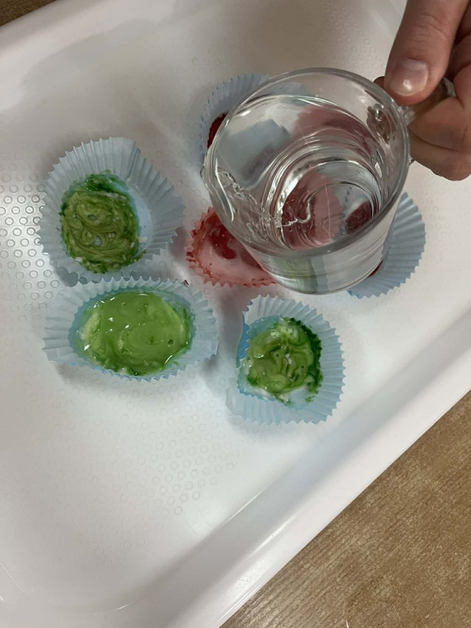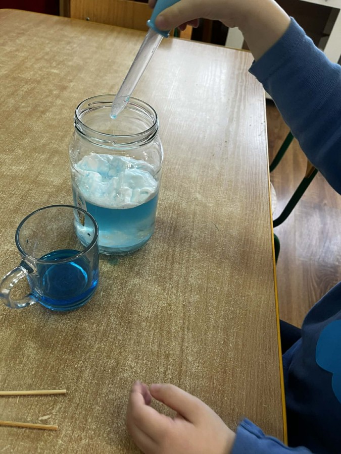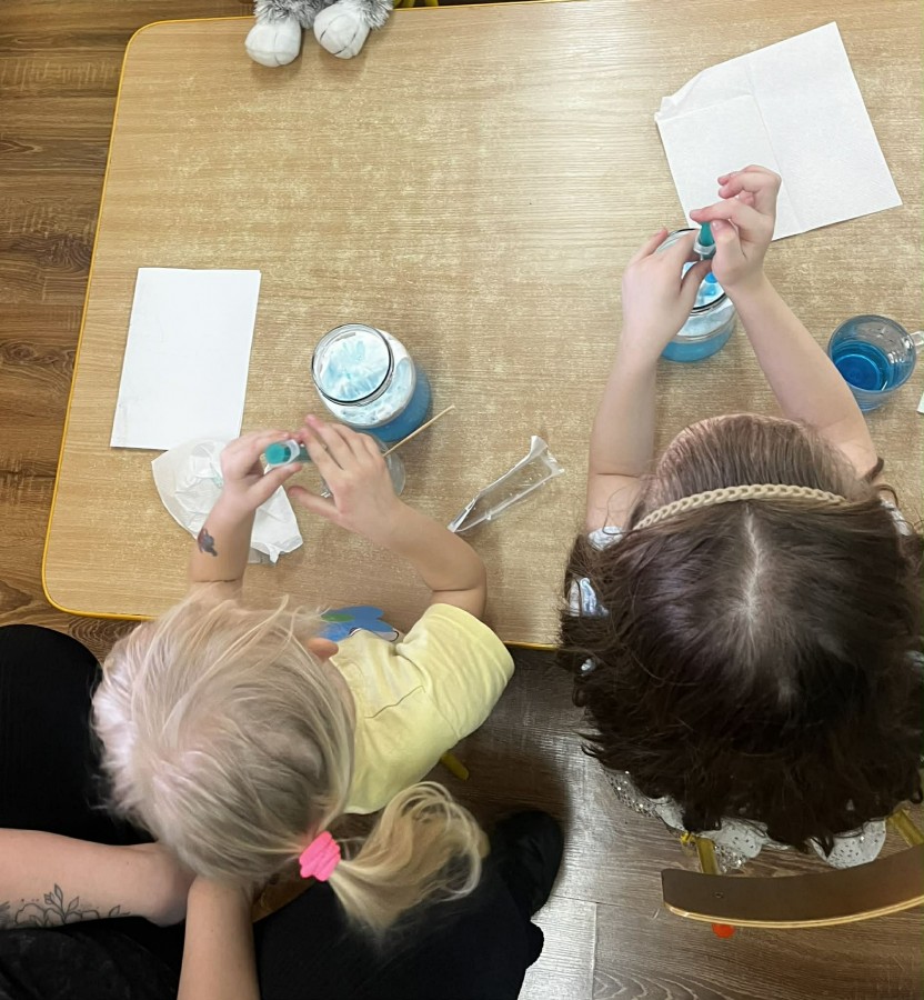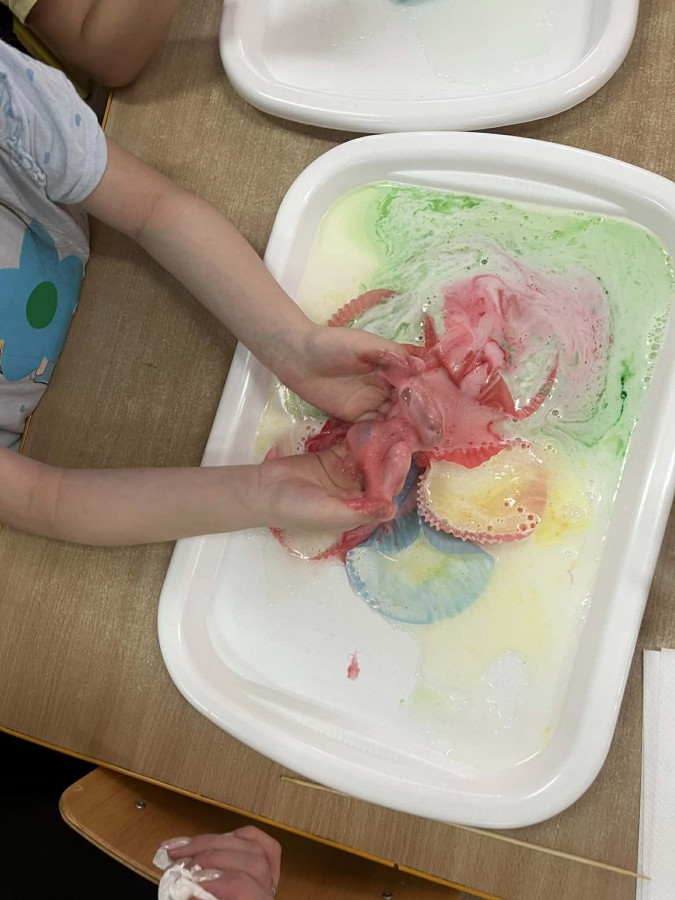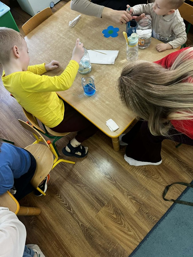 Na początku zajęć dzieci wraz z rodzicami rozmawiały o oznakach wiosny. Następnie przeszły do części praktycznej, podczas której uczestnicy wykonywali różnorodne eksperymenty i działania sensoryczne. Dzieci wspólnie z rodzicami mieli możliwość swobodnego działania, rozwijania wyobraźni oraz współpracy. Wspólne eksperymenty sprzyjały integracji, budowaniu relacji oraz wzmacnianiu poczucia sprawczości u dzieci.