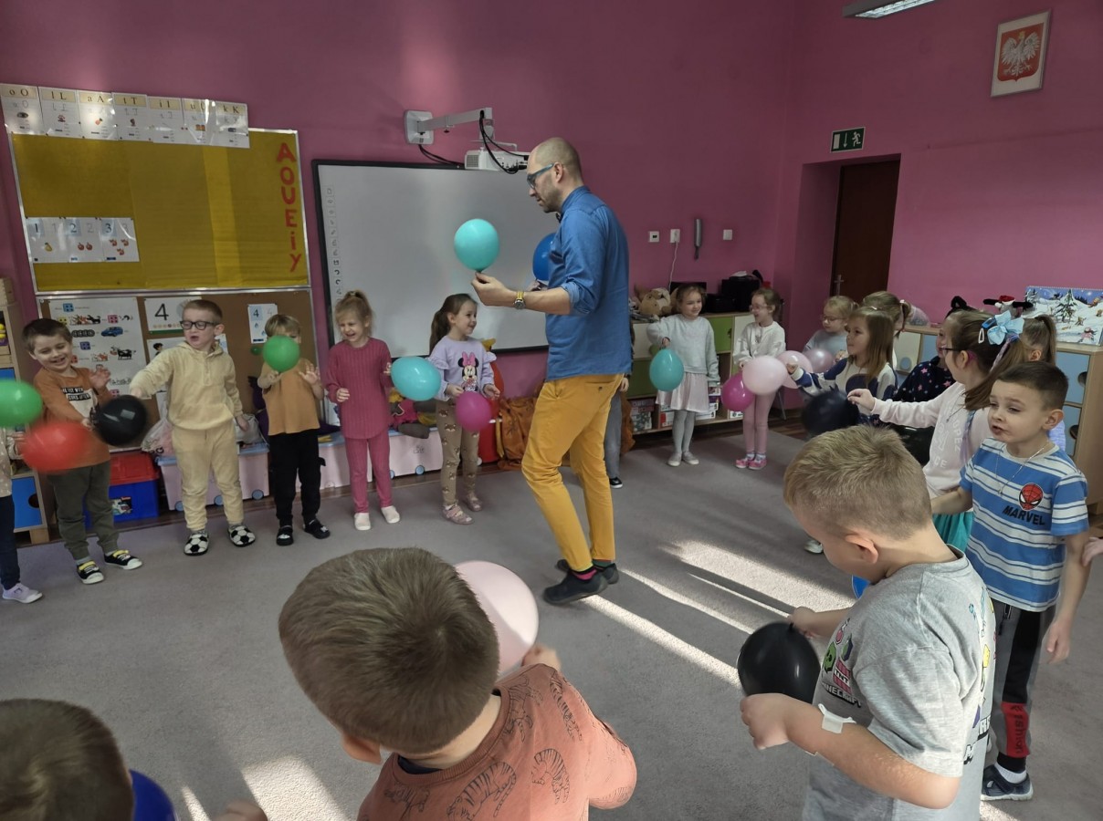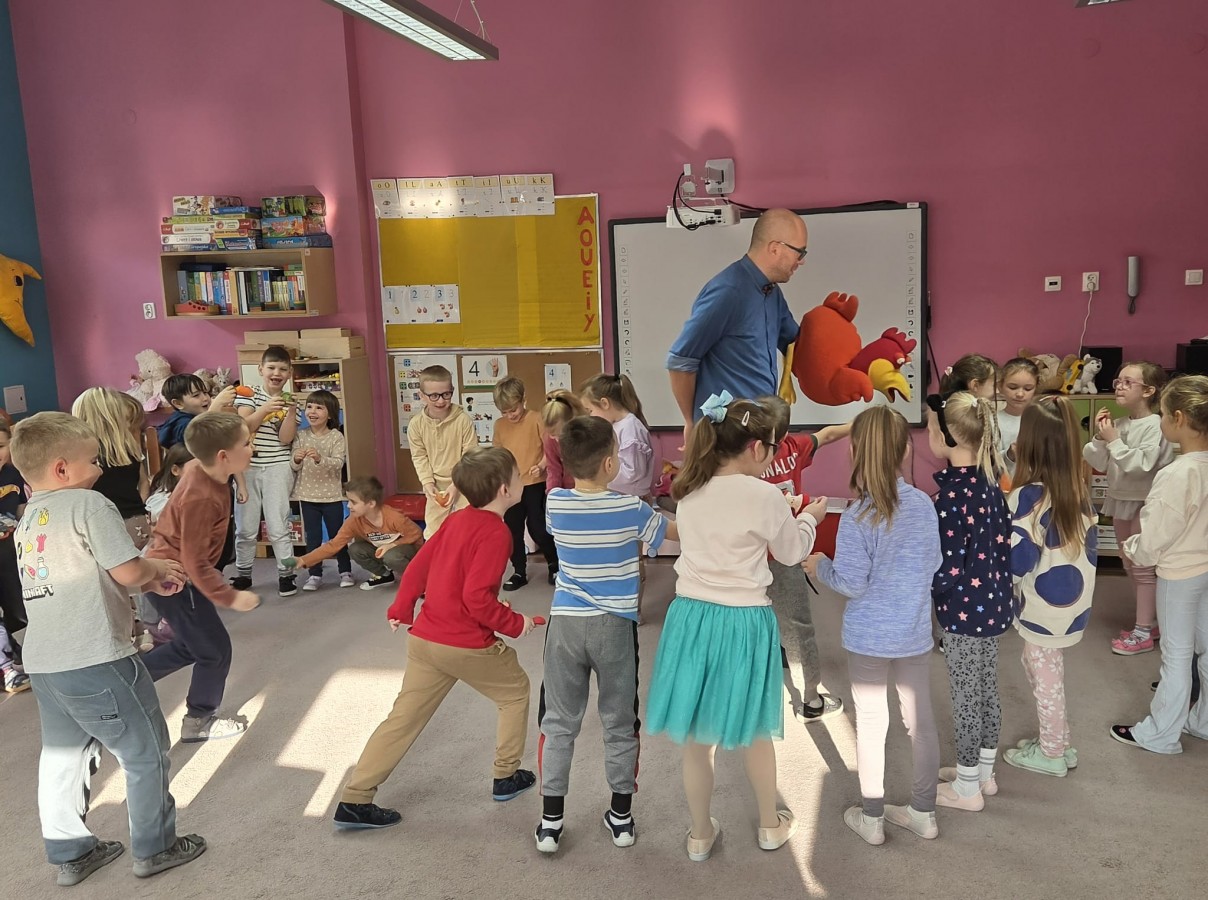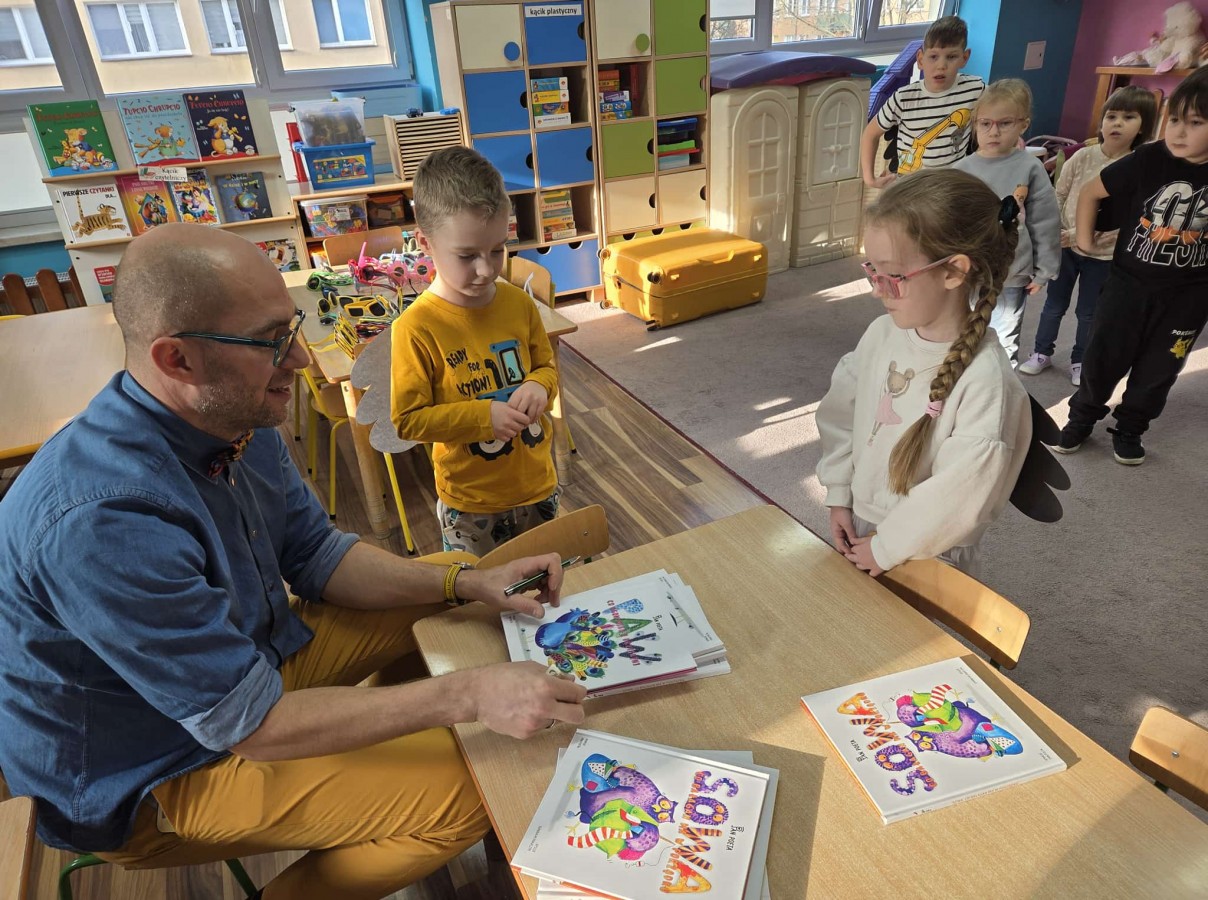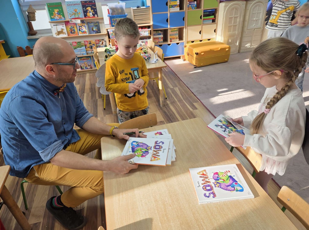 28 listopada w naszym przedszkolu odbyło się niezwykle spotkanie w ramach realizacji Narodowego Programu Czytelnictwa, w którym udział brały dwie najstarsze grupy - Zające i Jeżyki. Dzieci miały okazję uczestniczyć w autorskim spotkaniu z Panem Poetą - autorem zabawnych, a jednocześnie edukacyjnych książek dla dzieci. Pan Poeta w bardzo niekonwencjonalny sposób zaprezentował swój dorobek pisarski, na który składają się książki dla dzieci: "Kura co tyła na diecie", "Kruk co kracze pokrakanie", "Kaczka co przebrała miarkę", "Paw co ogon miał z przyjaźni". W prowadzeniu spotkania pomagały poecie ogromne pacynki przedstawiające postacie z wierszy. Były zabawy, karmienie Kury, pióra przyjaźni, falujące morze z mnóstwem kolorowych balonów. Wiele radości sprawiło dzieciom przebieranie się w rzeczy, w które przebiera się bohaterka książki Pana Poety Kaczka. Spotkanie było niezwykłą podrożą do świata książek w bardzo barwny i aktywizujący dzieci sposób. A po spotkaniu w naszych przedszkolnych biblioteczkach zagościły książki Pana Poety z osobistymi autografami. To spotkanie na długo zostanie we wspomnieniach naszych przedszkolaków, a przypominać o nim będą czytane przez nas utwory Pana Poety. Bajki edukacyjne Pana Michała zostały wyróżnione na Złotej Liście Fundacji ABC XXI „Cała Polska Czyta Dzieciom” w 2021 roku.