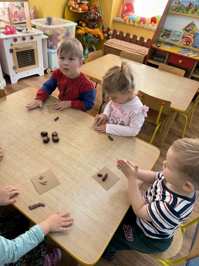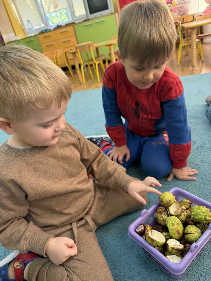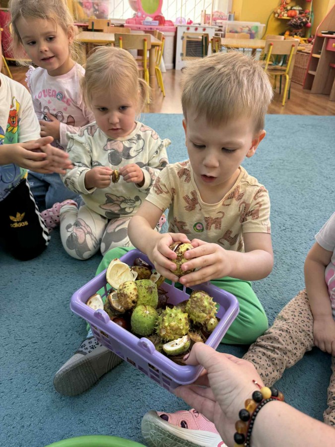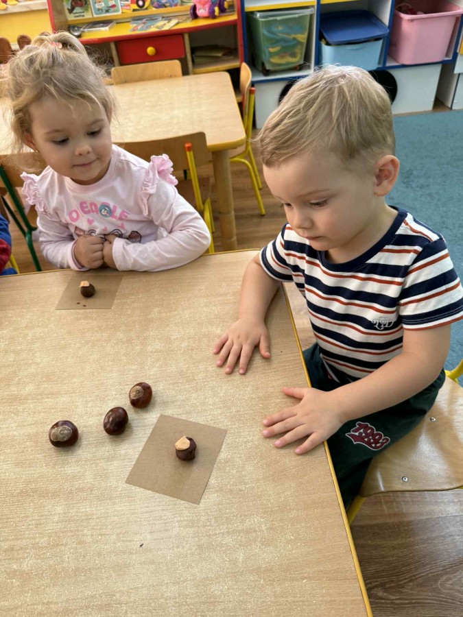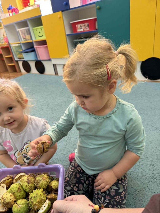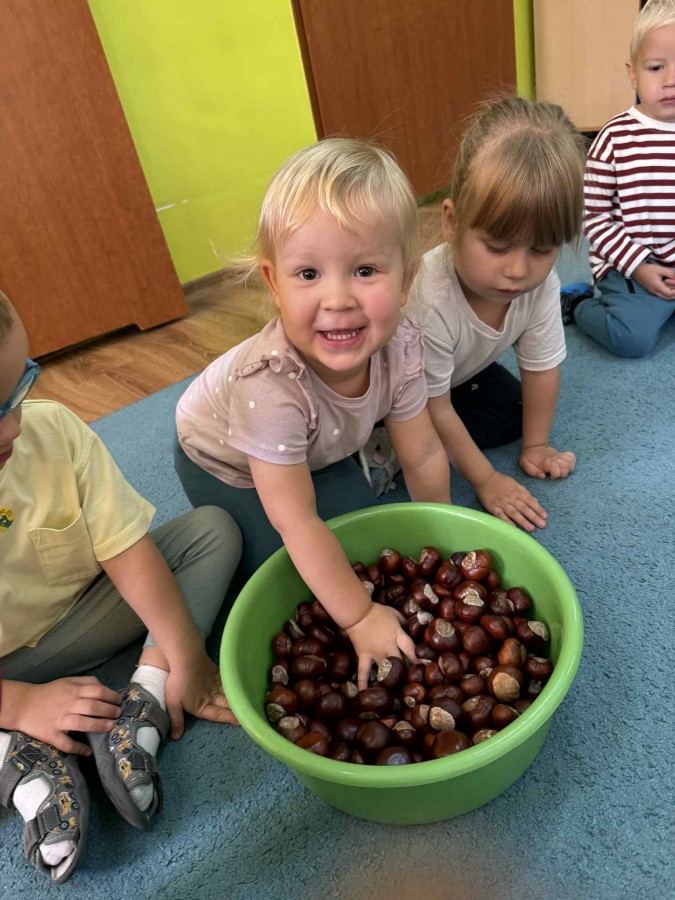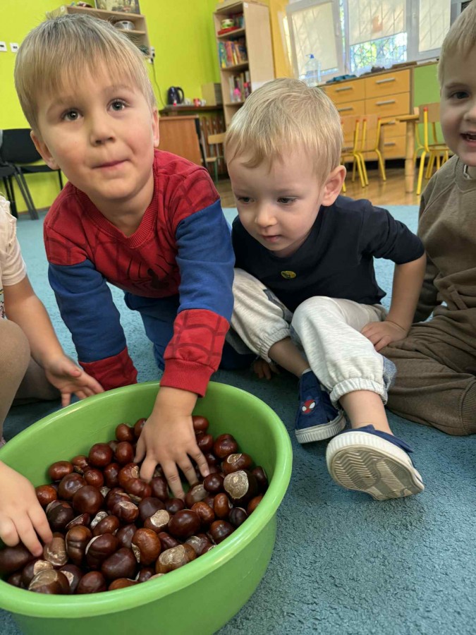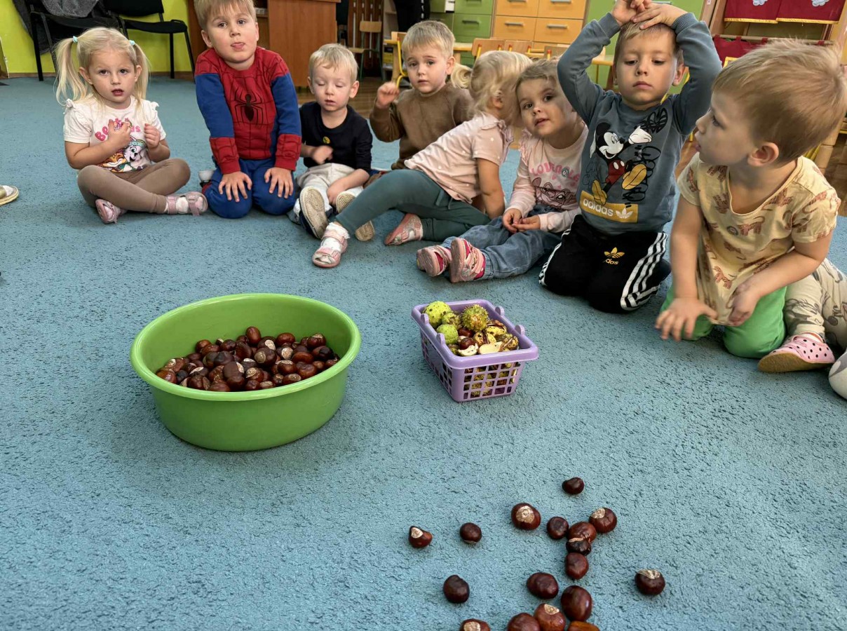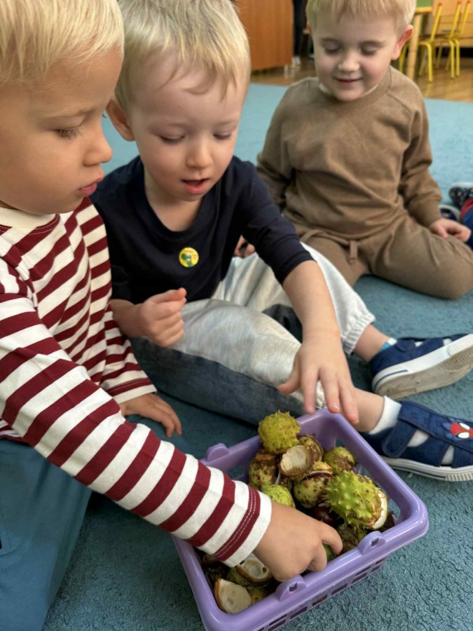 Zajęcia rozpoczęliśmy od rozmowy skąd się biorą kasztany, jak wygląda drzewo kasztanowca. Następnie dzieci badały kasztany poprzez dotyk. Nie zabrakło też zabaw ruchowych. Na koniec zajęć dzieci ulepiły własne kasztany z plasteliny.