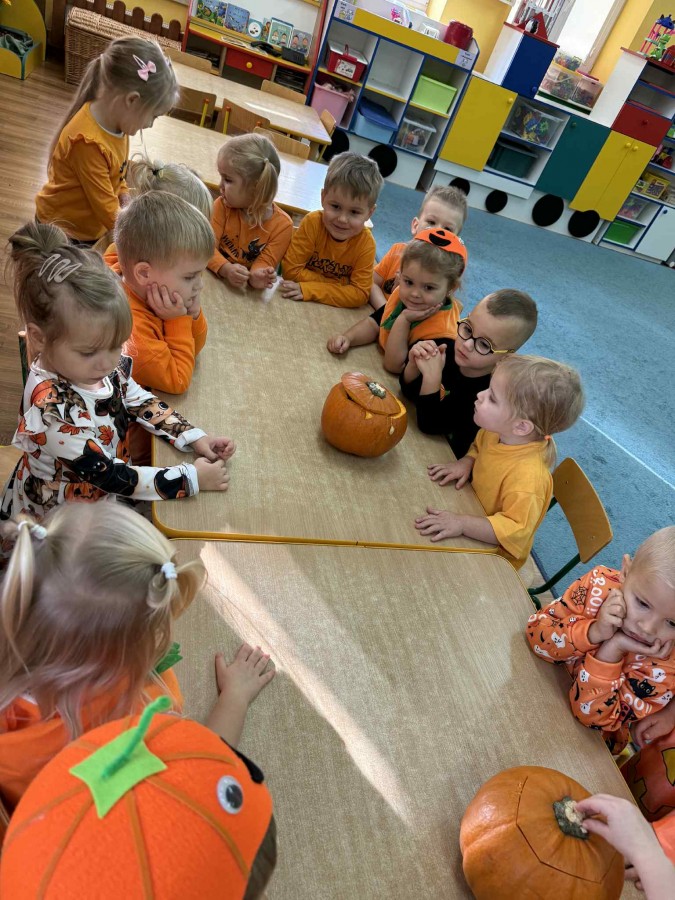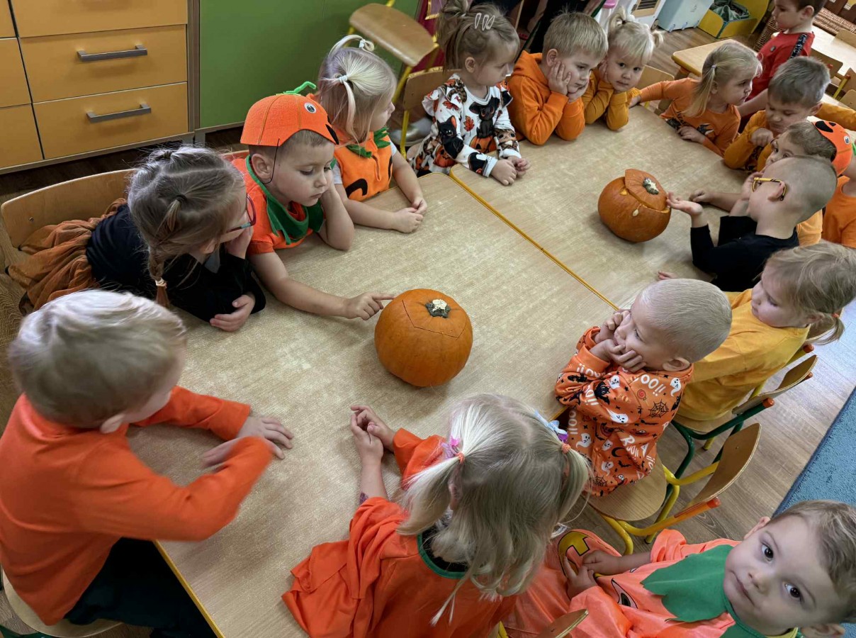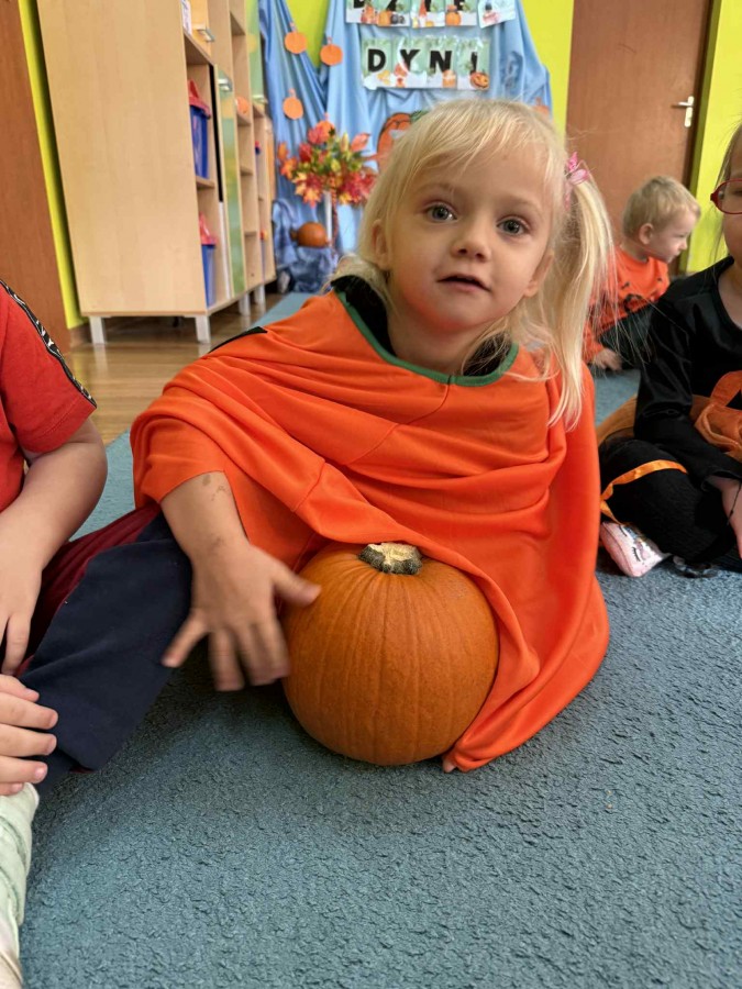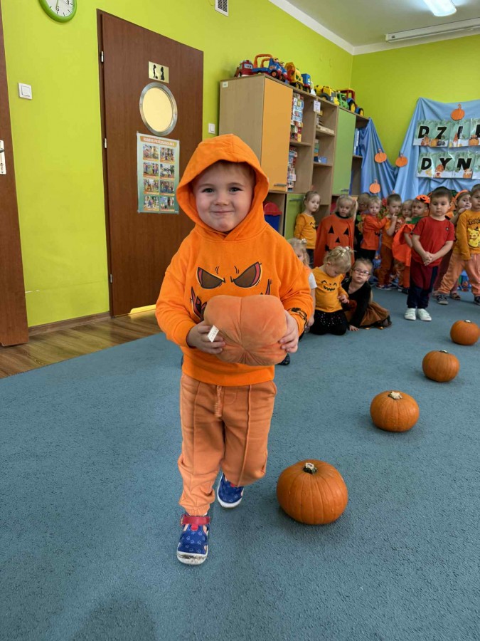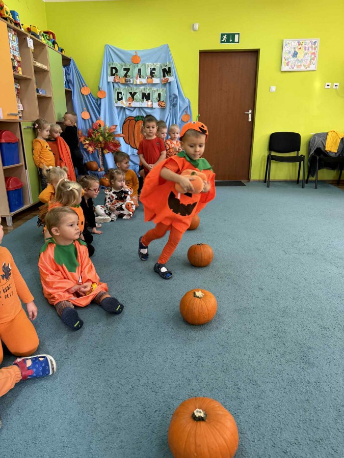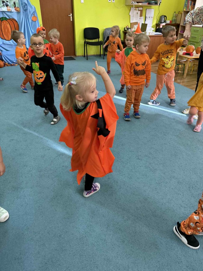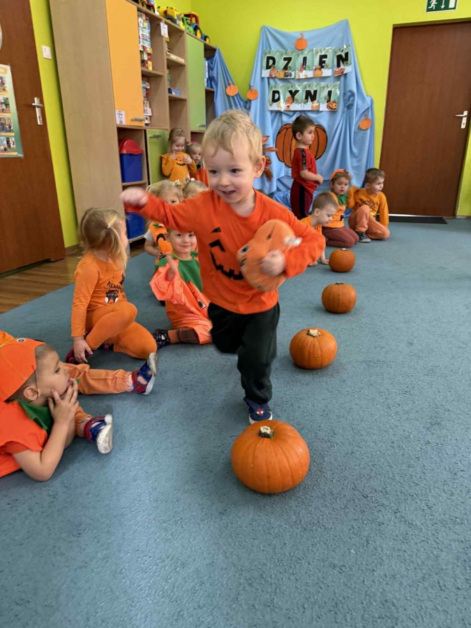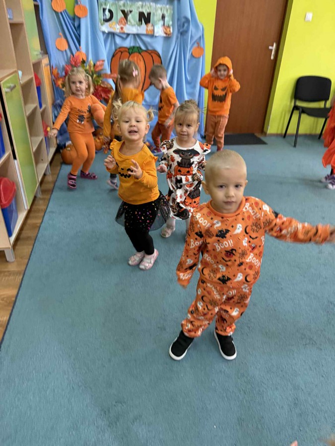 Ach, co to był za dzień pełen wrażeń! Na sali zrobiło się pomarańczowo! Zajęcia rozpoczęliśmy filmem edukacyjnym, następnie były zabawy ruchowe do piosenki „Dynia Dana”. Maluszki poznawały dynie poprzez dotyk- określały czy jest miękka, twarda, gładka, chropowata, największą atrakcją było badanie środka dyni! A skoro był to bal to nie mogło zabraknąć tańców do ulubionych piosenek dzieci.