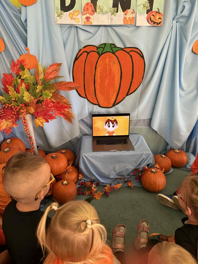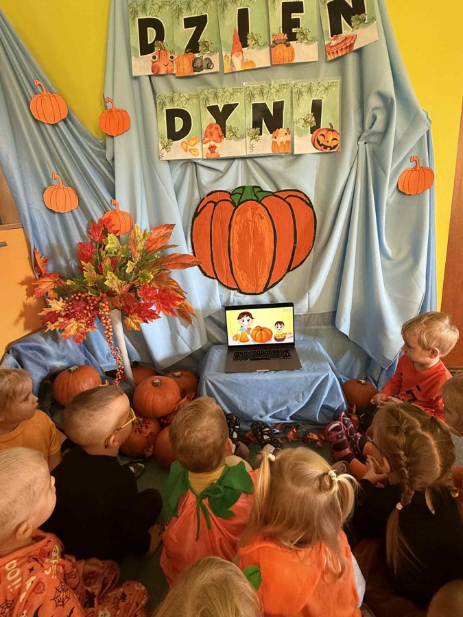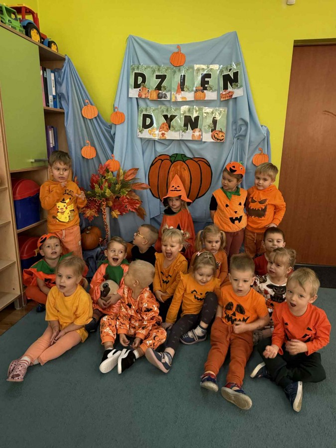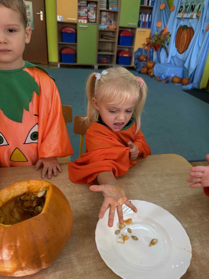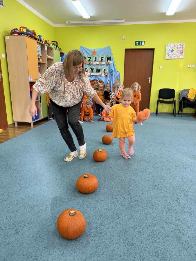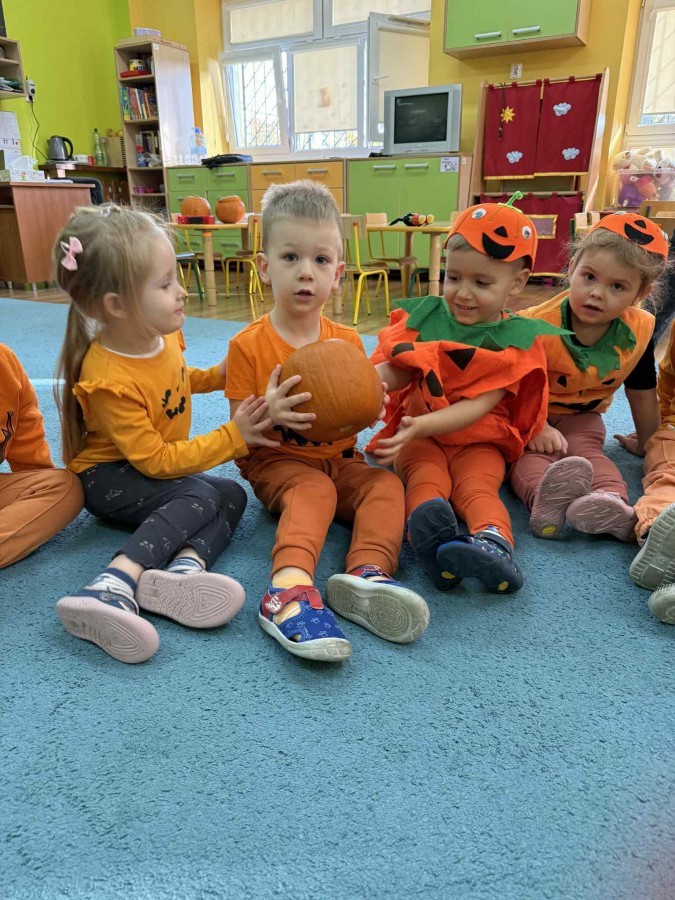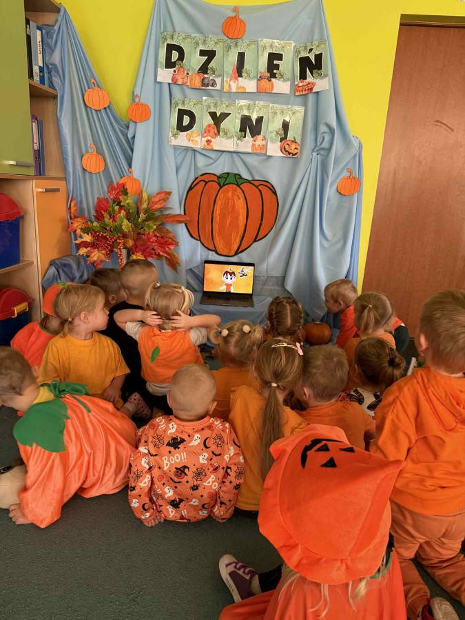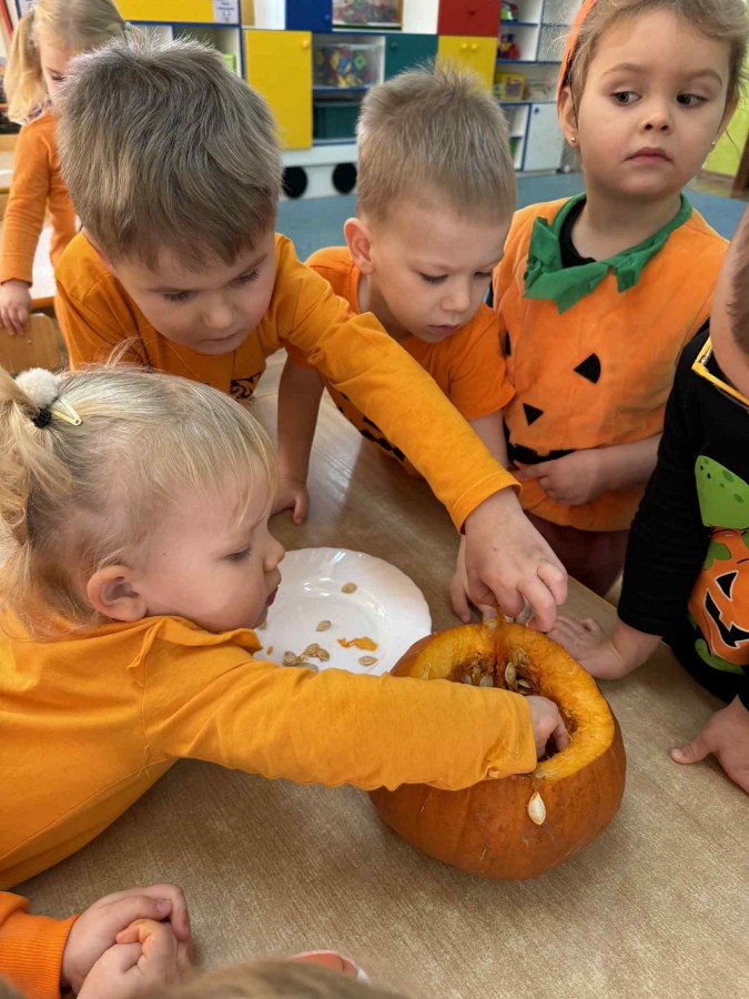 Ach, co to był za dzień pełen wrażeń! Na sali zrobiło się pomarańczowo! Zajęcia rozpoczęliśmy filmem edukacyjnym, następnie były zabawy ruchowe do piosenki „Dynia Dana”. Maluszki poznawały dynie poprzez dotyk- określały czy jest miękka, twarda, gładka, chropowata, największą atrakcją było badanie środka dyni! A skoro był to bal to nie mogło zabraknąć tańców do ulubionych piosenek dzieci.