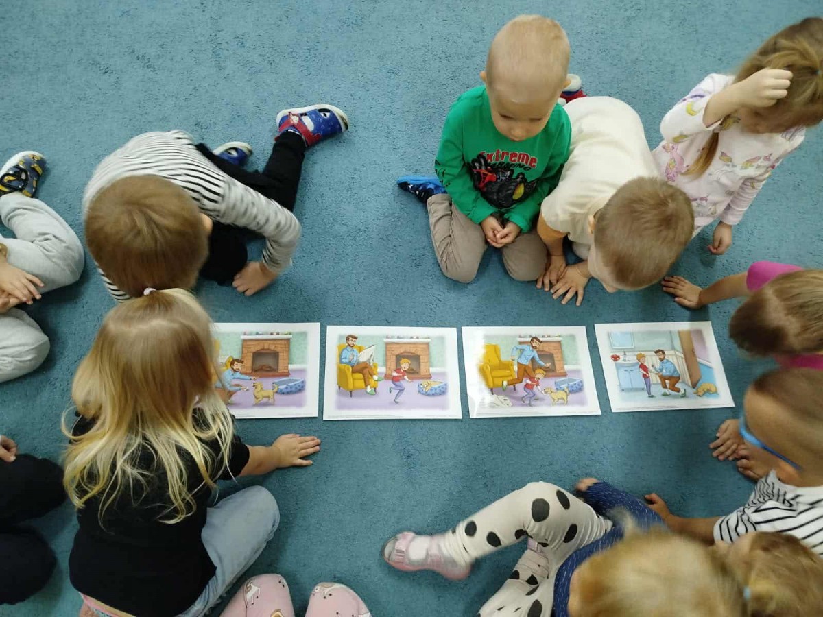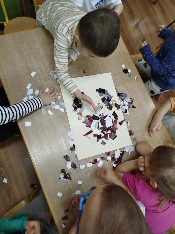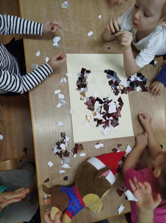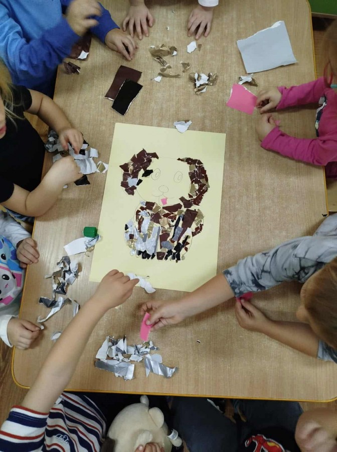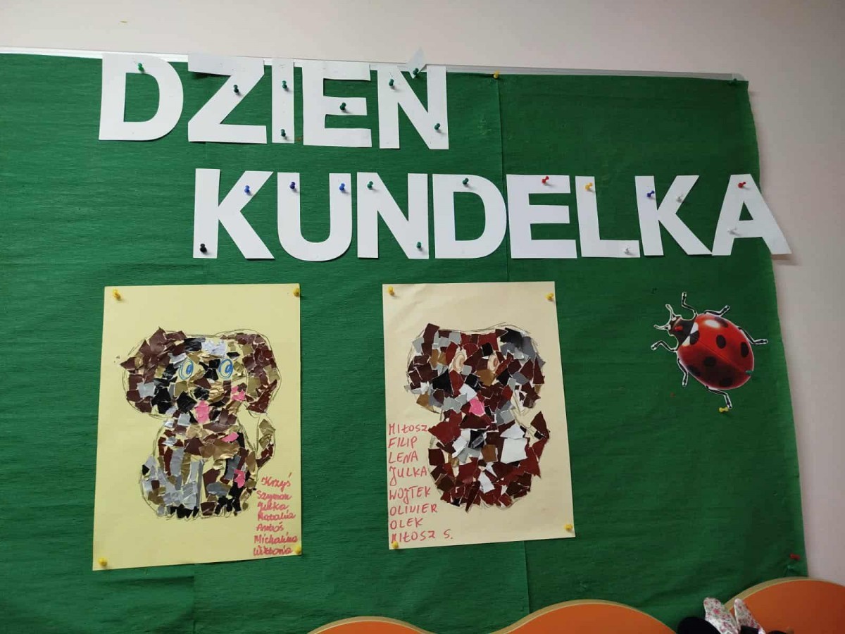 24 października obchodziliśmy Dzień Kundelka. Najpierw rozmawialiśmy o pieskach – o tym jak ważną rolę pełnią w naszym życiu. Dzieci, które mają psy w domu opowiedziały o swoich pupilach: jakie mają imiona i co lubią najbardziej. Dzieci wiedziały jak należy opiekować się psem. Oczywiście, wszyscy zgodziliśmy się, że nie wolno drażnić psa, bo wtedy mogą zachować się agresywnie. Dzieci opowiedziały i ułożyły historyjkę obrazkową, której bohaterem był właśnie piesek. Następne zadanie to wypełnienie konturu kundelka kolorowym papierem. To była praca zespołowa – i powstały dwa obrazki pięknych piesków.