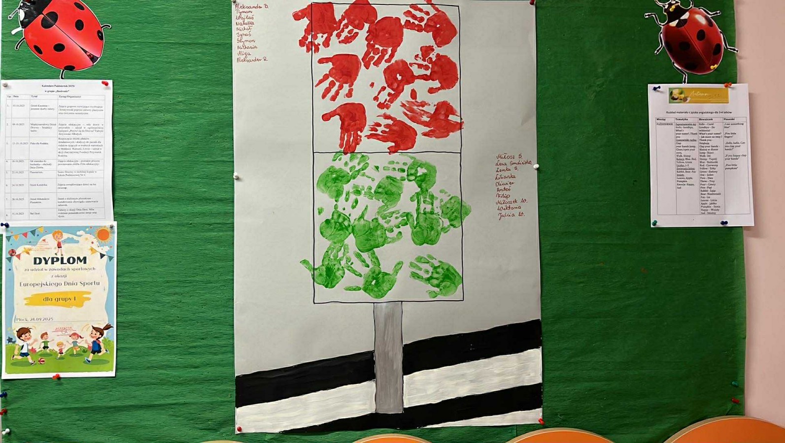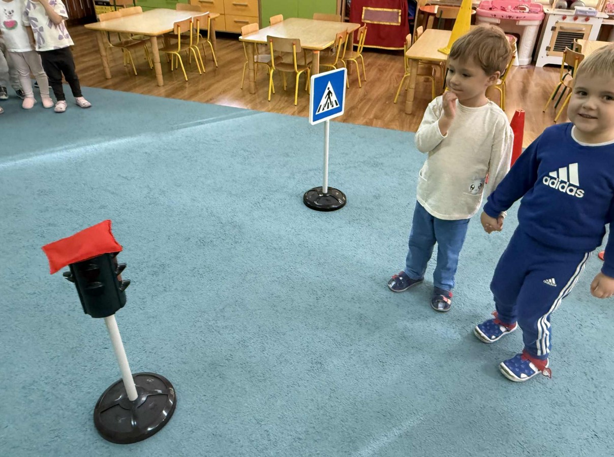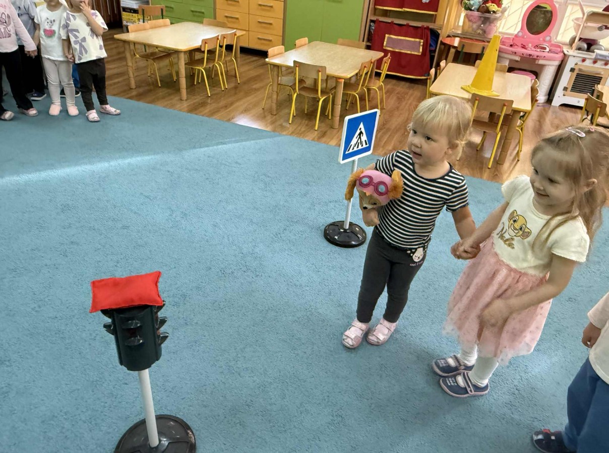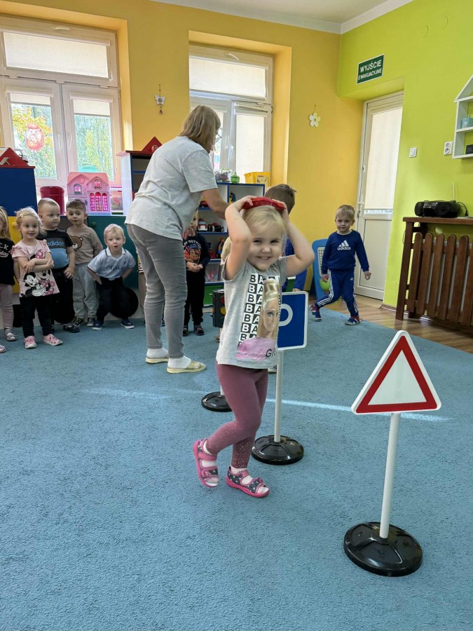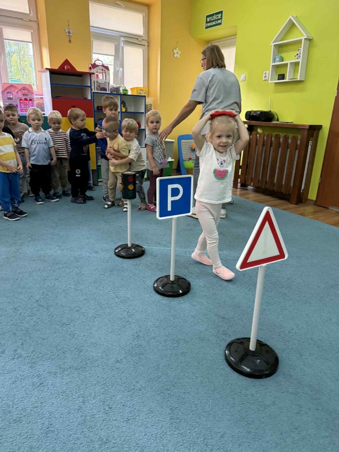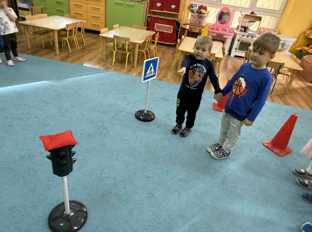 Zajęcie edukacyjne w ramach programu własnego „Bezpieczny przedszkolak”. Poprzez zabawę dzieci z grupy Biedronki zapoznały się z podstawowymi zasadami bezpieczeństwa na drodze czyli kolory sygnalizacji świetlnej, co to jest „zebra” i jak należy przejść na drugą stronę jezdni.