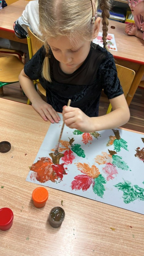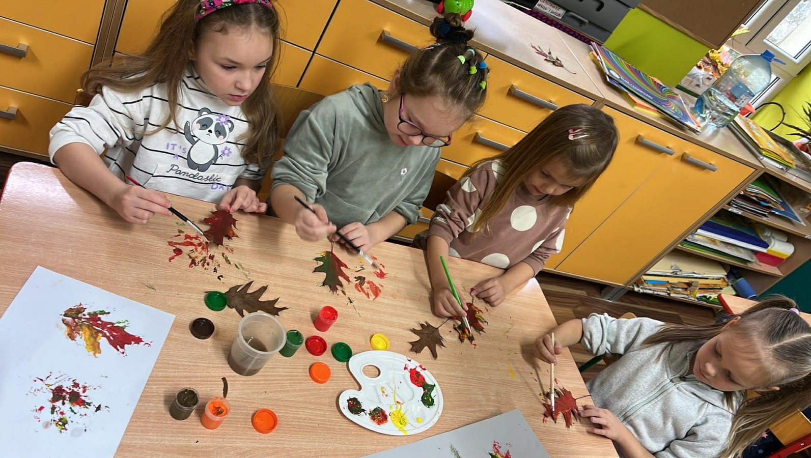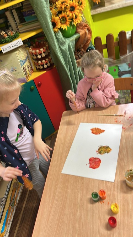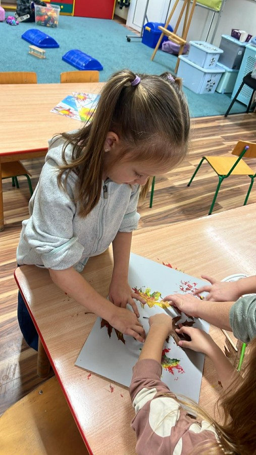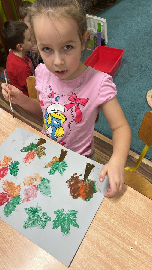 17 listopada po raz kolejny w naszej grupie odbyło zajęcie w ramach kółka plastycznego „Mali artyści”. Chętne dzieci wykonały prace plastyczne pt. „Jesienny las”. Wstępem do pracy była rozmowa o jesiennych, kolorowych drzewach. Dzieci odwołały się do własnych obserwacji, po czym podzieliły się na kilkuosobowe zespoły i przystąpiły do pracy. Wybrały dowolne liście (np. dębu, klonu, lipy), mieszały kolory i pędzlem nakładały farbę na liście. Następnie odbijały liście na kartonie i tak powstał kolorowy, jesienny las.