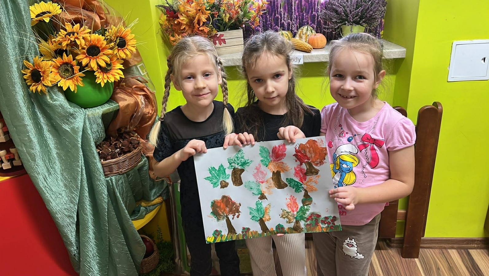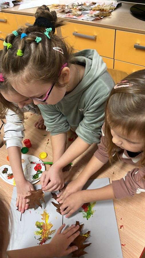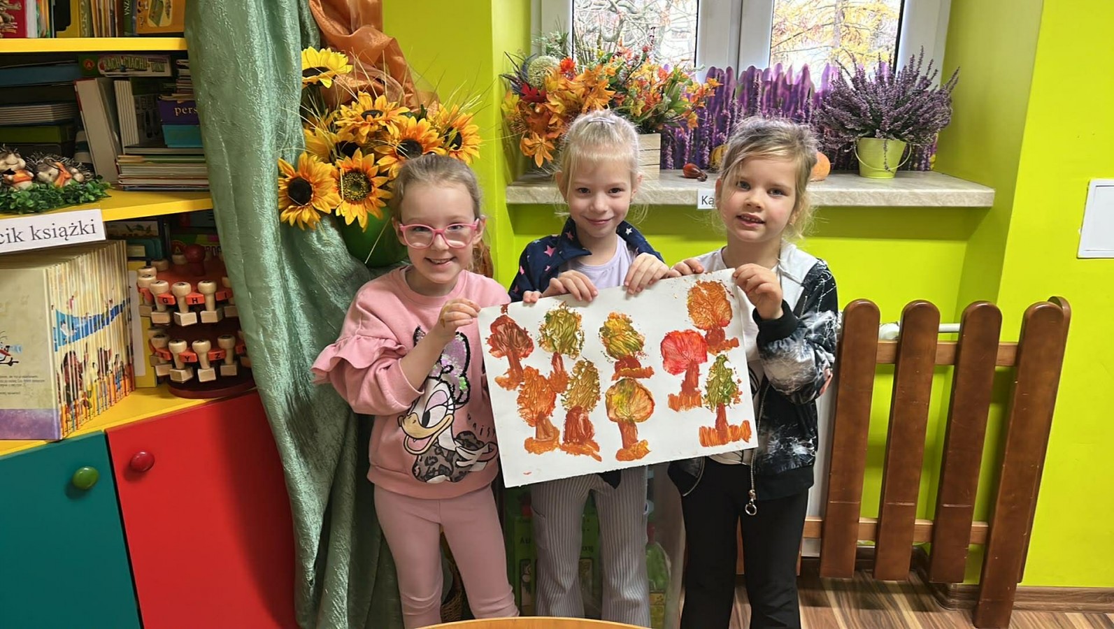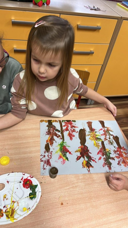 17 listopada po raz kolejny w naszej grupie odbyło zajęcie w ramach kółka plastycznego „Mali artyści”. Chętne dzieci wykonały prace plastyczne pt. „Jesienny las”. Wstępem do pracy była rozmowa o jesiennych, kolorowych drzewach. Dzieci odwołały się do własnych obserwacji, po czym podzieliły się na kilkuosobowe zespoły i przystąpiły do pracy. Wybrały dowolne liście (np. dębu, klonu, lipy), mieszały kolory i pędzlem nakładały farbę na liście. Następnie odbijały liście na kartonie i tak powstał kolorowy, jesienny las.