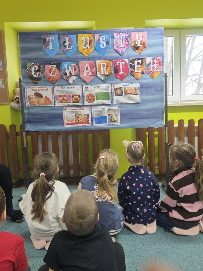 12 lutego, w naszej grupie, odbyły się zajęcia, podczas których dzieci poznały tradycję Tłustego Czwartku – dnia, w którym zgodnie z polskim zwyczajem zajadamy się pączkami i faworkami. Dzieci w przystępny sposób dowiedziały się, że dawniej był to dzień radosnego świętowania przed rozpoczęciem Wielkiego Postu, czyli czasu wyciszenia i przygotowania do Świąt Wielkanocnych, że już wiele lat temu ludzie wierzyli, iż zjedzenie pączka w Tłusty Czwartek przynosi szczęście