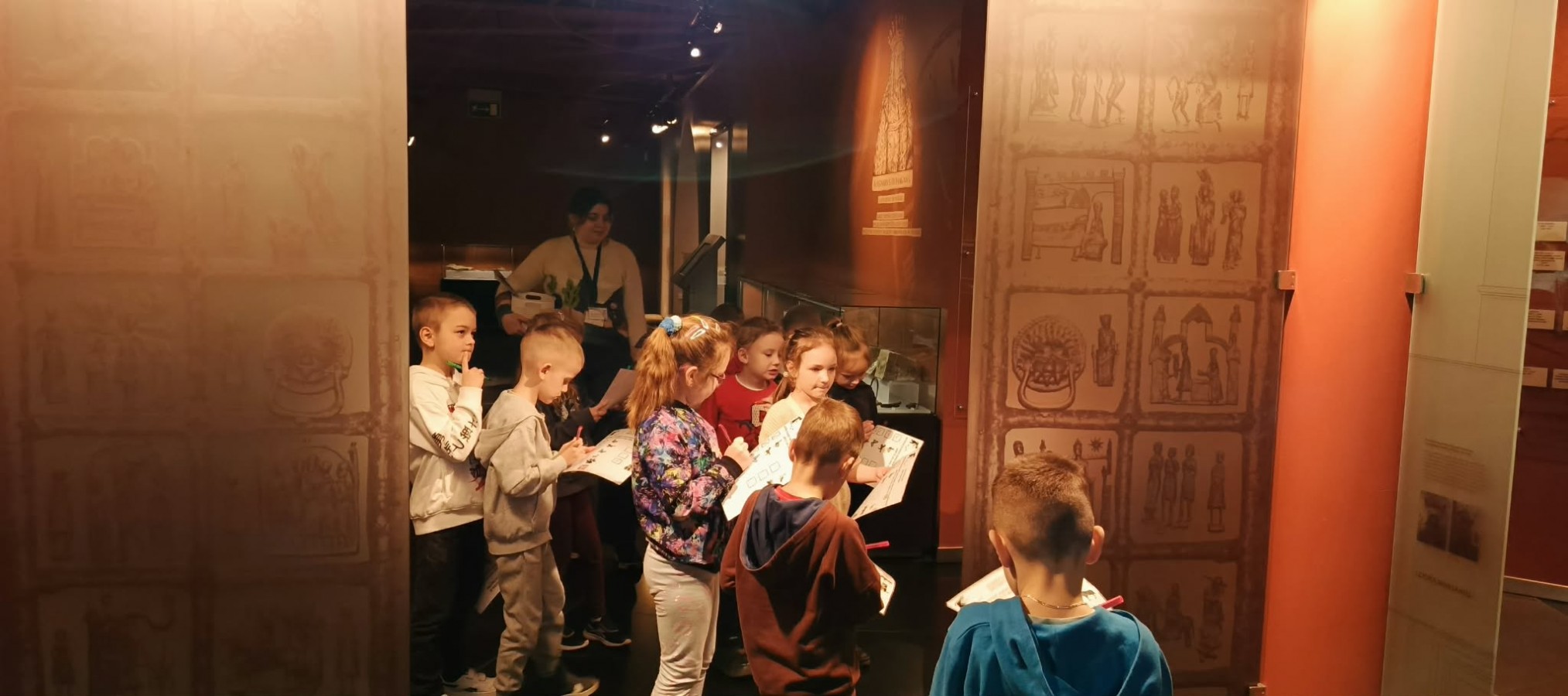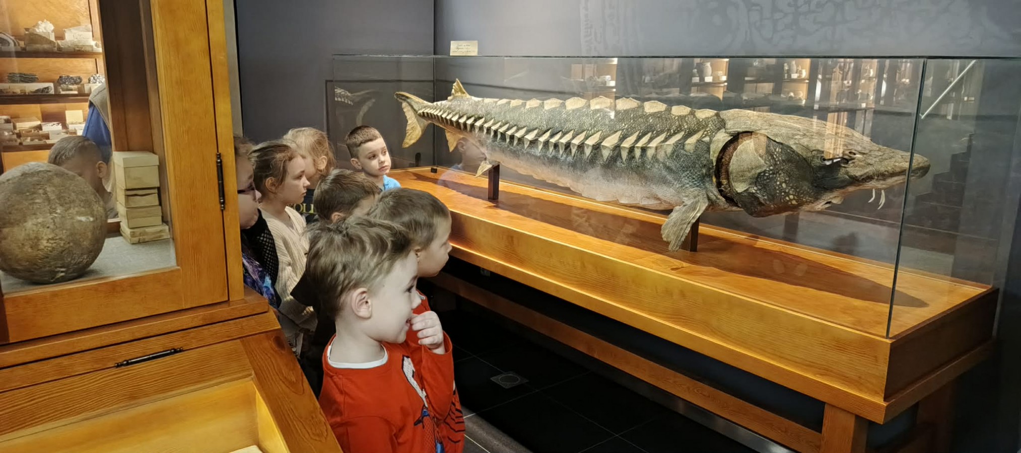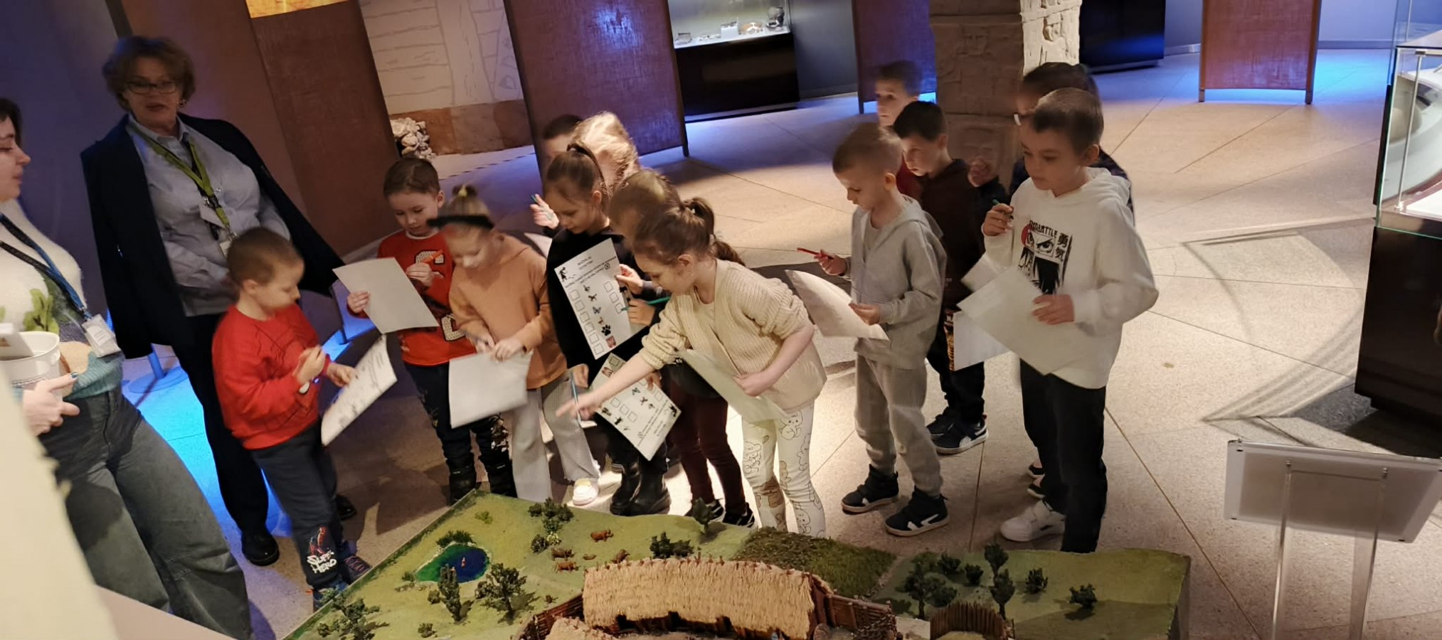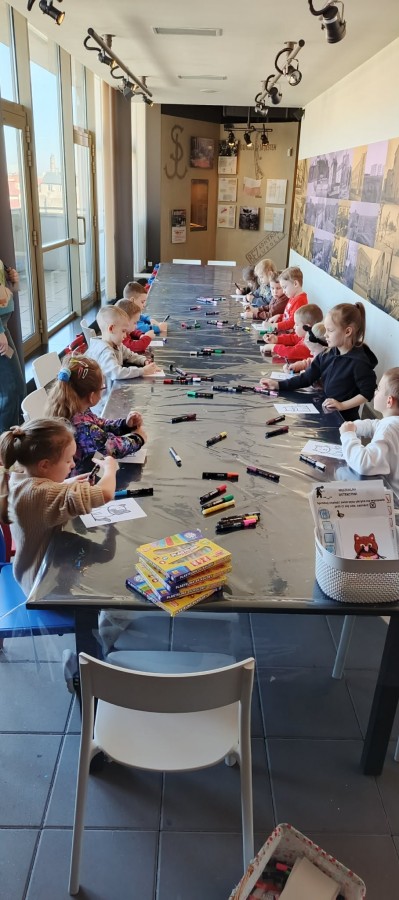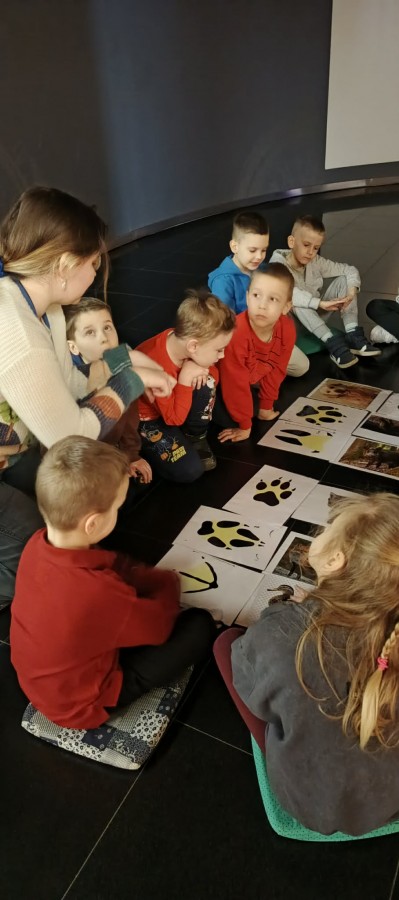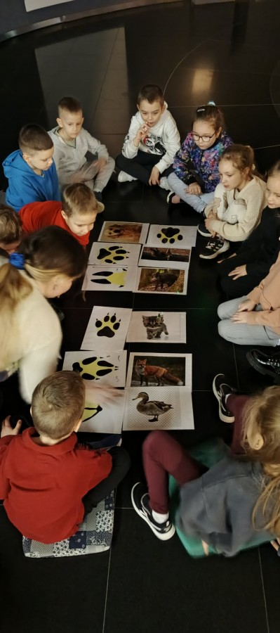 6 marca nasza grupa wybrała się na warsztaty do Muzeum Mazowieckiego pt. „Zwierzyniec”. Pierwsze zadanie jakie miały wykonać dzieci to dopasowanie śladów do różnych zwierząt. Następnie pani przewodnik zadawała zagadki dotyczące zwierząt, a zadaniem dzieci było odgadnąć o jakiego zwierzaka chodzi i odszukać go w gablocie. Wielkie zainteresowanie wzbudził jesiotr, wyłowiony w Wiśle, mierzący ponad 3 metry długości. Pani Julia rozdała dzieciom kartę, na której były zdjęcia zwierząt i różnych przedmiotów. Teraz wszyscy zamienili się w muzealnych detektywów. Mieli odszukać w poszczególnych salach zaznaczone elementy. Dzieci wykazały się dużą spostrzegawczością. Na koniec ozdobiły sylwetę kota wg własnego pomysłu.