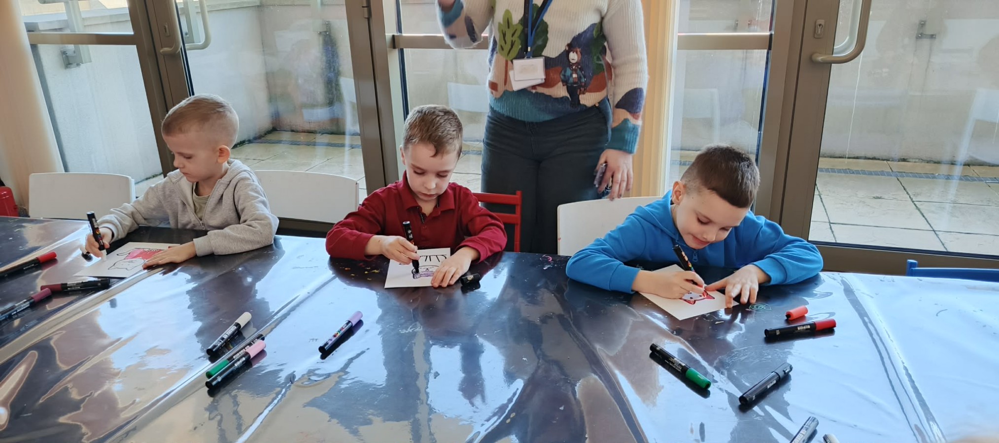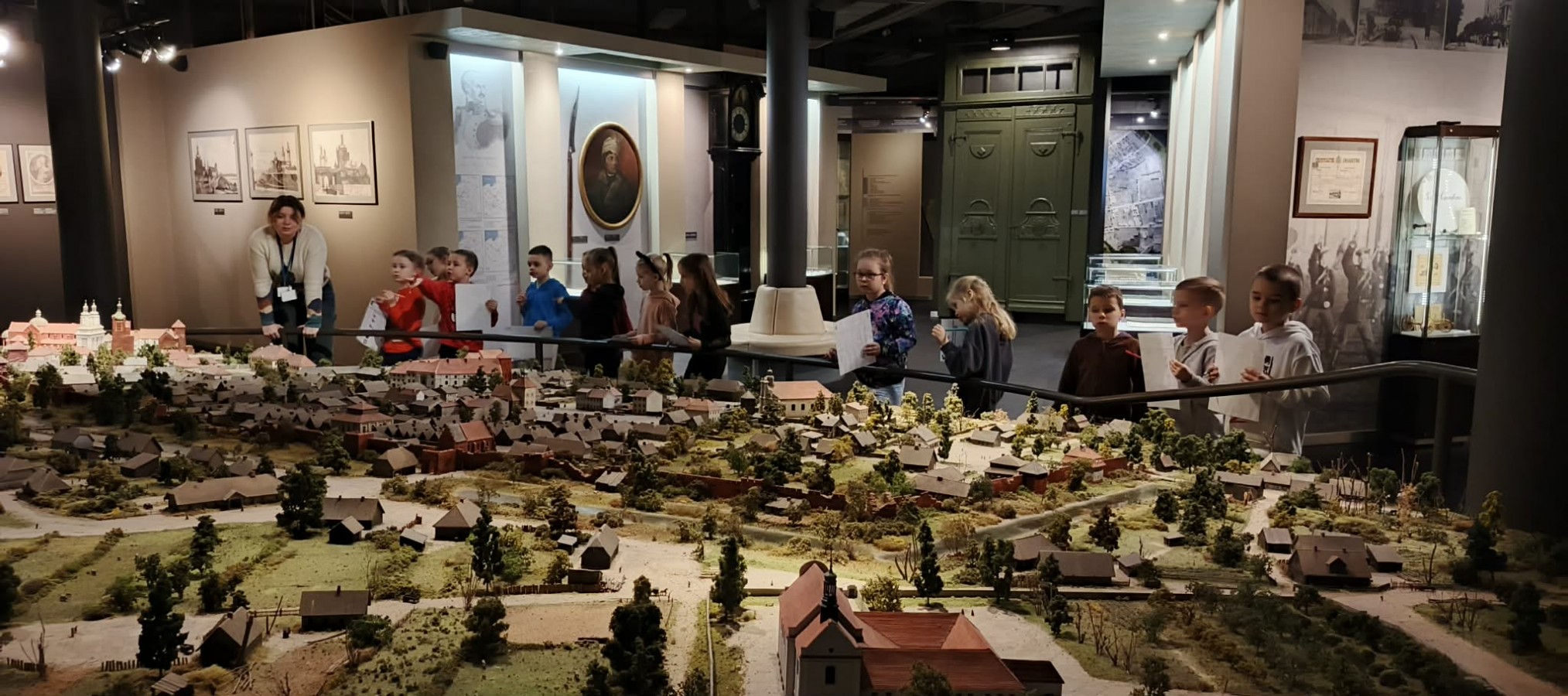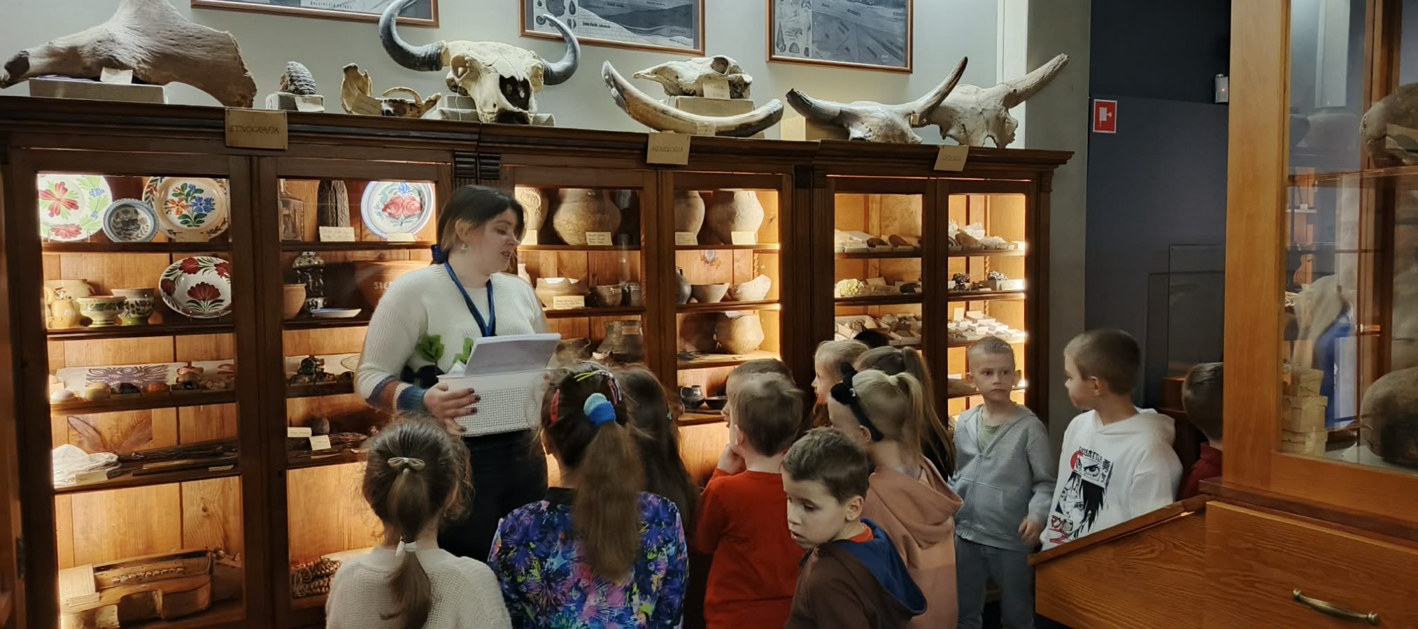 6 marca nasza grupa wybrała się na warsztaty do Muzeum Mazowieckiego pt. „Zwierzyniec”. Pierwsze zadanie jakie miały wykonać dzieci to dopasowanie śladów do różnych zwierząt. Następnie pani przewodnik zadawała zagadki dotyczące zwierząt, a zadaniem dzieci było odgadnąć o jakiego zwierzaka chodzi i odszukać go w gablocie. Wielkie zainteresowanie wzbudził jesiotr, wyłowiony w Wiśle, mierzący ponad 3 metry długości. Pani Julia rozdała dzieciom kartę, na której były zdjęcia zwierząt i różnych przedmiotów. Teraz wszyscy zamienili się w muzealnych detektywów. Mieli odszukać w poszczególnych salach zaznaczone elementy. Dzieci wykazały się dużą spostrzegawczością. Na koniec ozdobiły sylwetę kota wg własnego pomysłu.