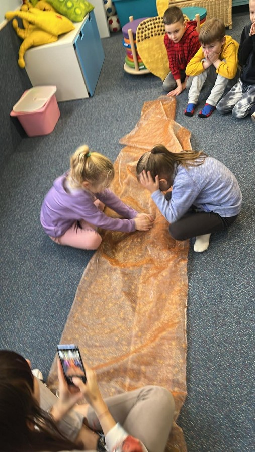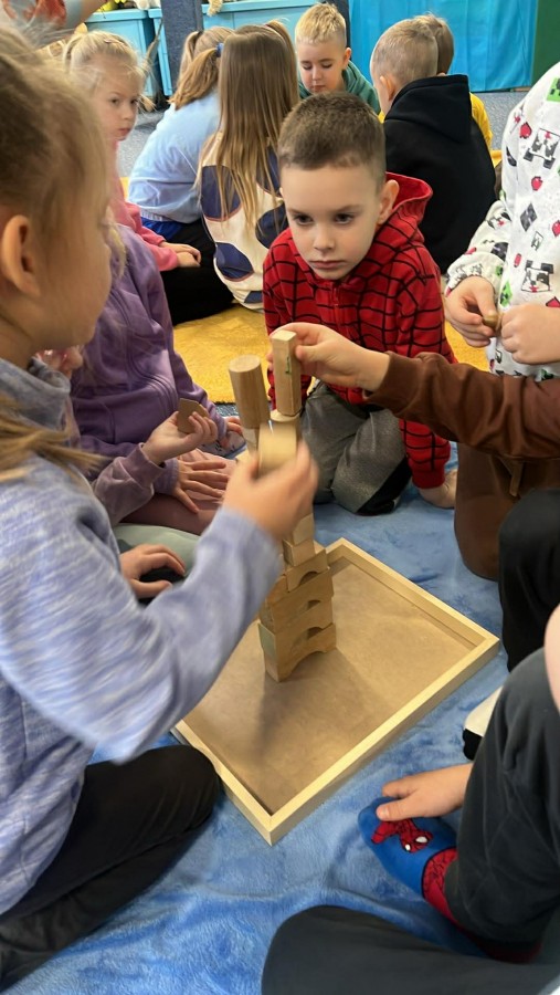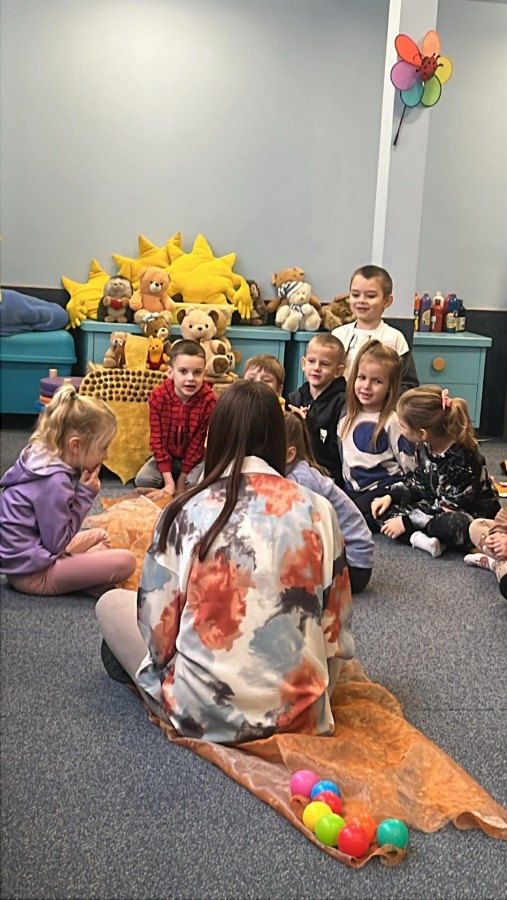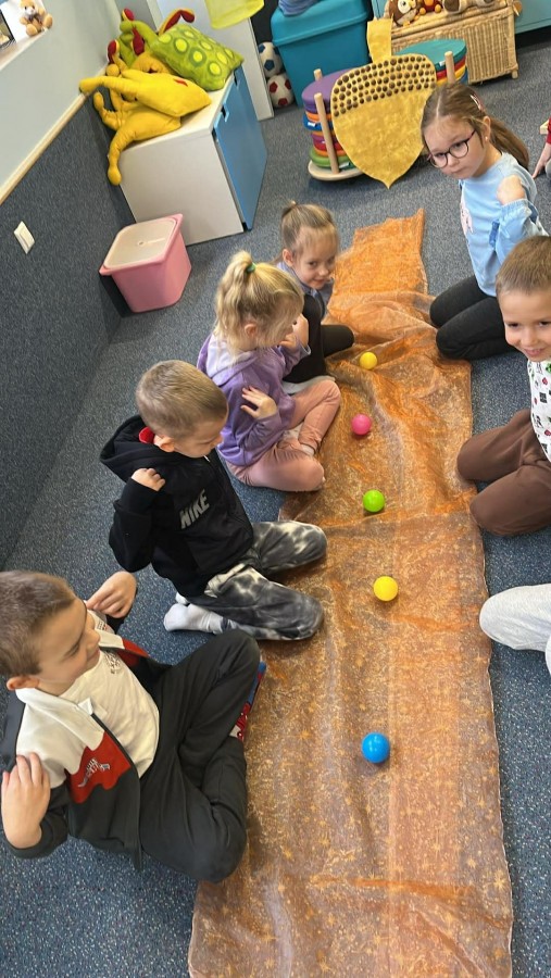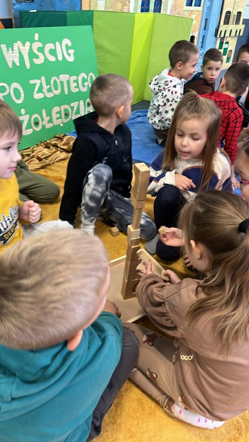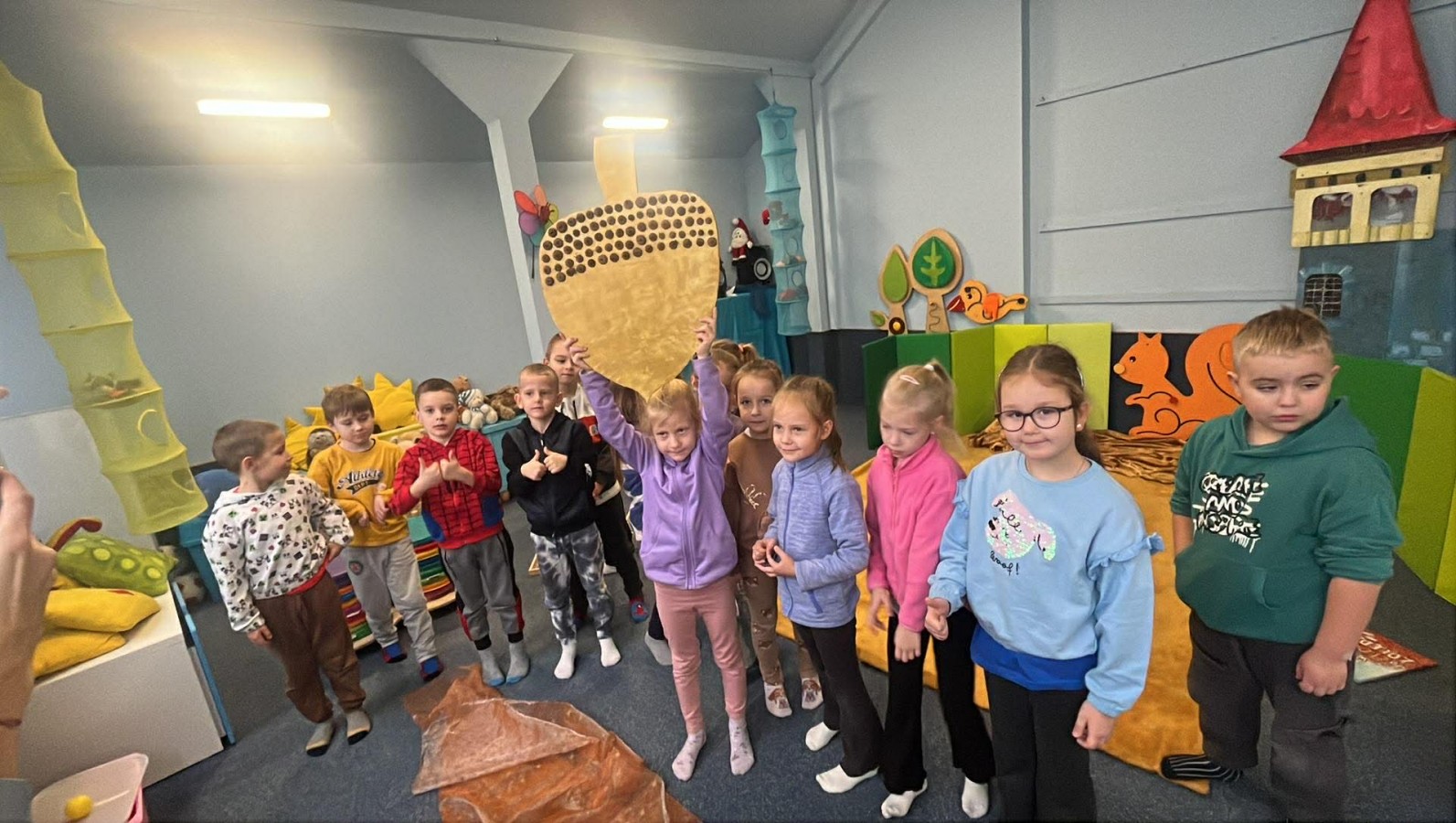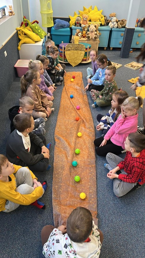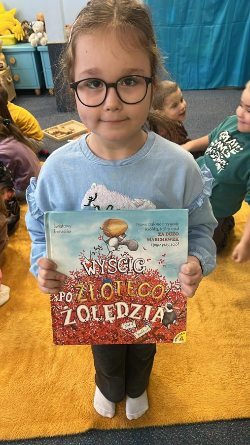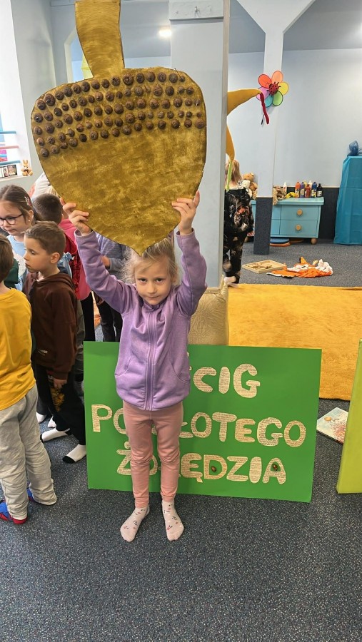 27 listopada odwiedziliśmy Bibliotekę dla dzieci im. W. Chotomskiej. Po krótkim zwiedzeniu biblioteki dzieci wysłuchały opowiadania pt. „Wyścig po złotego żołędzia” i odpowiedziały na pytania dotyczące tekstu. Dużo pozytywnych emocji dostarczyła zabawa z piłeczkami, w której trzeba było wykazać się dobrym refleksem. Aby zdobyć odznakę ”Złotego żołędzia”, dzieci podzielone na dwie grupy miały ułożyć jak najwyższą wieżę z klocków drewnianych i na jej szczycie położyć żołędzia. Oczywiście były również zabawy ruchowe. Wszystkim bardzo podobały się zajęcia w „Chotomku” i z pewnością jeszcze tu wrócimy.