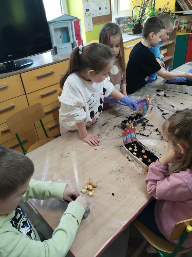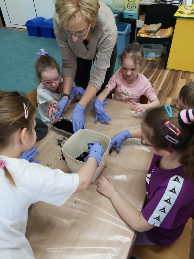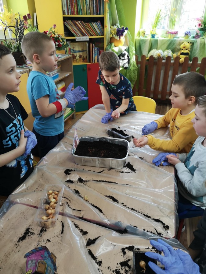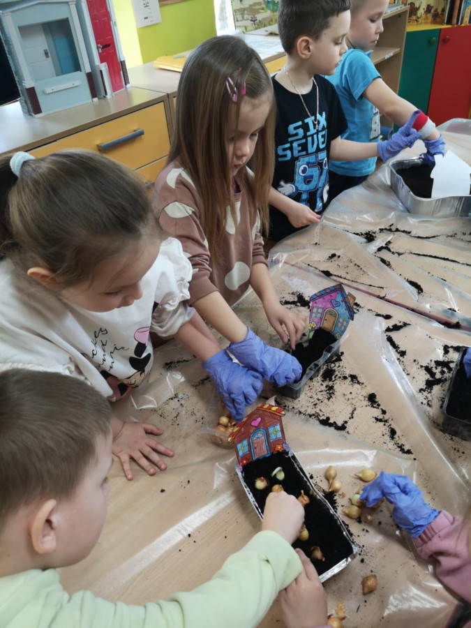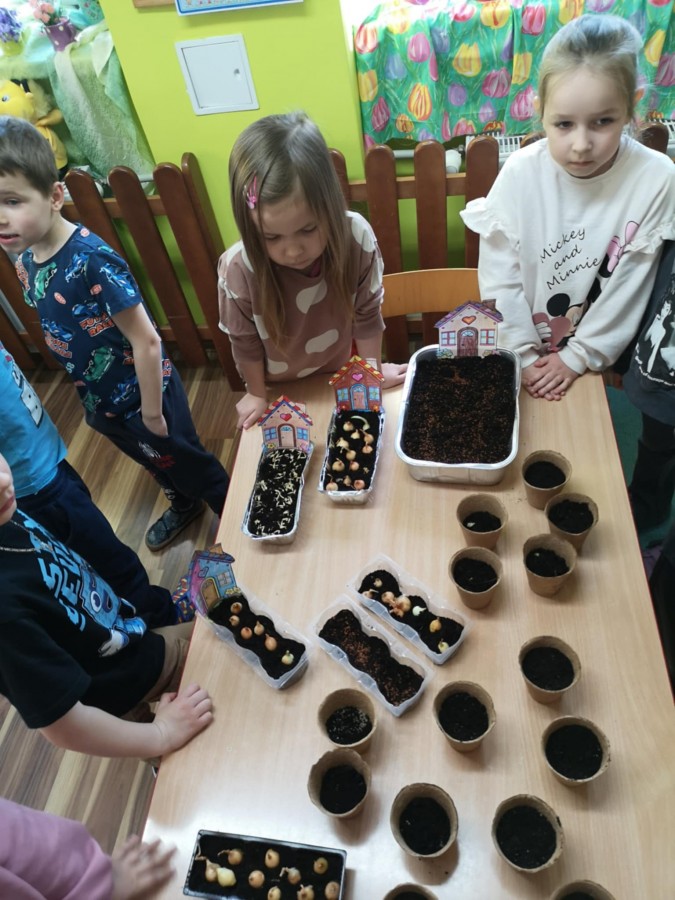27 marca w naszej sali założyliśmy zielony kącik. Najpierw była krótka rozmowa nt wiosennych prac w ogrodzie. Dzieci wymieniły co jest potrzebne do wzrostu roślin, a potem zamieniły się w małych ogrodników. Przygotowaną ziemię wsypywały do małych pojemników, które ozdobiły pokolorowanym wcześniej domkiem. Zasiały tam owies, szczypiorek, pietruszkę itp. W innych pojemnikach dzieci posadziły małe cebulki a nawet konwalie. Dzieci z wielkim zaangażowaniem tworzyły zielony kącik w sali. Pojemniki zostały ustawione blisko okna, aby miały dostęp do światła. Teraz będą je podlewać i codziennie obserwować jak kiełkują.