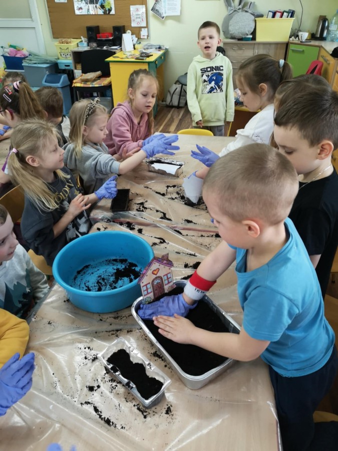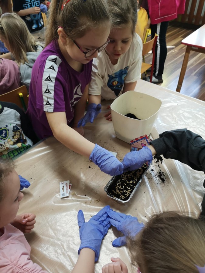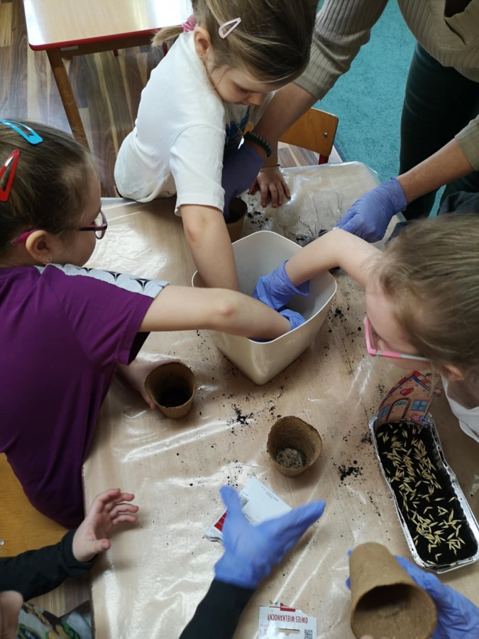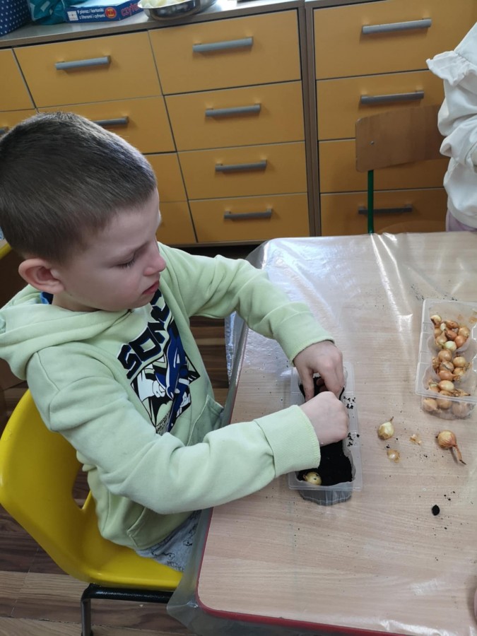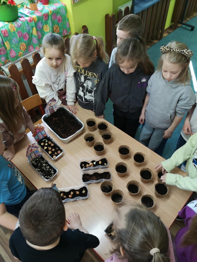 27 marca w naszej sali założyliśmy zielony kącik. Najpierw była krótka rozmowa nt wiosennych prac w ogrodzie. Dzieci wymieniły co jest potrzebne do wzrostu roślin, a potem zamieniły się w małych ogrodników. Przygotowaną ziemię wsypywały do małych pojemników, które ozdobiły pokolorowanym wcześniej domkiem. Zasiały tam owies, szczypiorek, pietruszkę itp. W innych pojemnikach dzieci posadziły małe cebulki a nawet konwalie. Dzieci z wielkim zaangażowaniem tworzyły zielony kącik w sali. Pojemniki zostały ustawione blisko okna, aby miały dostęp do światła. Teraz będą je podlewać i codziennie obserwować jak kiełkują.
