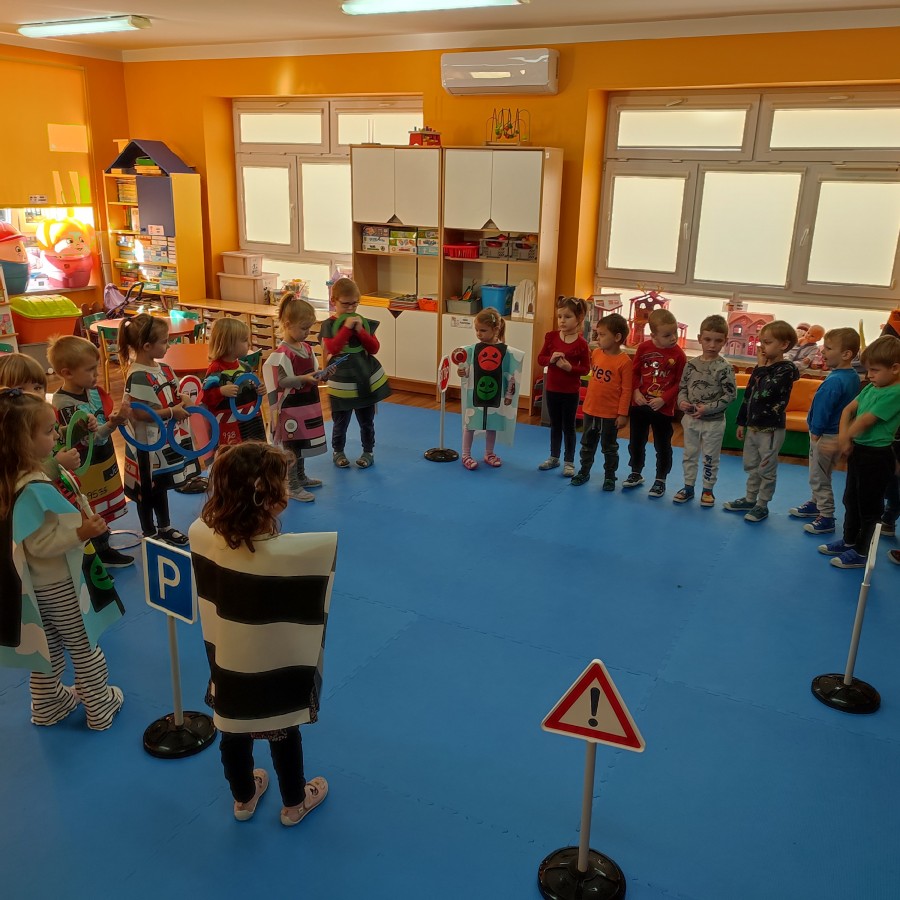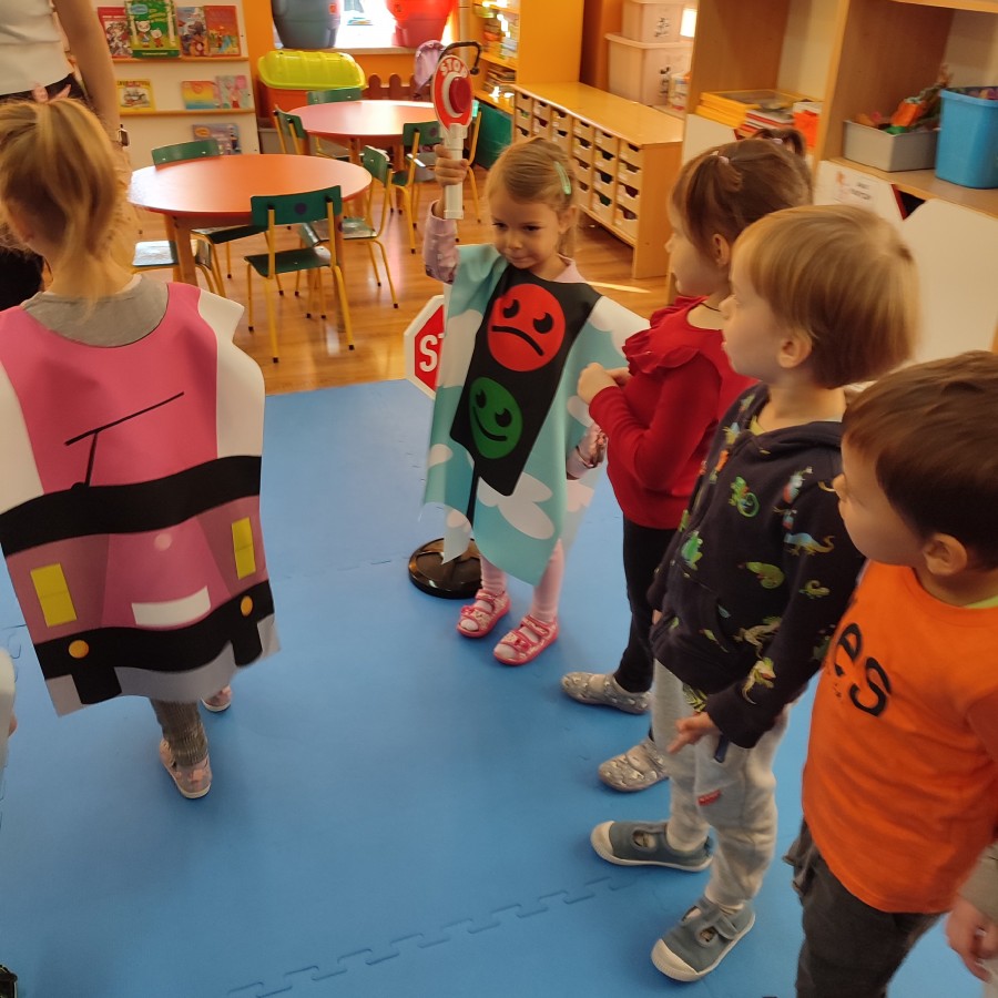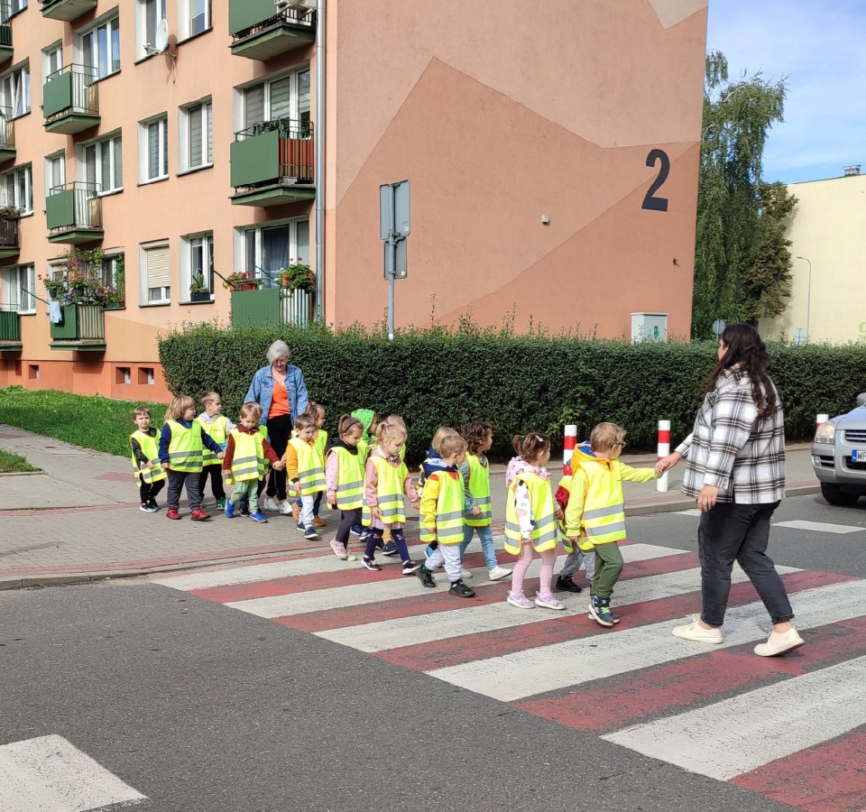 Podczas spaceru na pobliskim skrzyżowaniu mogły w praktyce obserwować zachowania pieszych i samochodów, a także utrwalać wiedzę o znakach drogowych. Nie zabrakło również licznych zabaw dydaktycznych – dzieci wcielały się w rolę pieszych, kierowców i policjantów, odtwarzając ruch uliczny.