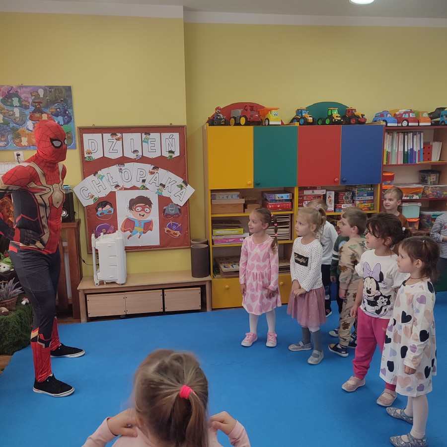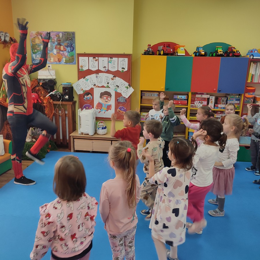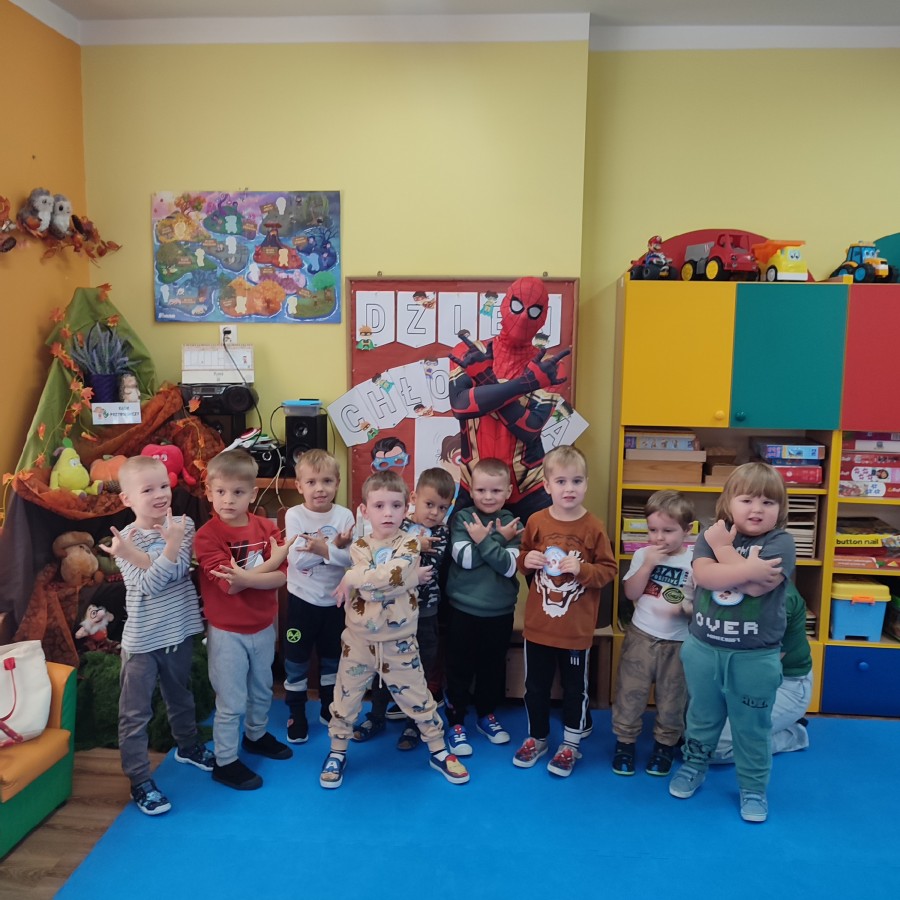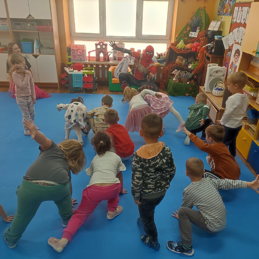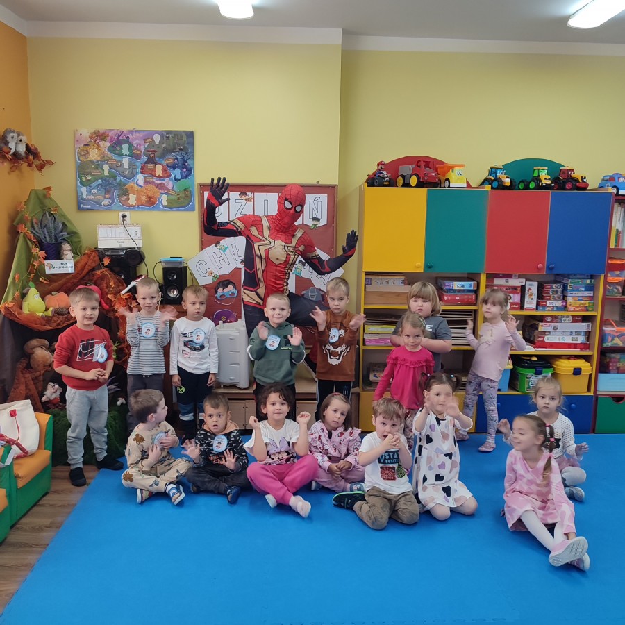 Gośćmi specjalnymi byli niezwykli bohaterowie – Spider-Man i Blue, którzy odwiedzili przedszkolaków, wywołując ogromną radość i zachwyt. Wspólne zabawy, tańce i konkursy sprawiły, że czas upłynął w atmosferze śmiechu i wspaniałej zabawy.