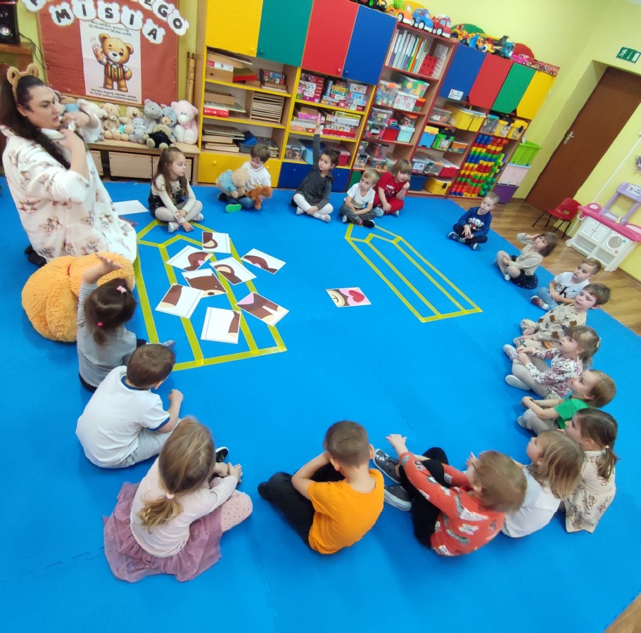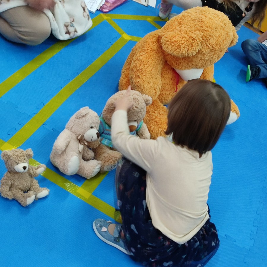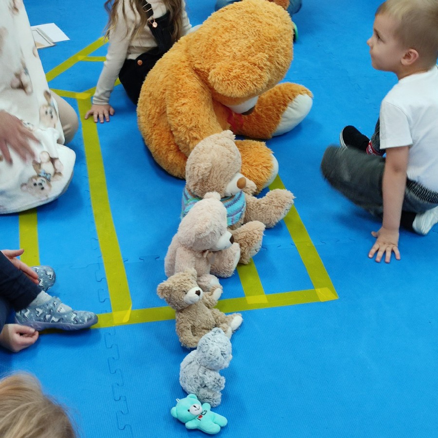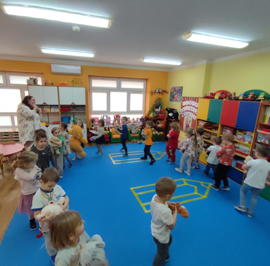 Przedszkolaki brały udział w misiowych zabawach, tańcach oraz konkurencjach ruchowych. Wspólnie poznawaliśmy historię pluszowego misia, a dzieci chętnie opowiadały o swoich ulubionych maskotkach.