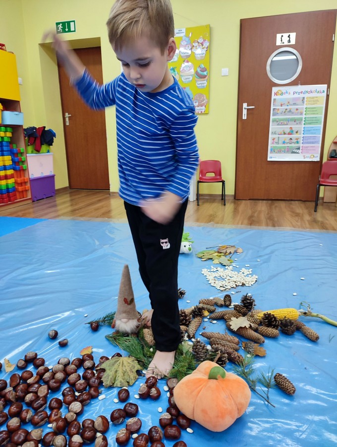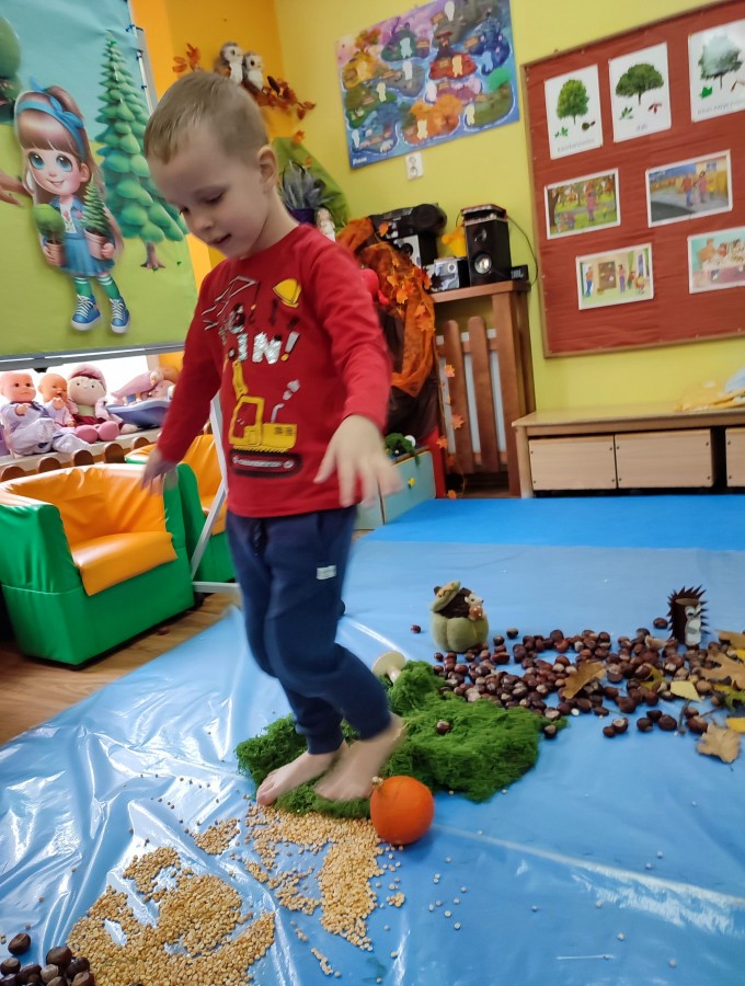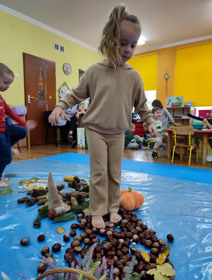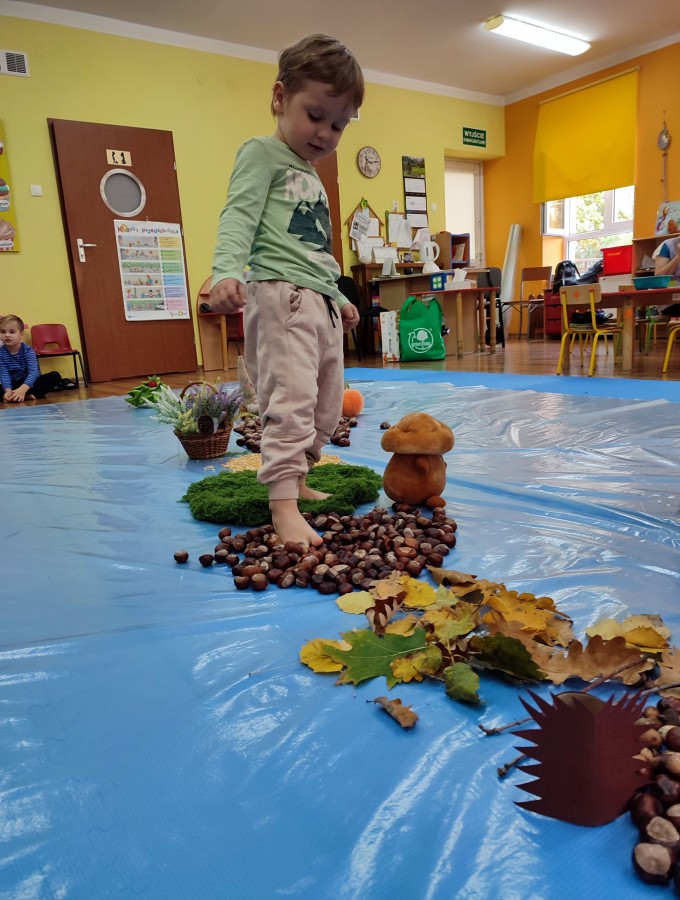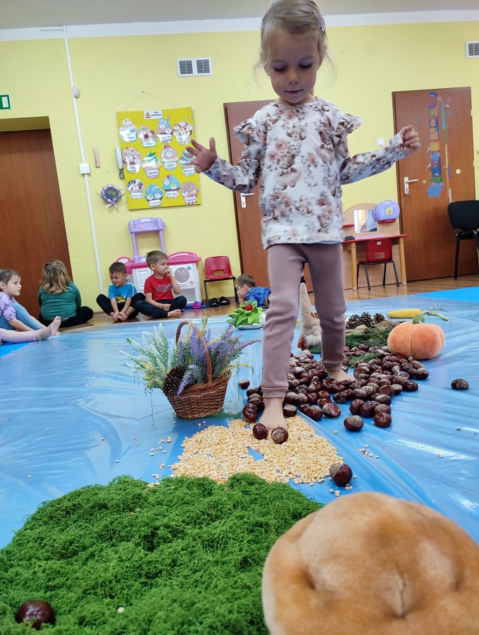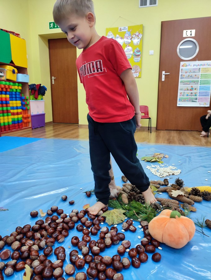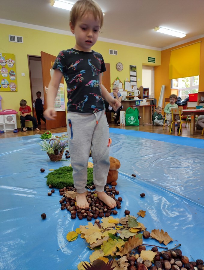 Przedszkolaki z grupy Krasnale postanowiły wykorzystać dary Pani Jesieni i stworzyć jesienną ścieżkę sensoryczną. Została ona utworzona z liści, igieł sosny, kasztanów, żołędzi, szyszek, ziaren gruchu, fasoli i patyków. Chodzenie po niej nie było łatwe. Taka ścieżka sensoryczna ma duże znaczenia dla dziecięcych stópek- usprawnia motorykę dużą, rozwija wrażenia dotykowe, poprawia koordynację ruchową i przede wszystkim stymuluje receptory. Spacer po wyznaczonej trasie sprawił dzieciom mnóstwo radości i satysfakcji. Z pewnością kiedyś ją powtórzymy.
