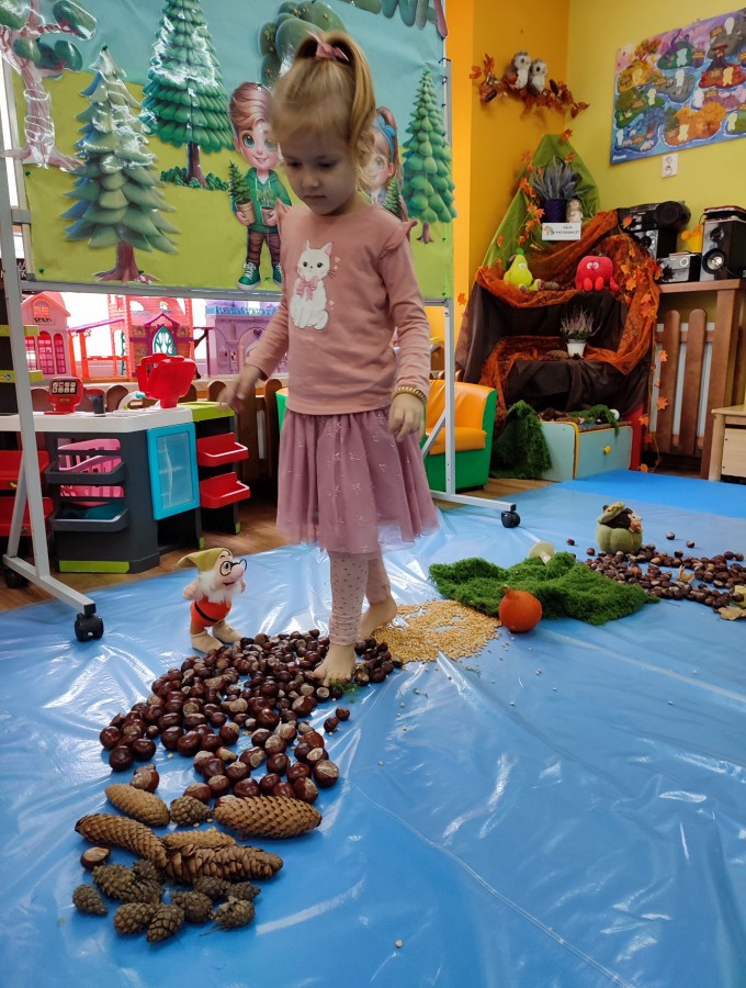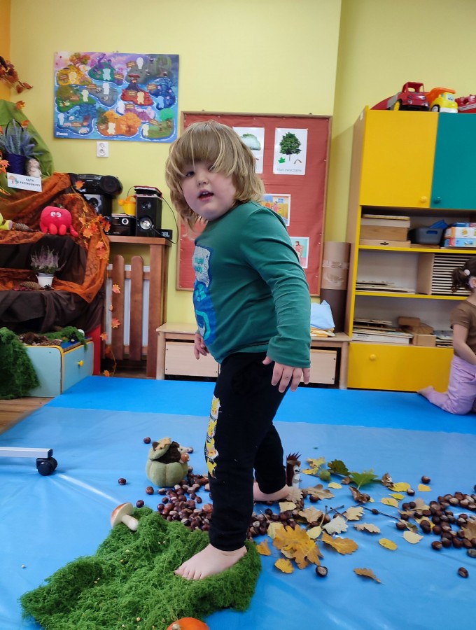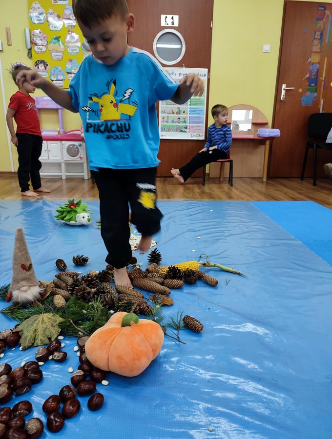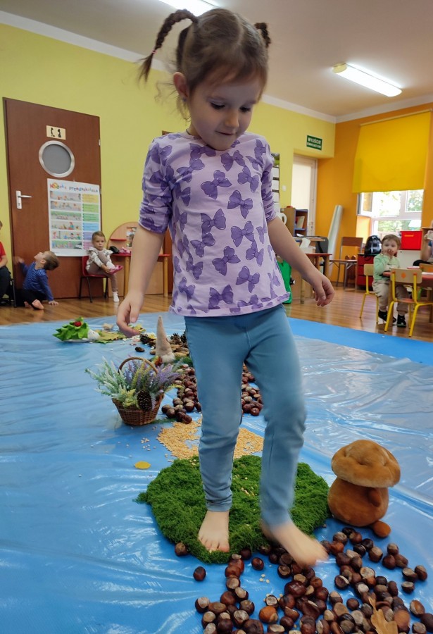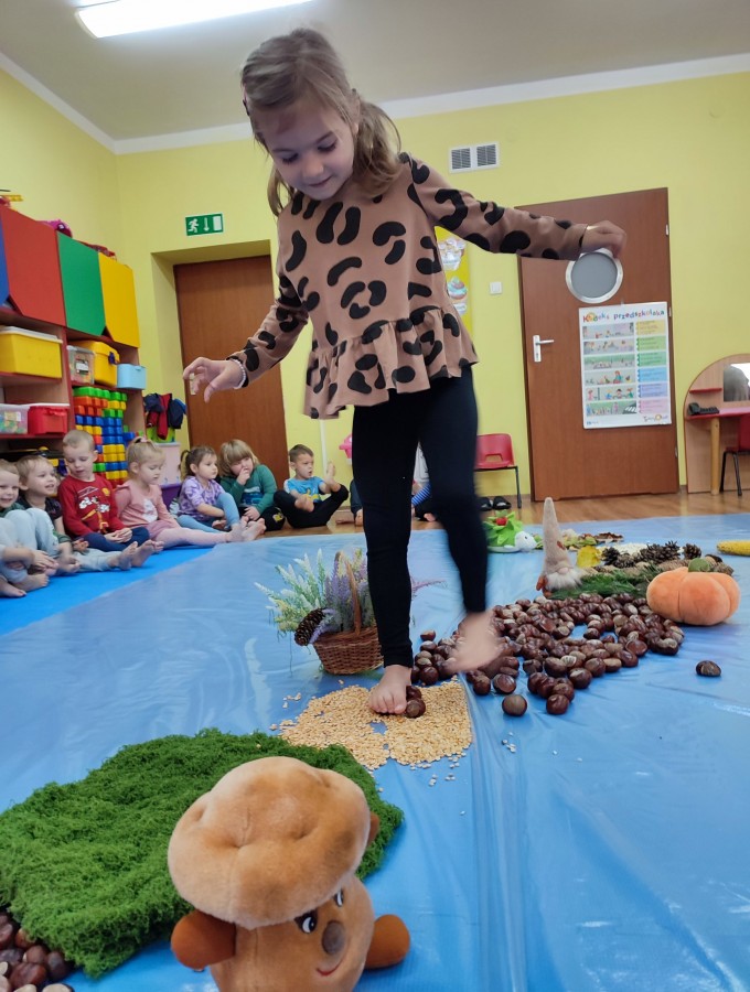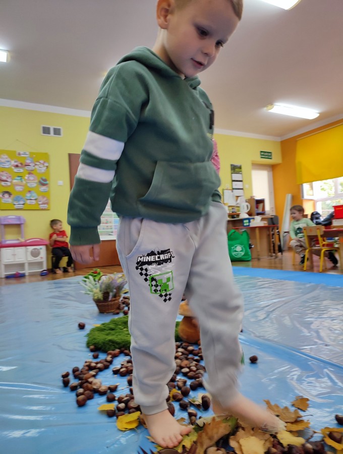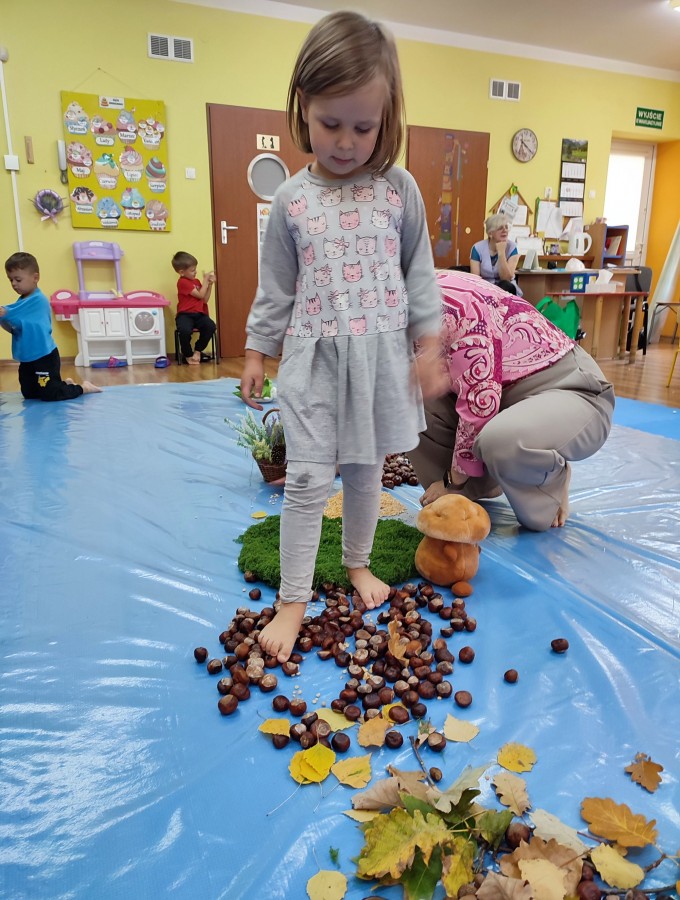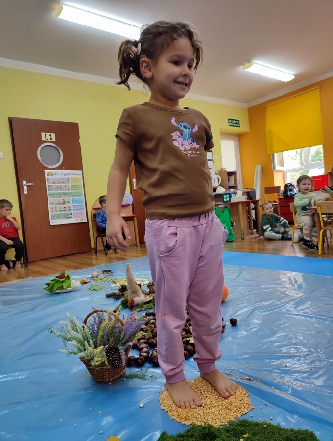 Przedszkolaki z grupy Krasnale postanowiły wykorzystać dary Pani Jesieni i stworzyć jesienną ścieżkę sensoryczną. Została ona utworzona z liści, igieł sosny, kasztanów, żołędzi, szyszek, ziaren gruchu, fasoli i patyków. Chodzenie po niej nie było łatwe. Taka ścieżka sensoryczna ma duże znaczenia dla dziecięcych stópek- usprawnia motorykę dużą, rozwija wrażenia dotykowe, poprawia koordynację ruchową i przede wszystkim stymuluje receptory. Spacer po wyznaczonej trasie sprawił dzieciom mnóstwo radości i satysfakcji. Z pewnością kiedyś ją powtórzymy.