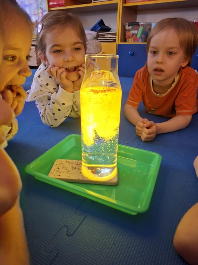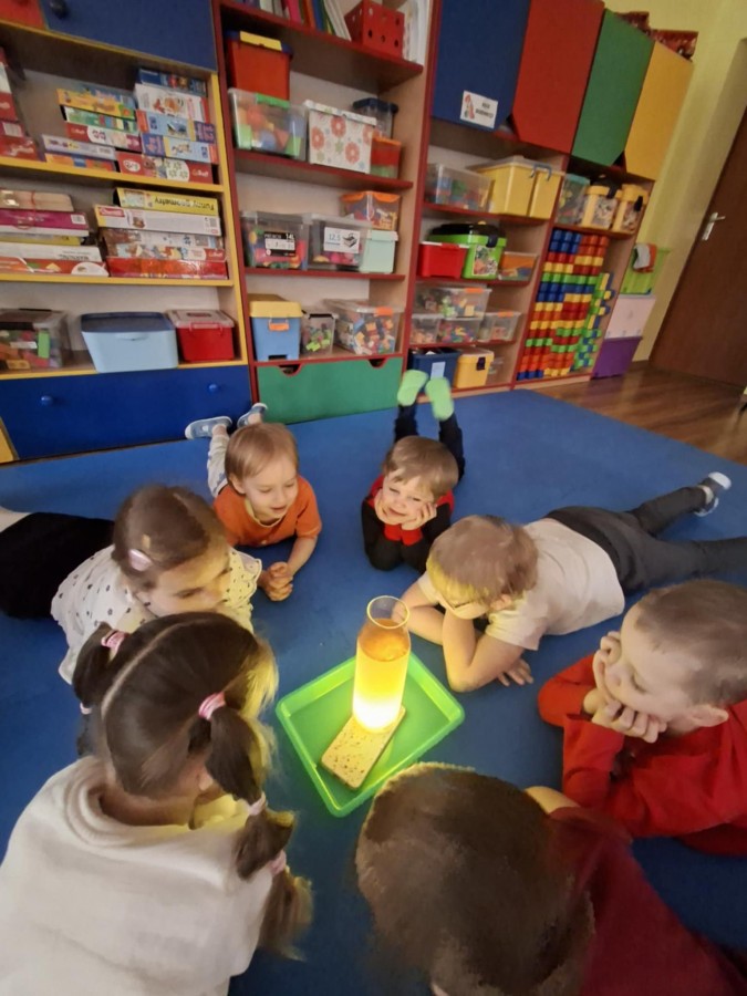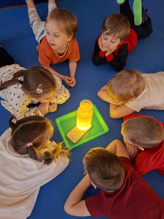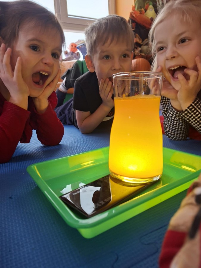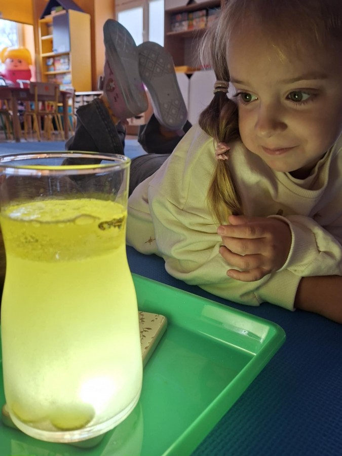Podczas zajęć przedszkolaki zastanawiały się, czym właściwie jest zdziwienie, w jakich sytuacjach pojawia się w codziennym życiu oraz jak może wyglądać na twarzy. Dzieci brały udział w zabawach sensorycznych i ruchowych, dzięki którym mogły doświadczyć tej emocji w praktyce. Wspólnie tworzyły również krótkie scenki i odgrywały sytuacje, w których pojawia się zaskoczenie lub zdumienie. Dzieci mogły doświadczyć zdziwienia podczas obserwacji eksperymentów i zabaw badawczych. Na koniec zajęć przedszkolaki uzupełniły książeczkę projektową.