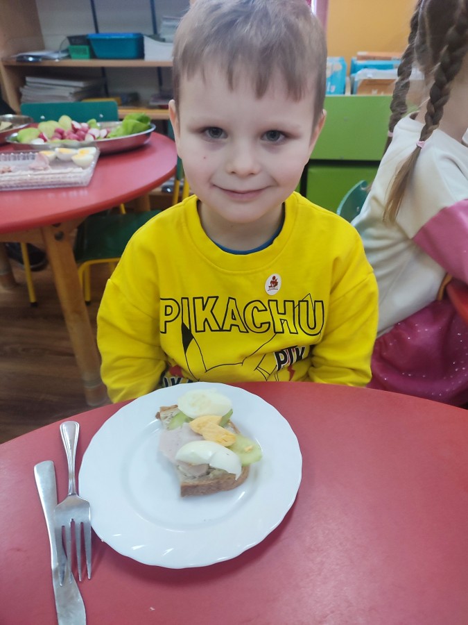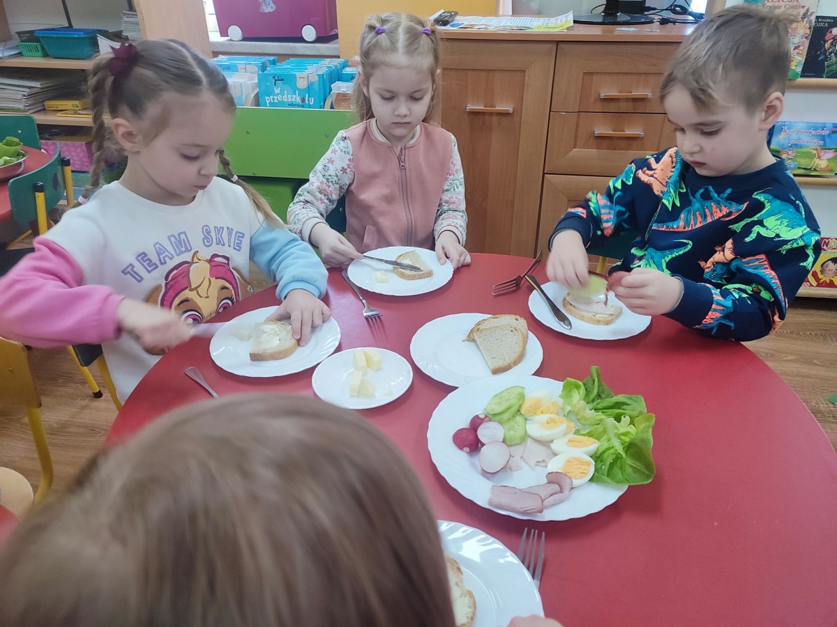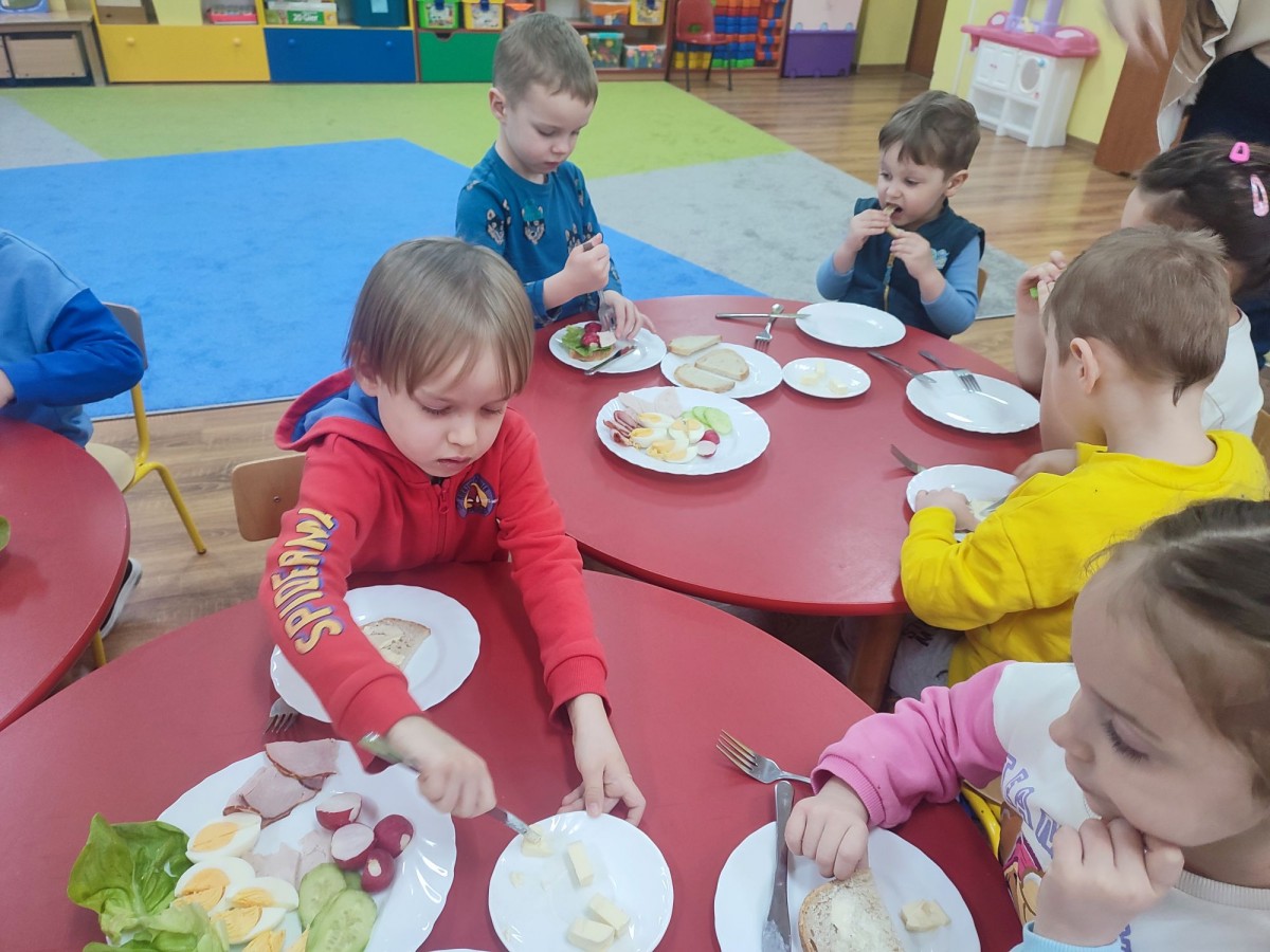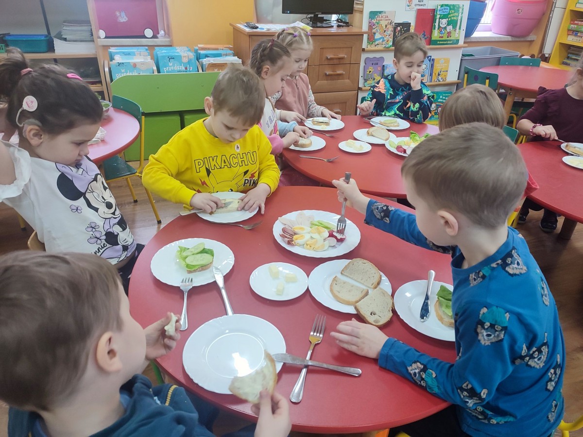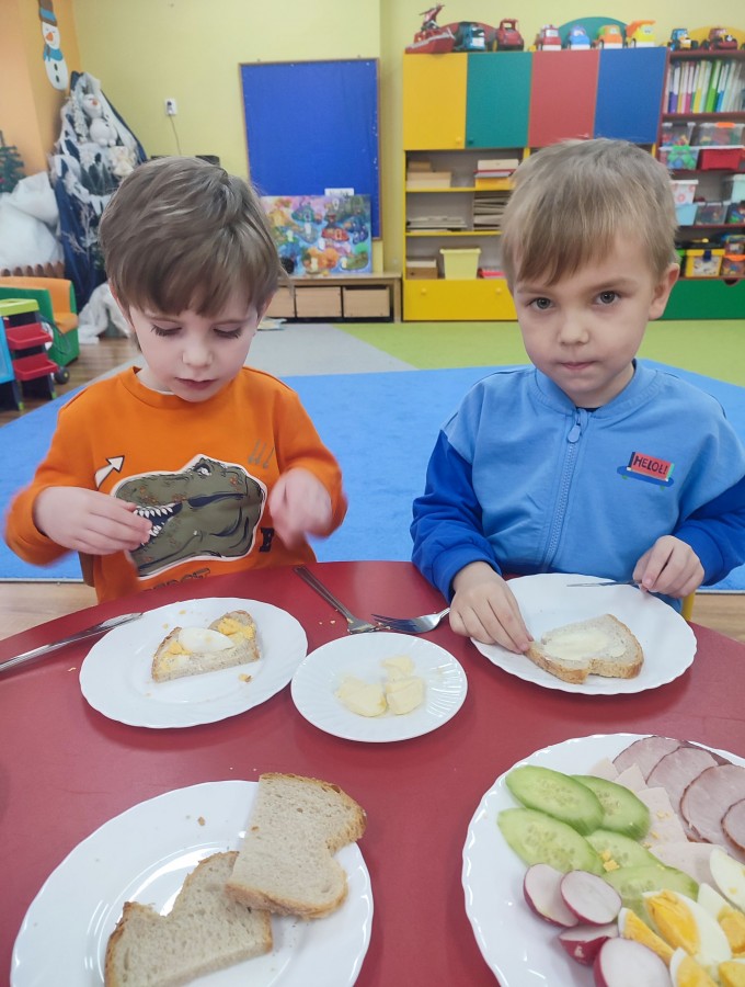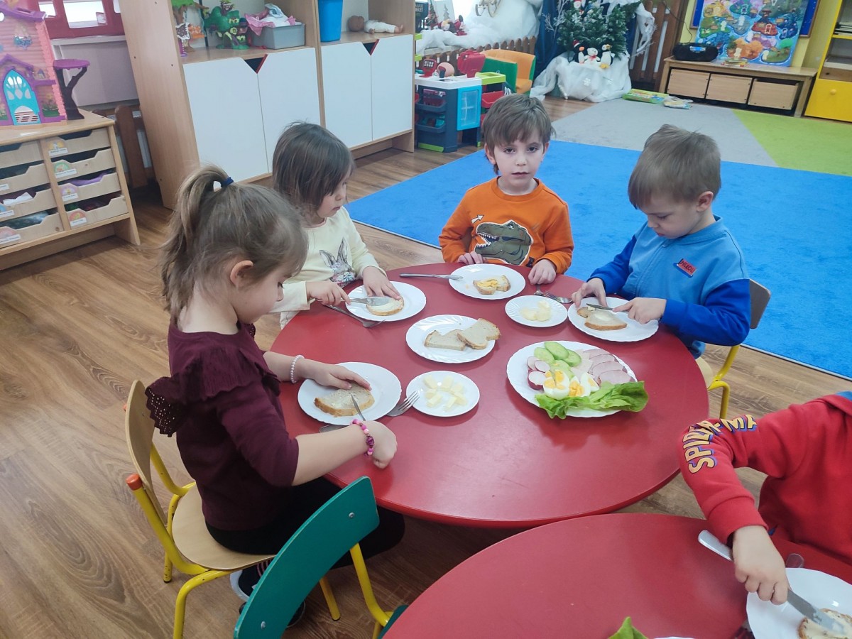 6 lutego dzieci z grupy "Krasnale" miały wyjątkową okazję, by samodzielnie przygotować sobie śniadanko. Na stolikach pojawiły się produkty, z których każdy mógł skomponować własny, zdrowy posiłek. Przedszkolaki z zaangażowaniem smarowały pieczywo, wybierały ulubione dodatki i tworzyły kolorowe kanapki. Była to nie tylko świetna zabawa, ale także doskonała okazja do rozwijania samodzielności, sprawności manualnej oraz zdrowych nawyków żywieniowych. Dzieci z dumą prezentowały swoje śniadaniowe kompozycje i z apetytem je zajadały.