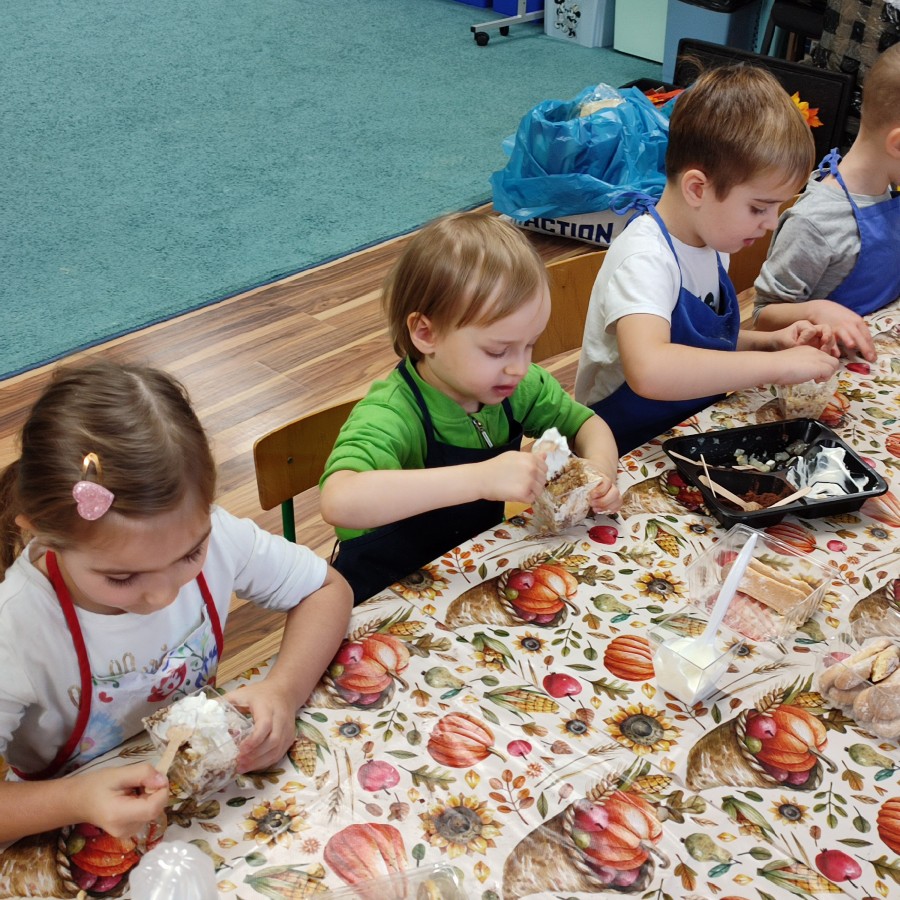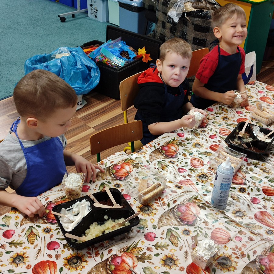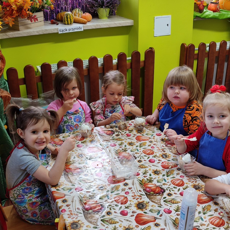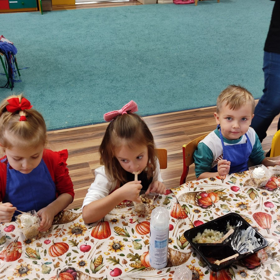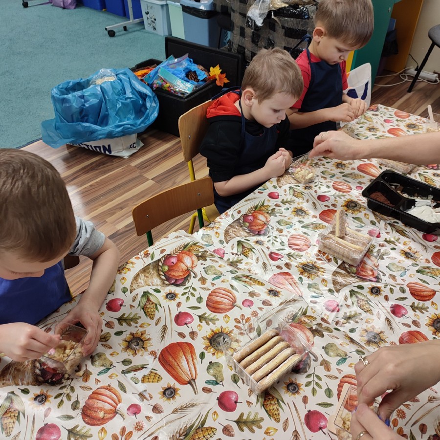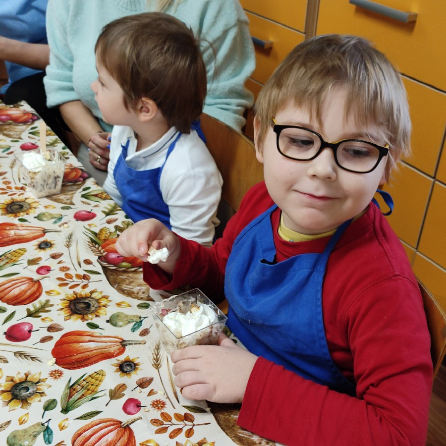 19 listopada w naszym przedszkolu odbyły się wyjątkowe warsztaty z firmą Akademia Małego Kuchcika. Tego dnia wszystkie dzieci wzięły udział w zajęciach kulinarnych, podczas których przygotowywały pyszne, jesienne tiramisu. Mali kucharze z ogromnym zaangażowaniem mieszali, dekorowali, a na końcu – oczywiście z apetytem – zajadali swoje słodkie dzieła.