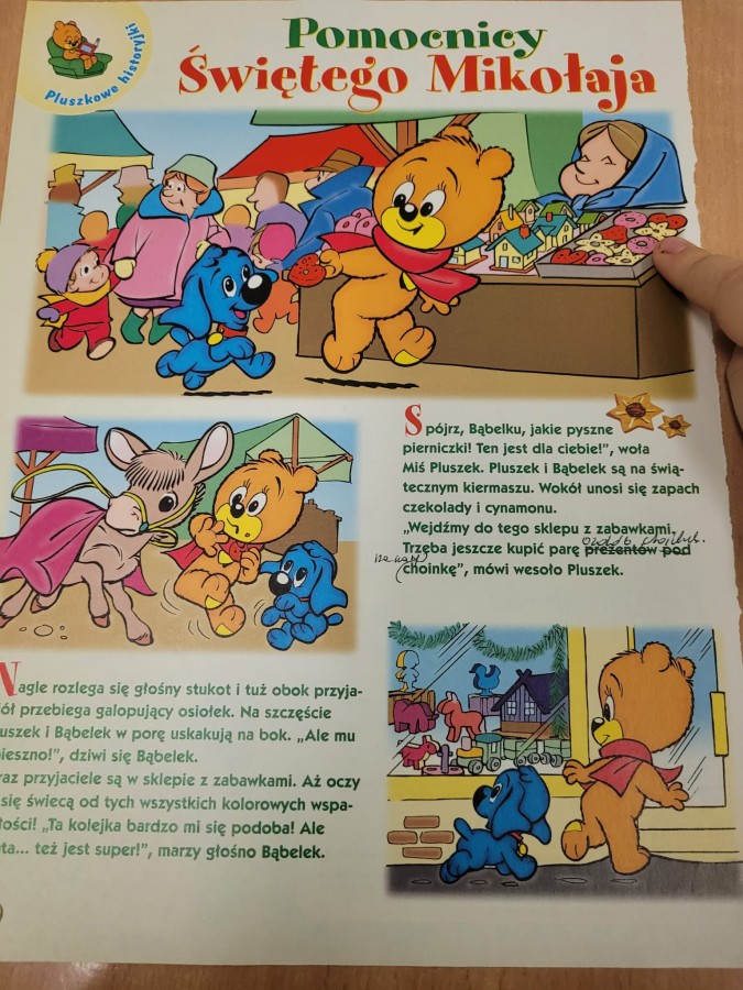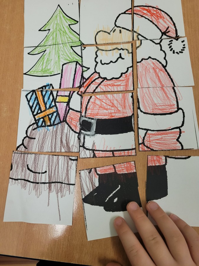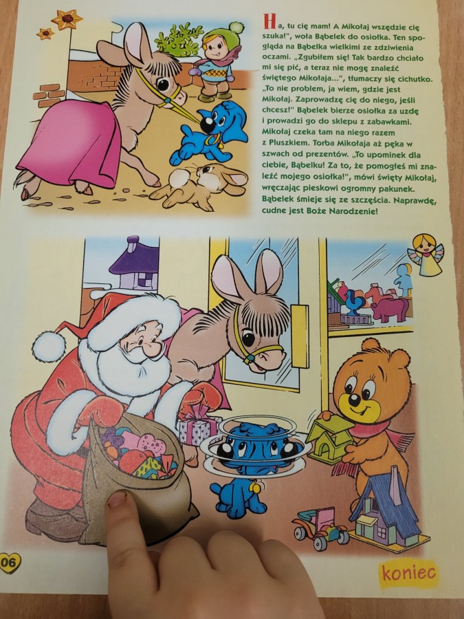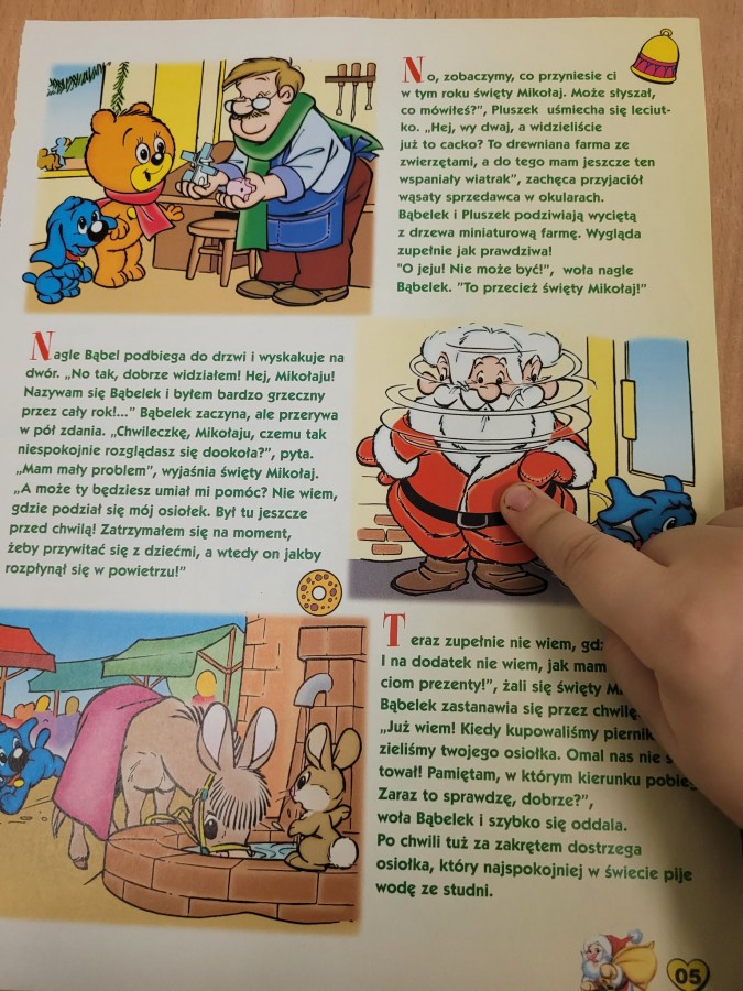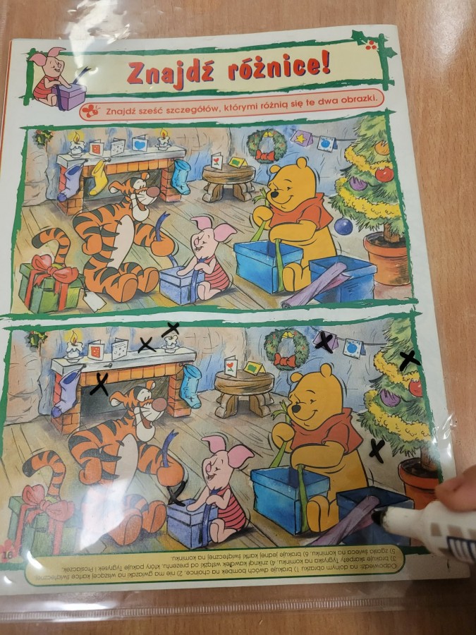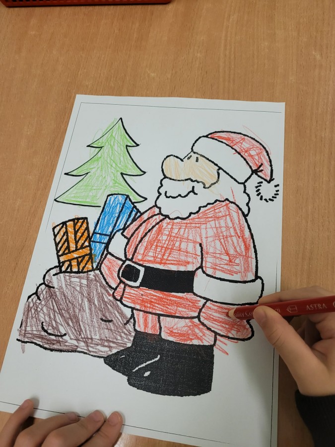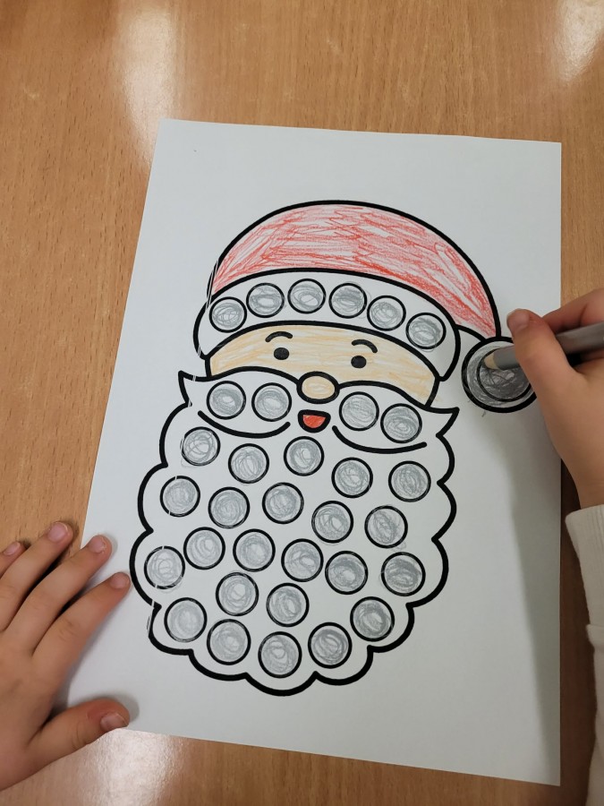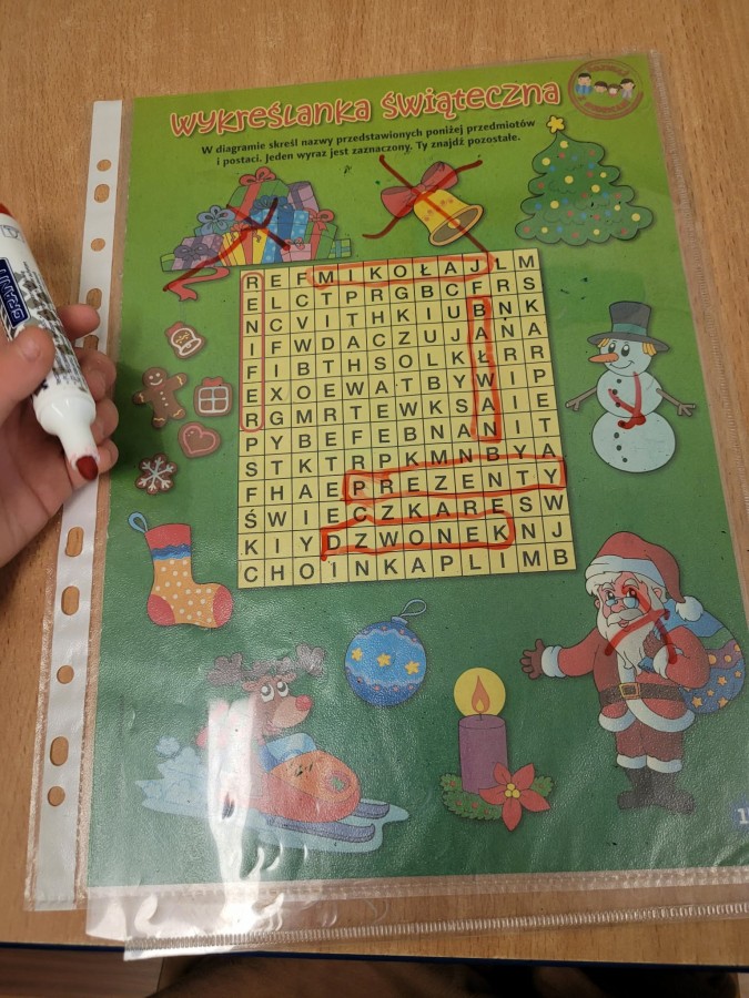 5 grudnia obchodziliśmy " Mikołajki". Dzieci słuchały opowiadania pt. "Pomocnicy Świętego Mikołaja". Analizowały jego treść i odpowiadały na pytania. Starsze dzieci samodzielnie interpretowały treść opowiadania i rozwiązywały wykreślankę. Wszyscy malowali Mikołaje i spostrzegali różnice na 2 pozornie identycznych obrazkach.