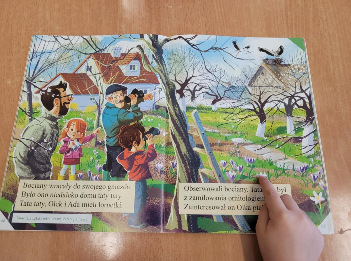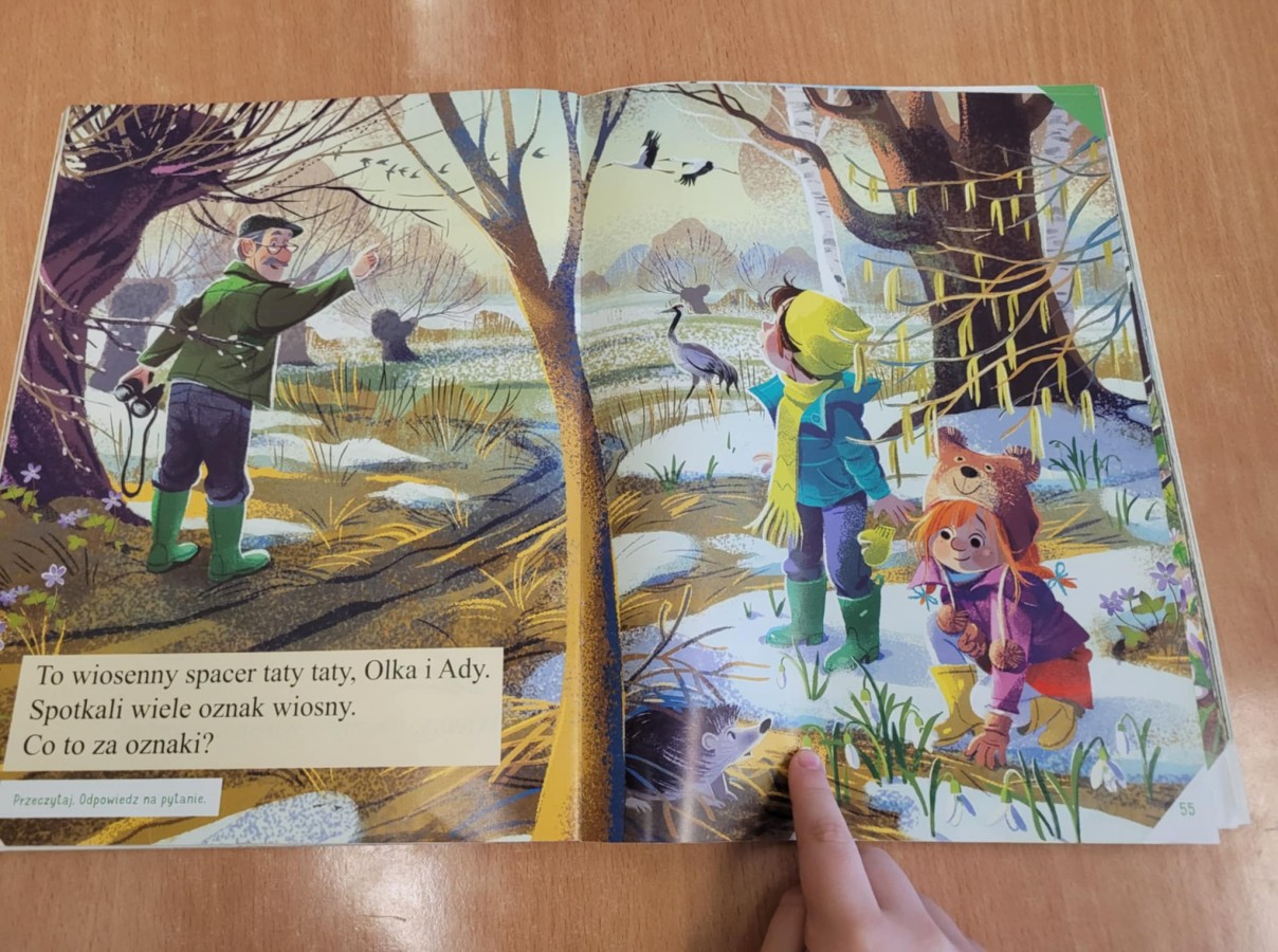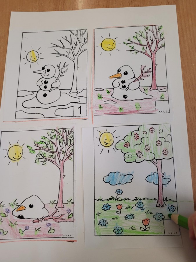 20 marca obchodziliśmy "Pierwszy dzień wiosny". Dzieci opowiadały treść ilustracji przedstawiających pierwsze oznaki wiosny. Układały historyjkę obrazkową przedstawiającą różne okresy wiosennego pejzażu.