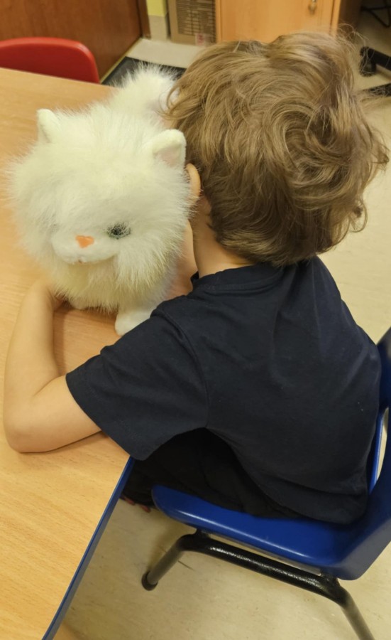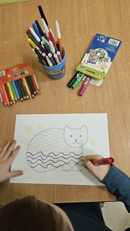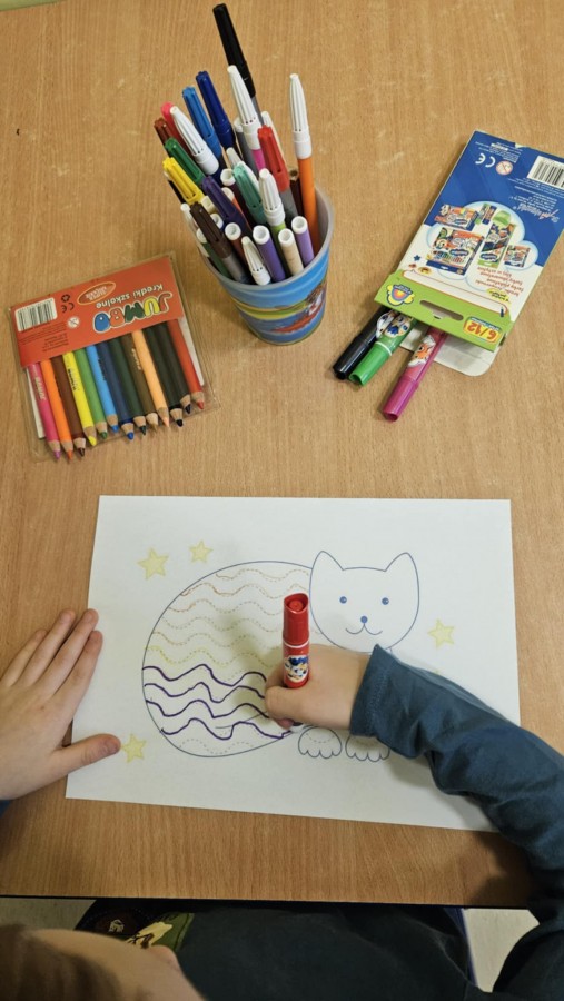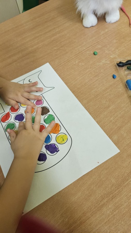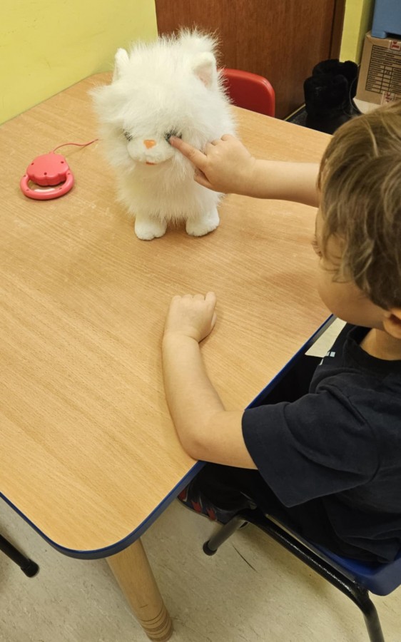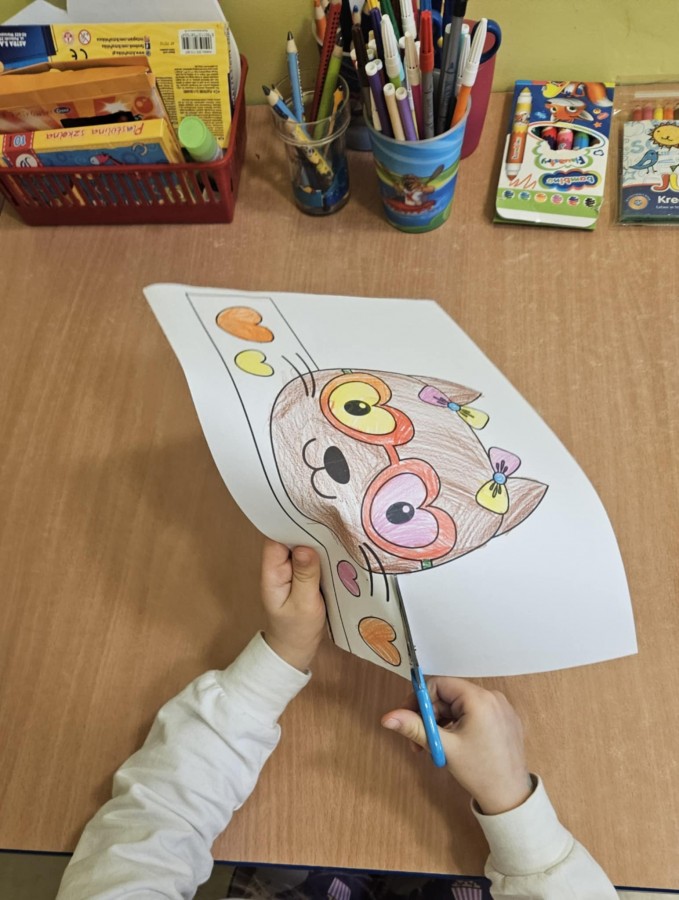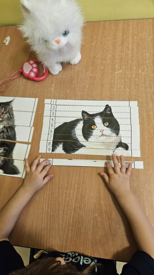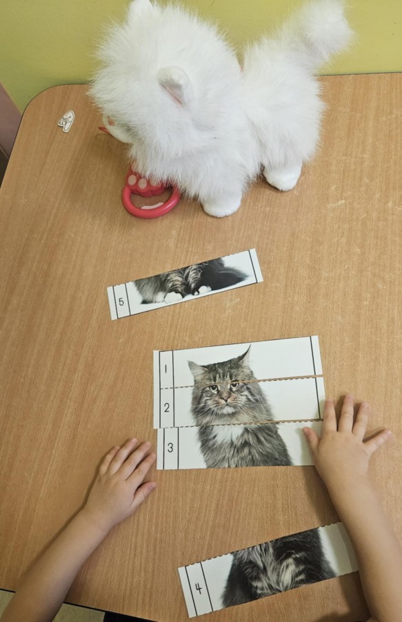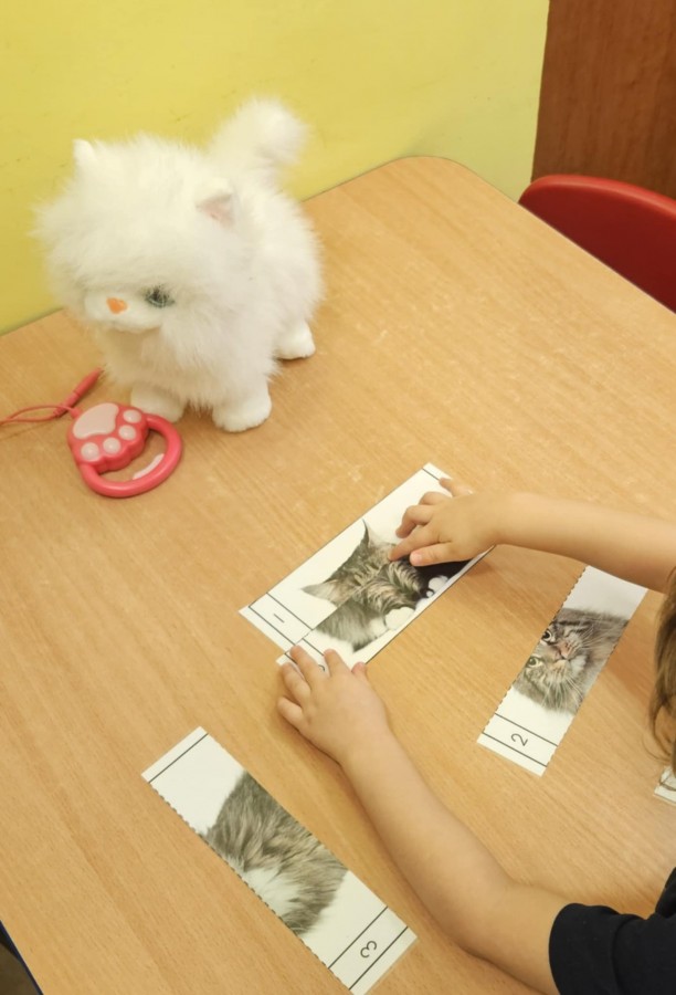17 lutego - Dzień Kota, więc do gabinetu pedagoga zawitał biały, puchaty gość. Spotkanie z nim było dla dzieci okazją do odbioru polisensorycznych wrażeń zmysłowych, utrwalenia orientacji w schemacie ciała oraz snucia opowieści związanych ze spotkań z kotami. Małe paluszki ugniatały, formowały plastelinę wypełniając nią wyznaczone pola. Starsze przedszkolaki doskonaliły koordynację wzrokowo - ruchową poprzez scalanie obrazków, wycinanie nożyczkami. Rysowały po śladzie, kolorowały. Dzieci były bardzo zadowolone ze spotkania z czworonożnym przyjacielem