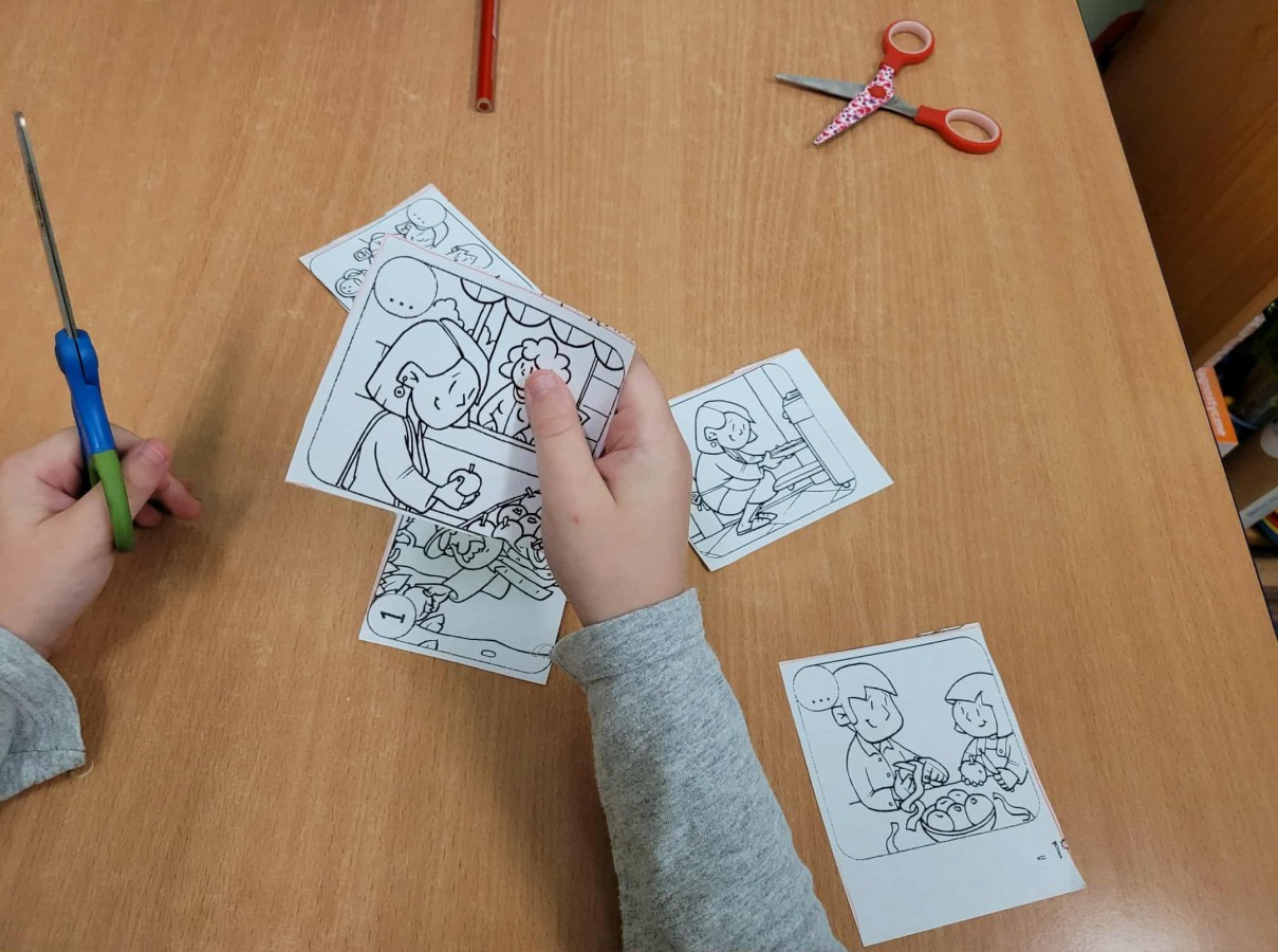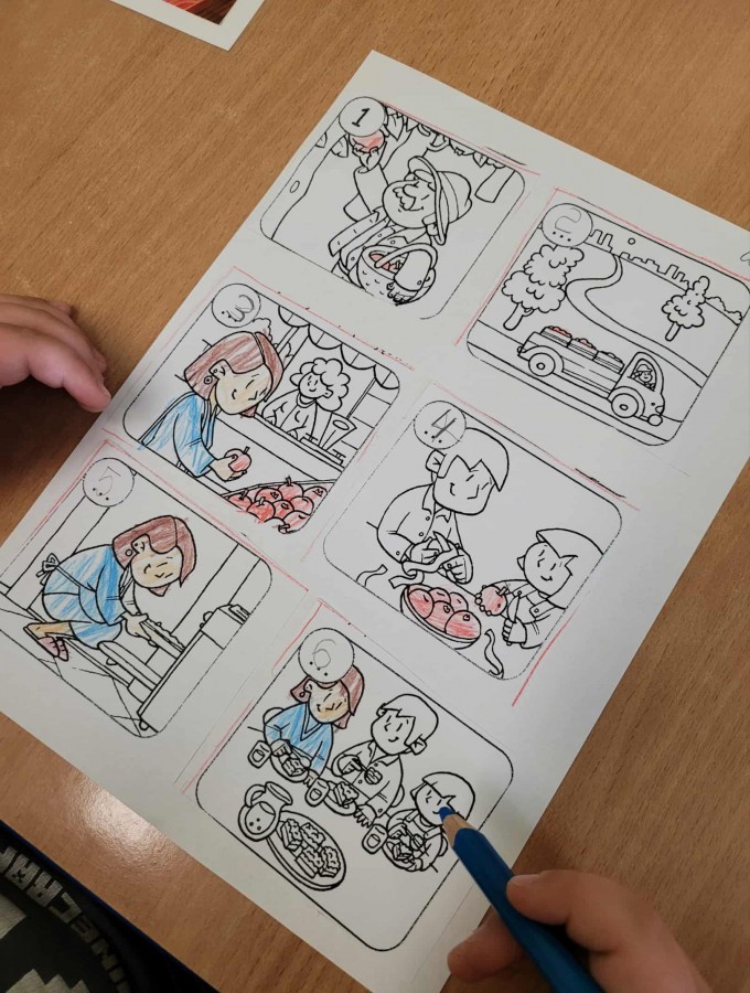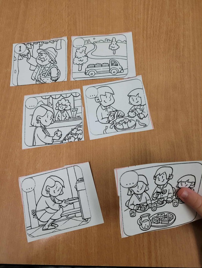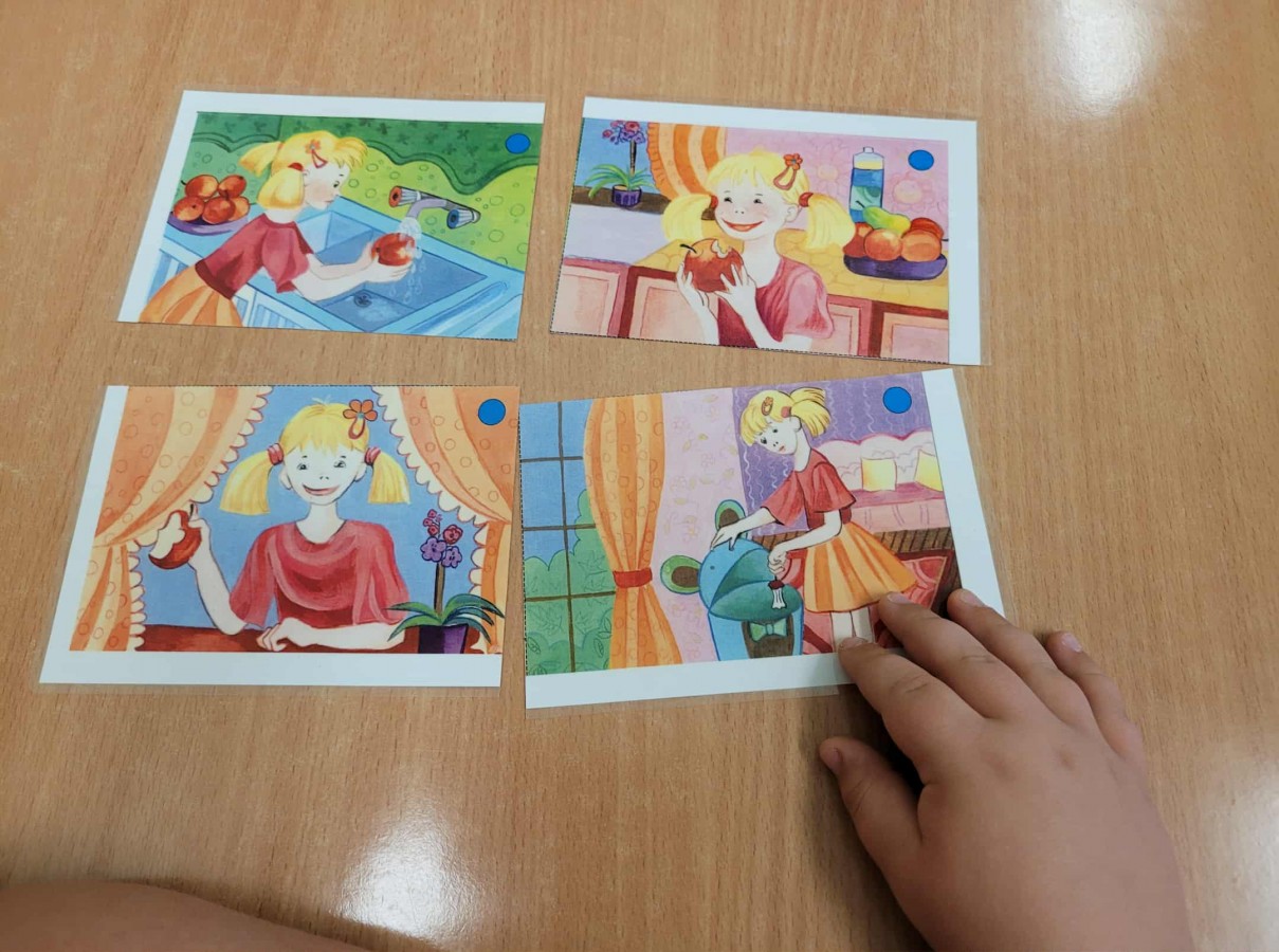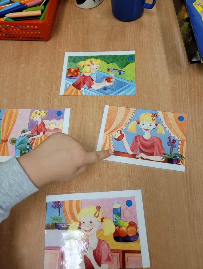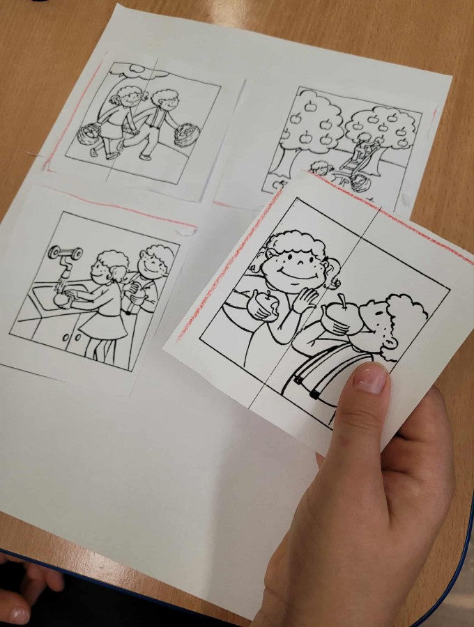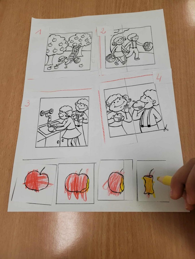 29 września obchodziliśmy "Dzień jabłka". Dzieci starsze układały historyjkę obrazkową pt. "Szarlotka", a dzieci młodsze historyjkę pt. " Zuzia i Piotruś jedzą jabłka". Dzieci rozwijały myślenie przyczynowo-skutkowe, budowały zdania poprawne gramatycznie i fleksyjnie, utrwalały liczebniki główne i porządkowe.