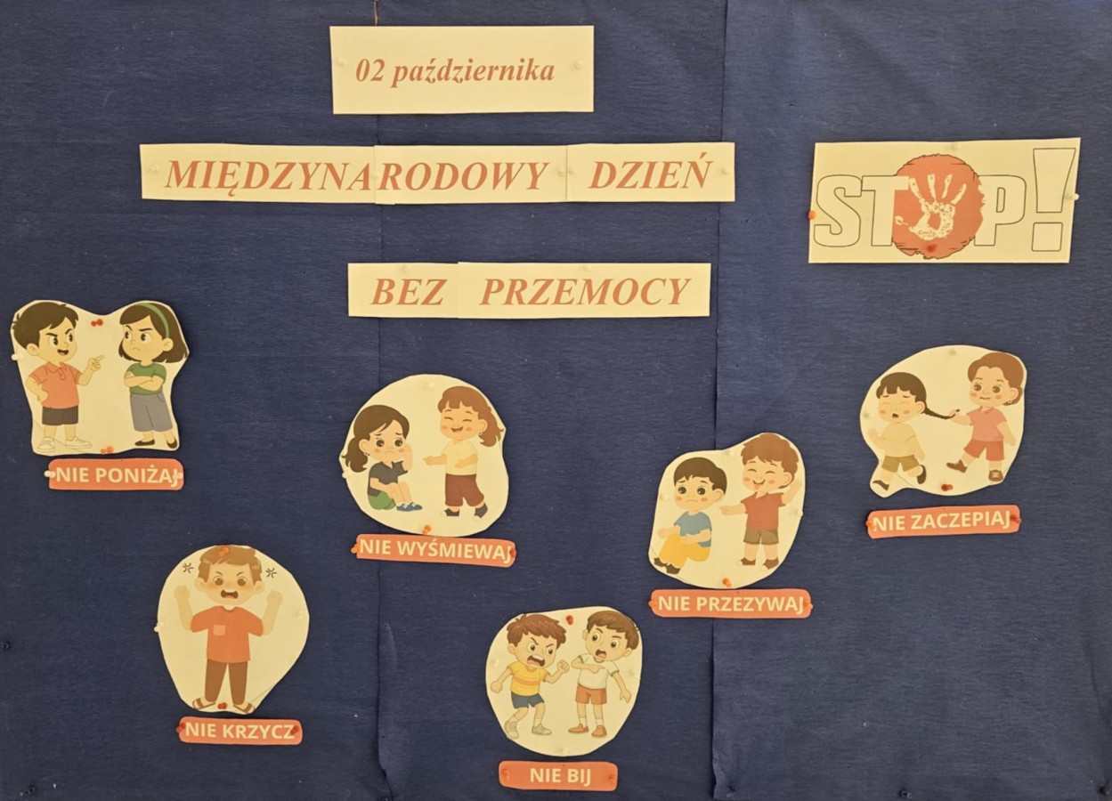 2 października, w Międzynarodowym Dniu Bez Przemocy, dzieci w naszym przedszkolu szczególnie dużo i intensywnie rozmawiały ze swoimi nauczycielami na temat prawidłowych zachowań, relacji społecznych. Przypominały o tym, czego nie należy robić, aby przebywać ze sobą w atmosferze radości, przyjaźni i szacunku każdego dnia, a nie tylko od święta.