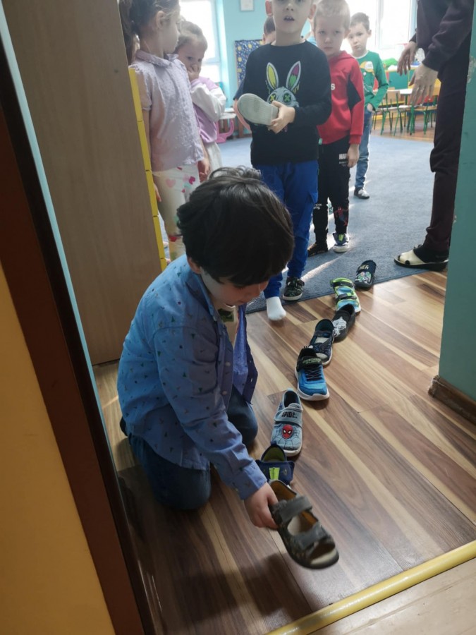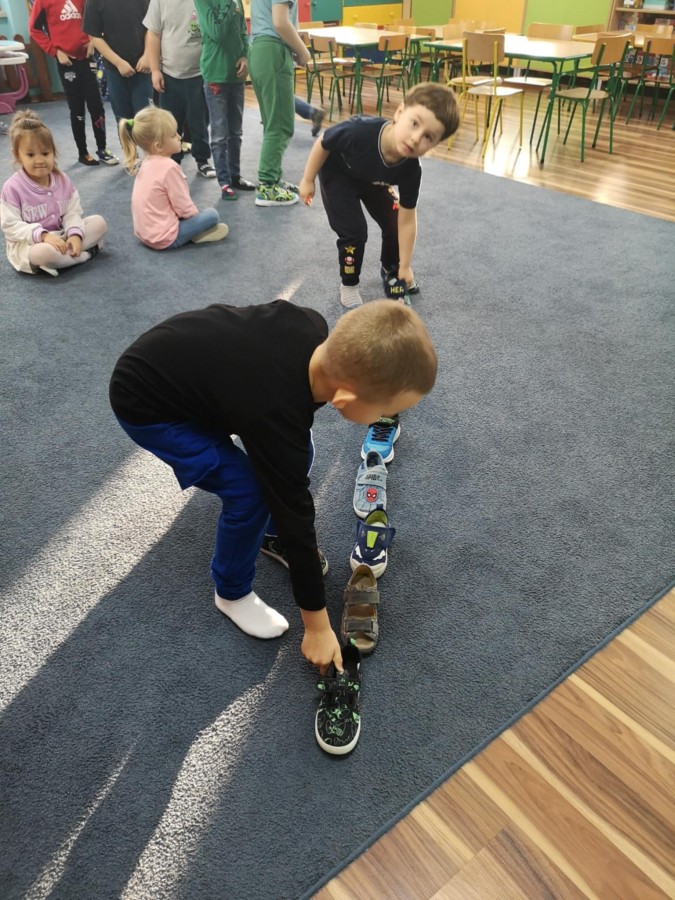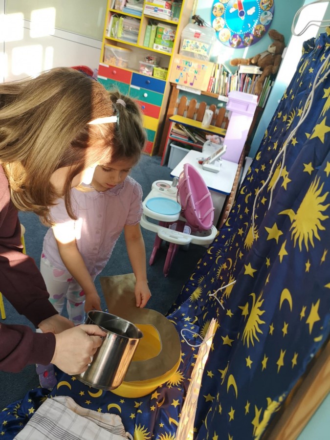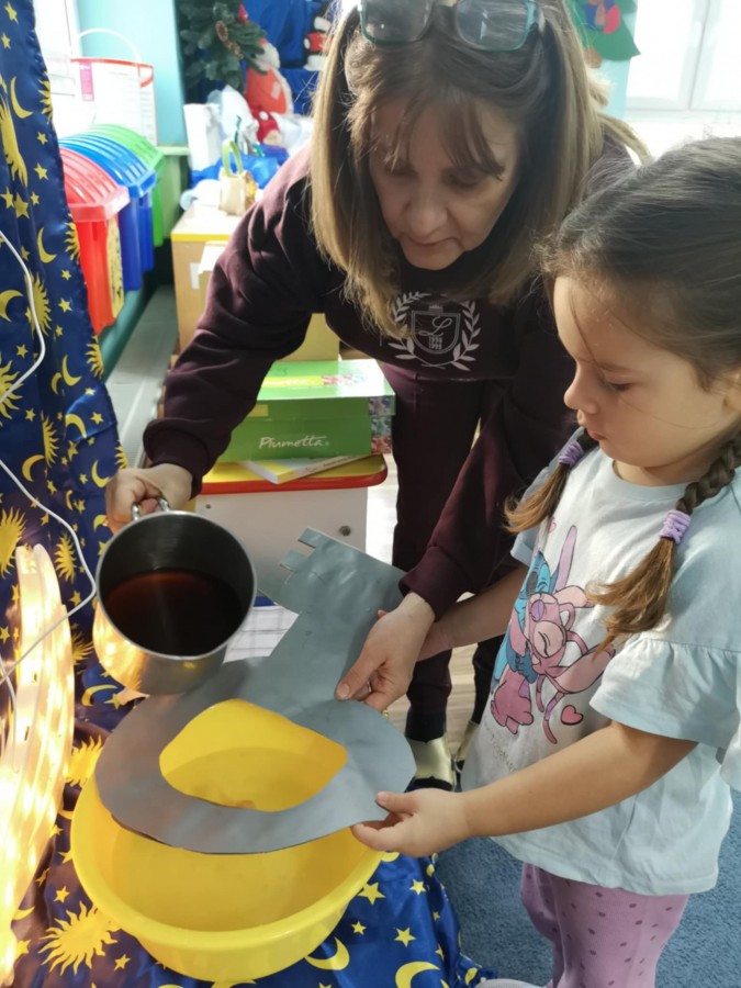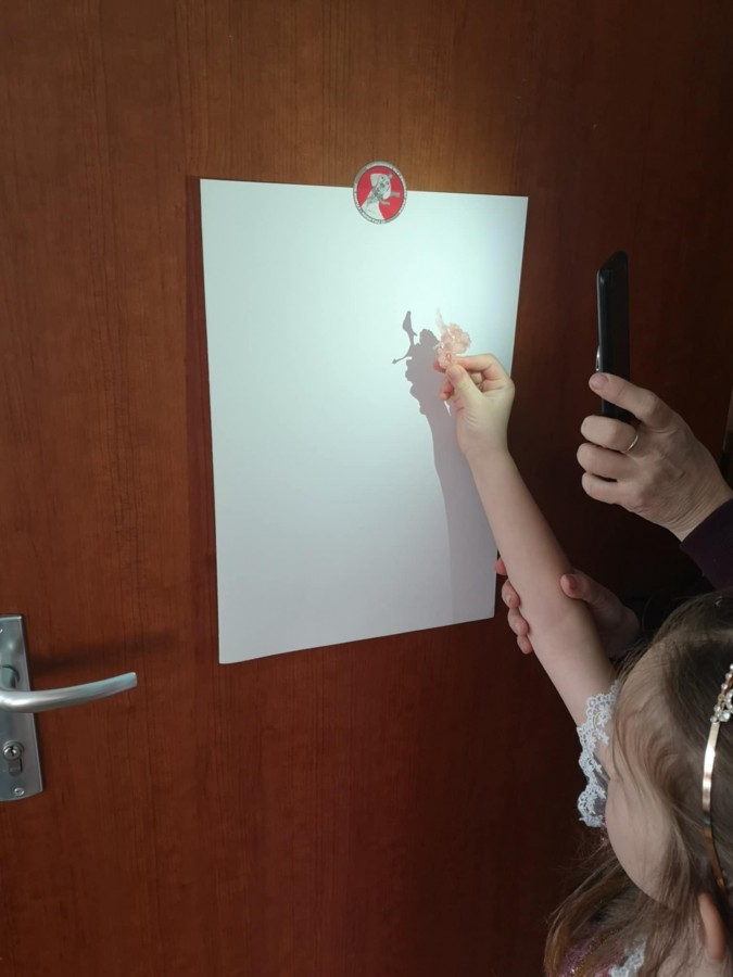 Dzieci uwielbiają wróżby andrzejkowe. Przygotowaliśmy min. wróżbę z butami , oraz Lanie wosku. Ta wróżba to też rodzaj eksperymentu, rozmowa o tym, dlaczego jeszcze przed chwilą płynny wosk, tak szybko zastyga w zimnej wodzie. Najpierw dzieci zgadywały , co widać i z czym kojarzy się kształt. Potem dopiero bawiły się w teatr cieni i odgadywały kształty pojawiające się na ścianie przy zgaszonym świetle i zapalonej lampce.