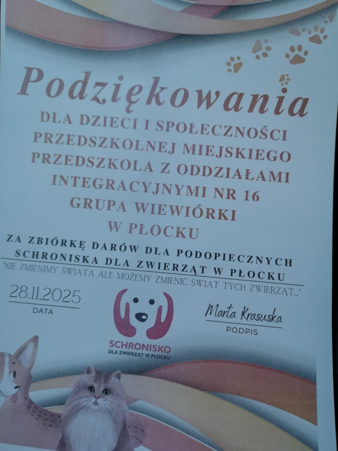 W imieniu podopiecznych Schroniska dla zwierząt w Płocku dziękujemy Rodzicom dzieci z grupy Wiewiórek za włączenie się do zbiórki darów dla zwierząt.