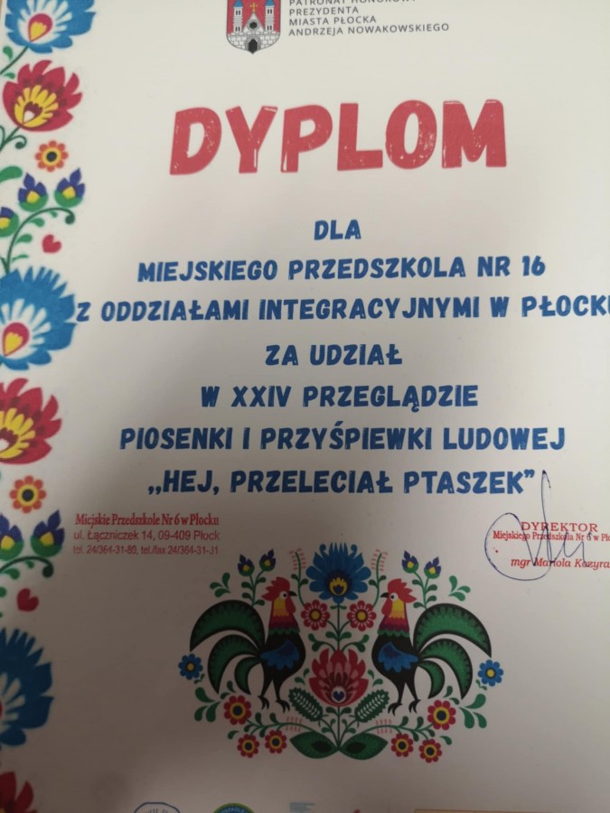 26 marca Zuzia, Julia i Patrycja reprezentowały nasze przedszkole w XXIV Przeglądzie Piosenki i Przyśpiewki Ludowej „ Hej przeleciał Ptaszek” , którego organizatorem było miejskie Przedszkole nr 6 W Płocku.