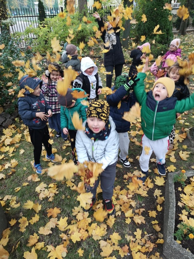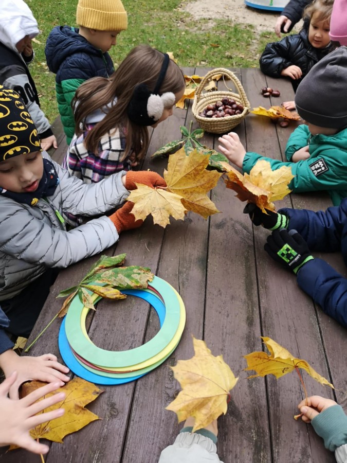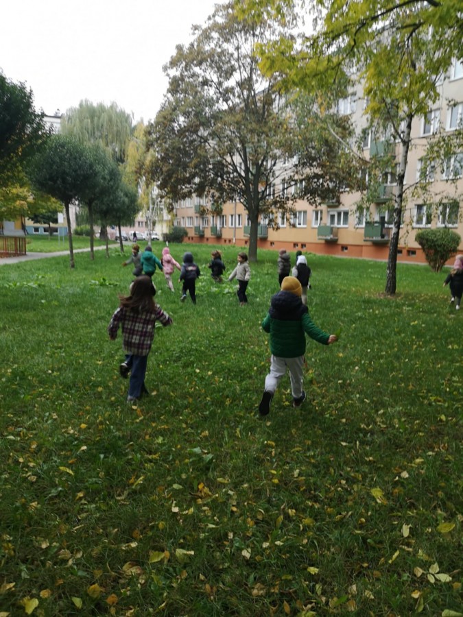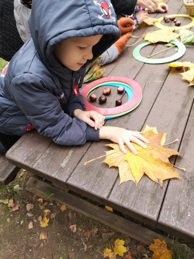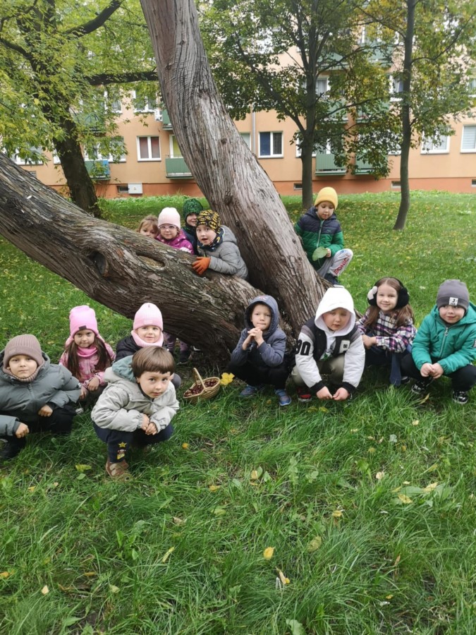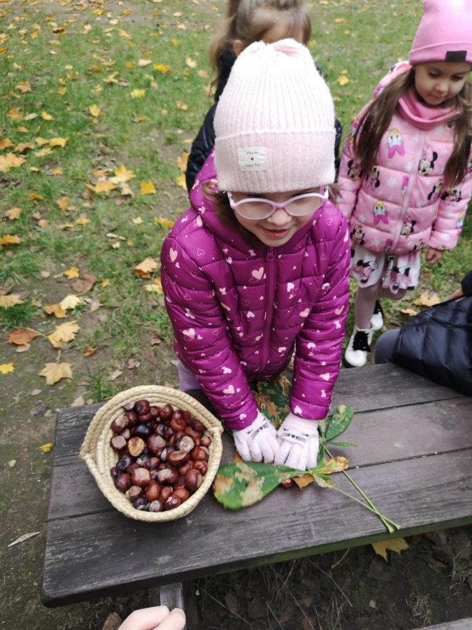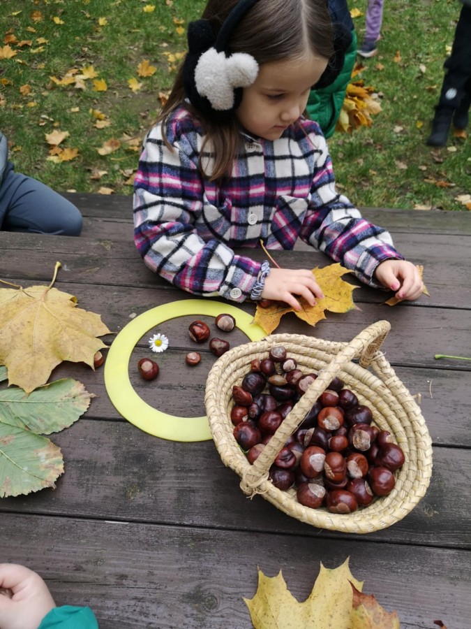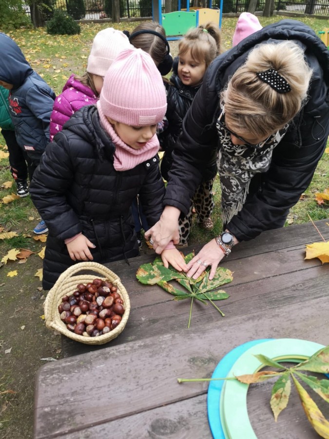 Matematyka w plenerze- podczas jesiennego spaceru dzieci poznawały drzewa liściaste oraz podziwiały najstarsze i największe okazy rosnące w naszej okolicy. Z zaangażowaniem zbierały kolorowe liście, kasztany. Już w ogrodzie bawiły się w „ Znikające kasztany”, przeliczały, zasłaniały je liśćmi i dotykiem odgadywały ich liczbę. Zajęcia odbywały się w ramach realizacji Ogólnopolskiego Projektu Edukacyjnego „ Kreatywna matematyka”. Takie zajęcia matematyczne w ogrodzie bardzo dzieciom się podobały, na pewno je powtórzymy.
