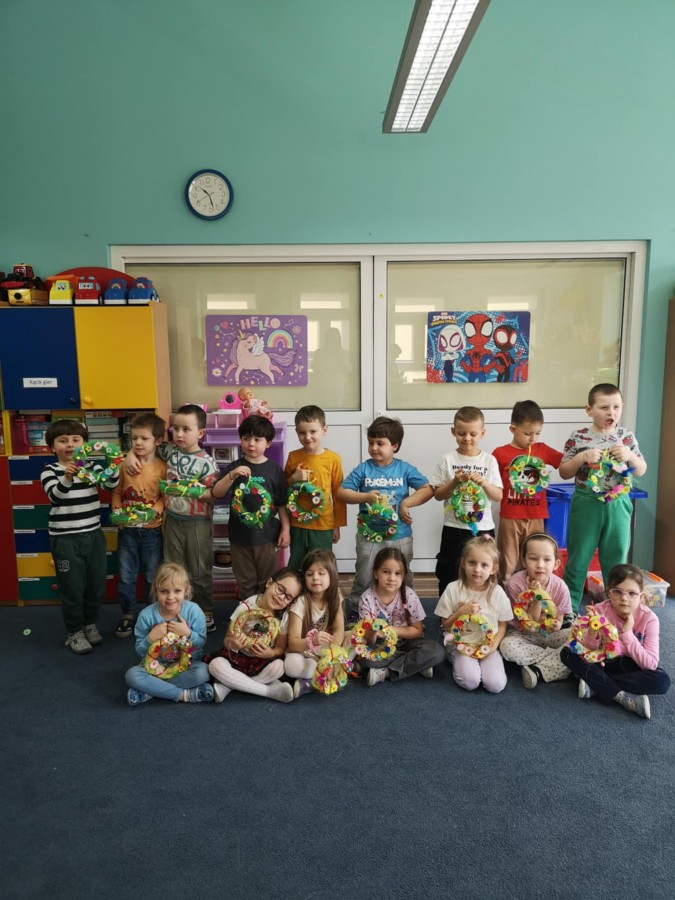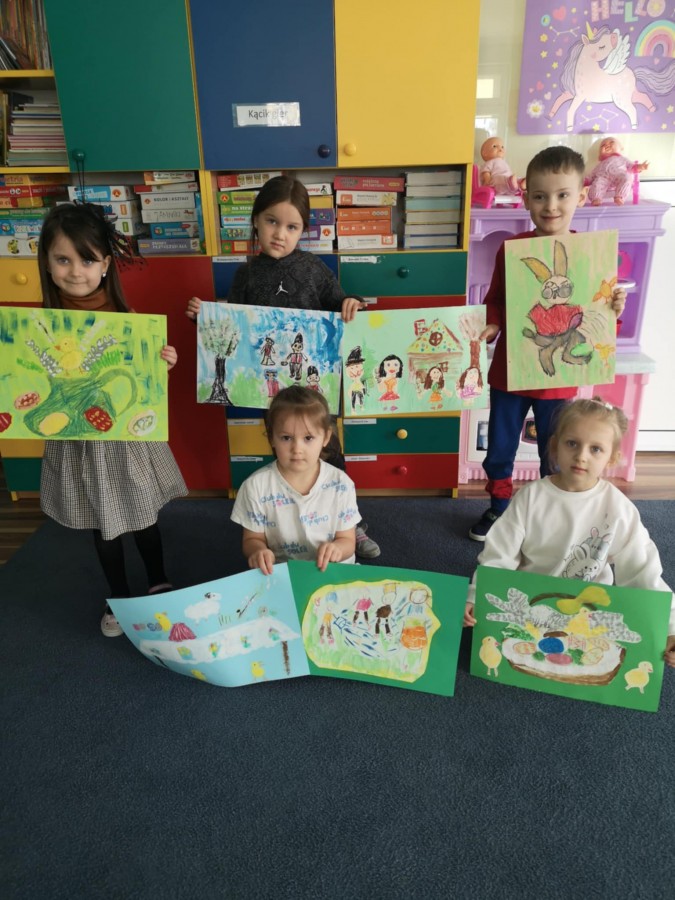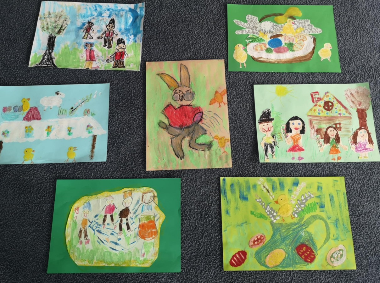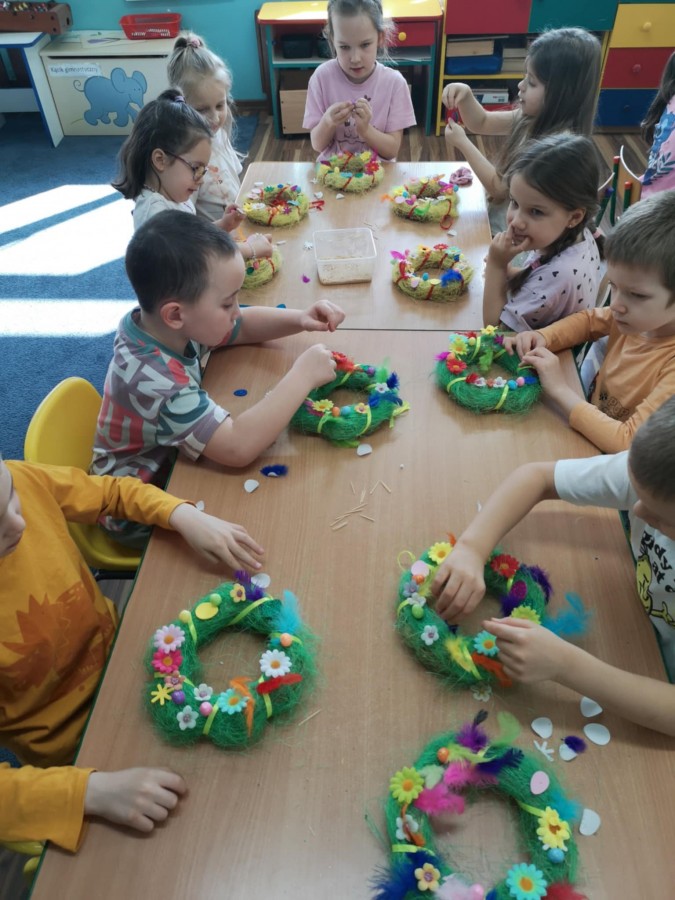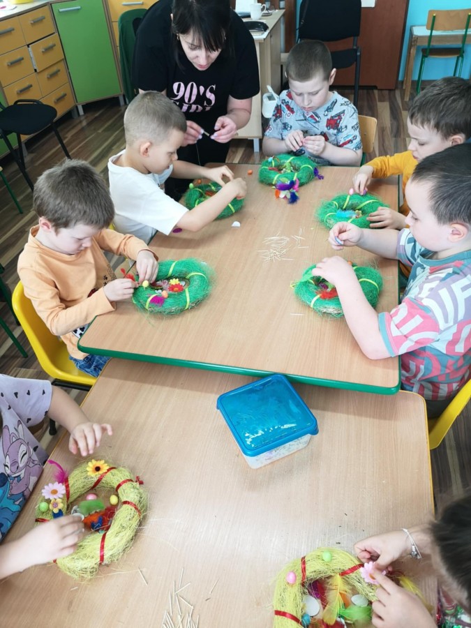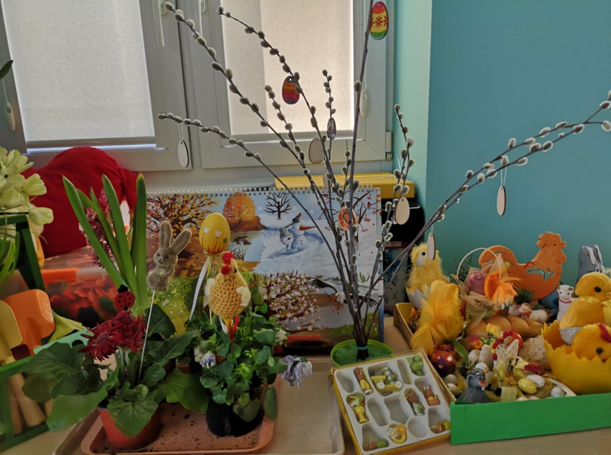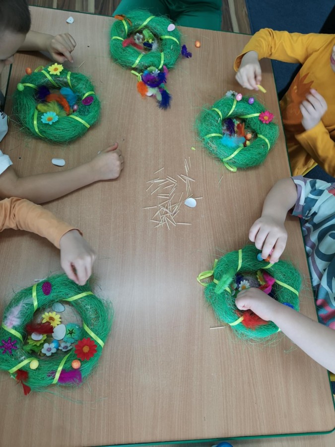 Święta Wielkanocne w przedszkolu to czas nauki tradycji poprzez dekorację sali, zabawę, warsztaty plastyczne i uczestnictwo w konkursach plastycznych o tematyce świątecznej. Z tej okazji dzieci z grupy Wiewiórki wzięły czynny udział w Warsztatach artystycznych „ Świąteczne Wianki”, organizowanych przez Studio MIMADO. Dzieci wzięły również udział w XXIV Ogólnopolskim Konkursie plastycznym „ Tradycje Wielkanocne” 2026r.
