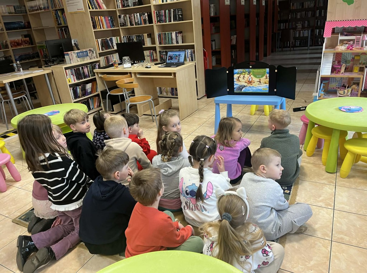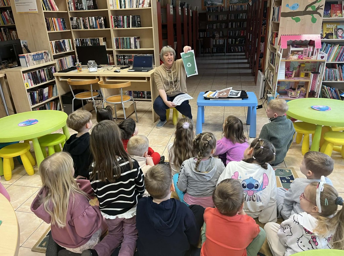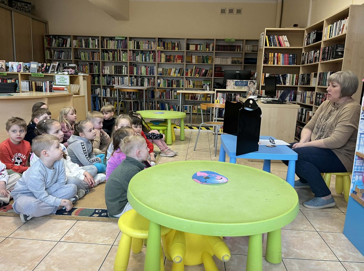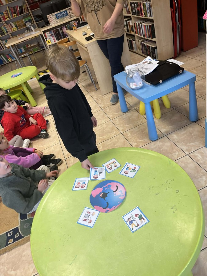 W dniu 15 kwietnia dzieci z gr Zające były na zajęciach w bibliotece. Miały okazję obejrzeć teatrzyk kamishibai o tematyce ekologicznej. Za pomocą metody burzy mózgów podawały propozycje w jaki sposób należy się zachowywać żeby dbać o planetę. Na koniec dzieci wykonały wspólną pracę plastyczną typu puzzle adekwatną do omawianych zagadnień.