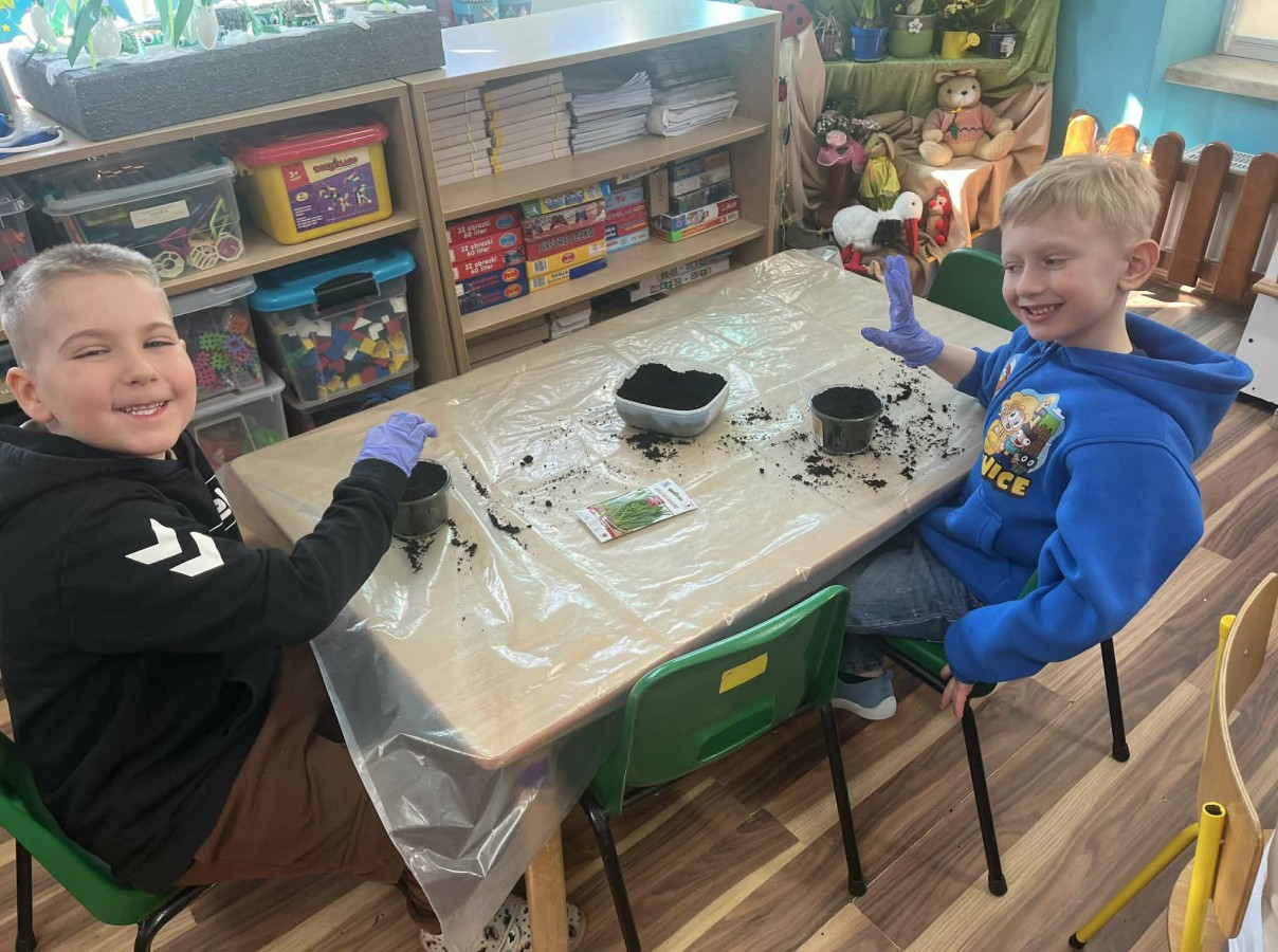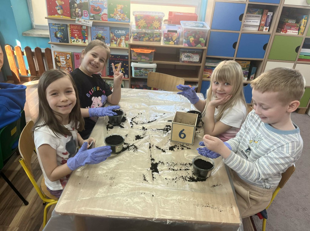 Wiosna to czas kiedy dzieci mogą zakładać w sali zielone ogródki, czyli pod okiem nauczyciela sadzić/siać rośliny, a potem o nie dbać i obserwować jak rosną. Tak też w piątek 27 marca 2026r grupa IV "Zające " własnoręcznie wykonała takie prace. Dzieci przygotowały doniczki z ziemią i zasiały różne nasiona. Będą mogły obserwować ich wzrost dbać o nie i cieszyć się pięknem mini ogródka w sali. Uczy to dzieci szacunku do przyrody, obowiązkowości, cierpliwości i jest bardzo wychowawcze.